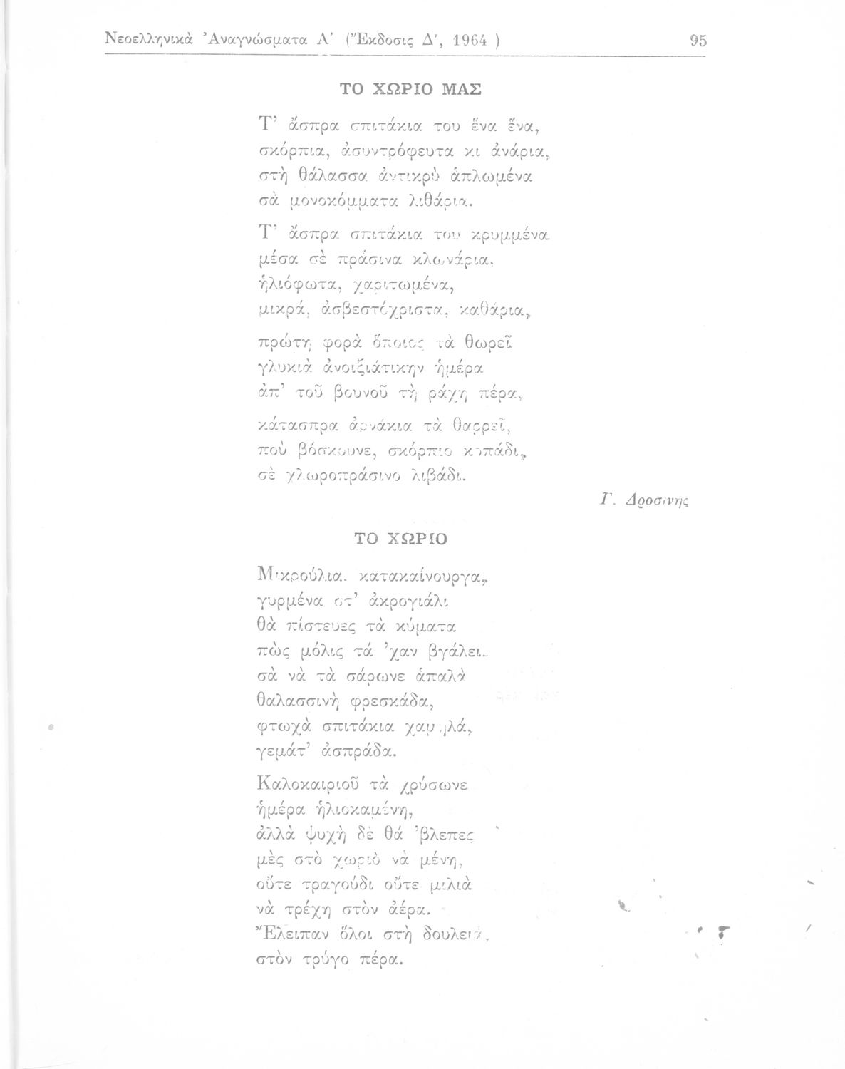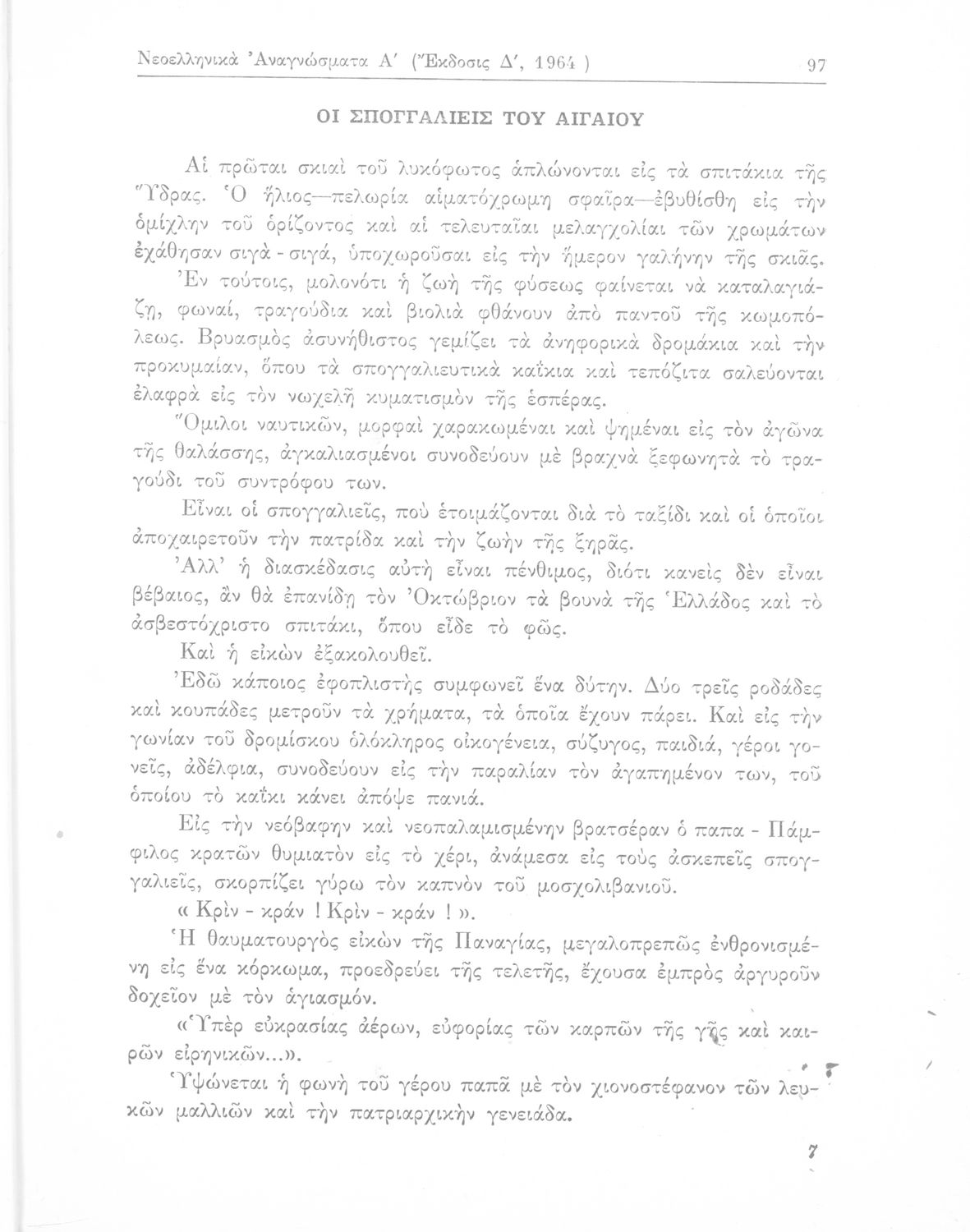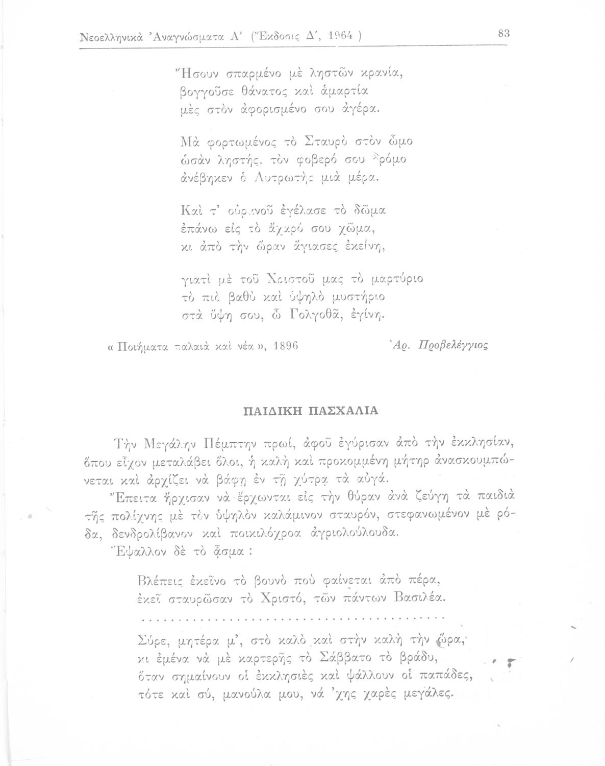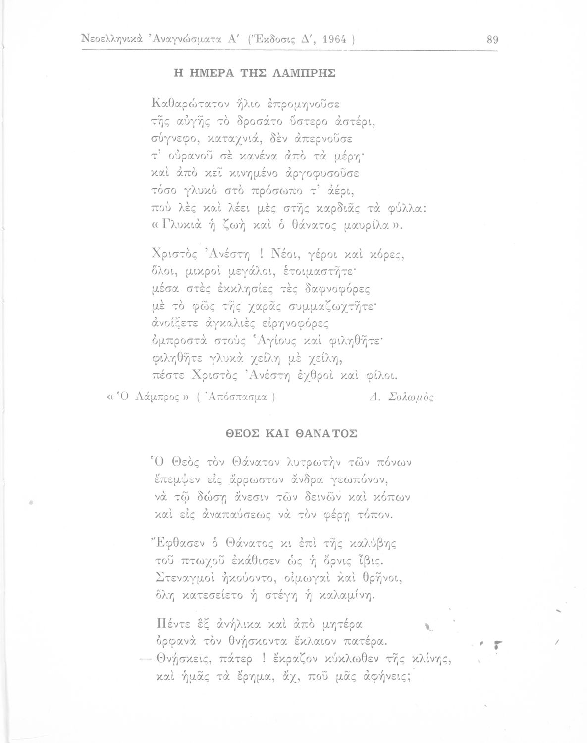 Σχολικό εγχειρίδιο Νέων Ελληνικών Γ΄ Γυμνασίου και Α' Αστικού Σχολείου που περιέχει πεζά και ποιήματα Ελλήνων συγγραφέων εμπνευσμένα από τη θρησκευτική και κοινωνική ζωή, την ελληνική μυθολογία, την αρχαία και
