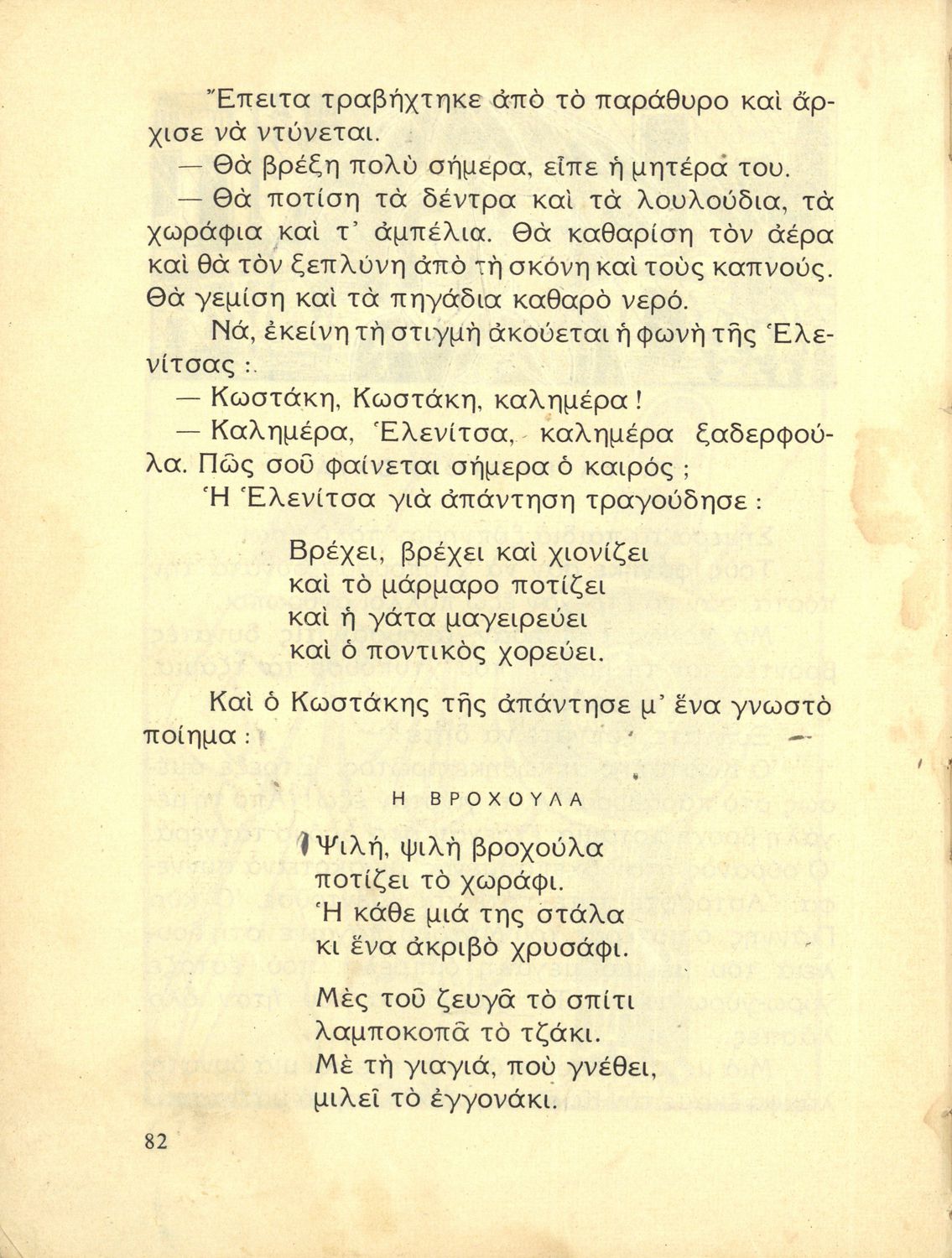 Αναγνωστικό Δ' Δημοτικού που είναι χωρισμένο σύμφωνα με τις εποχές του χρόνου και περιλαμβάνει ποιήματα και πεζά εμπνευσμένα από τη ζωή στην ύπαιθρο, την εθνική, οικογενειακή και κοινωνική ζωή, τη θρησκευτική ...