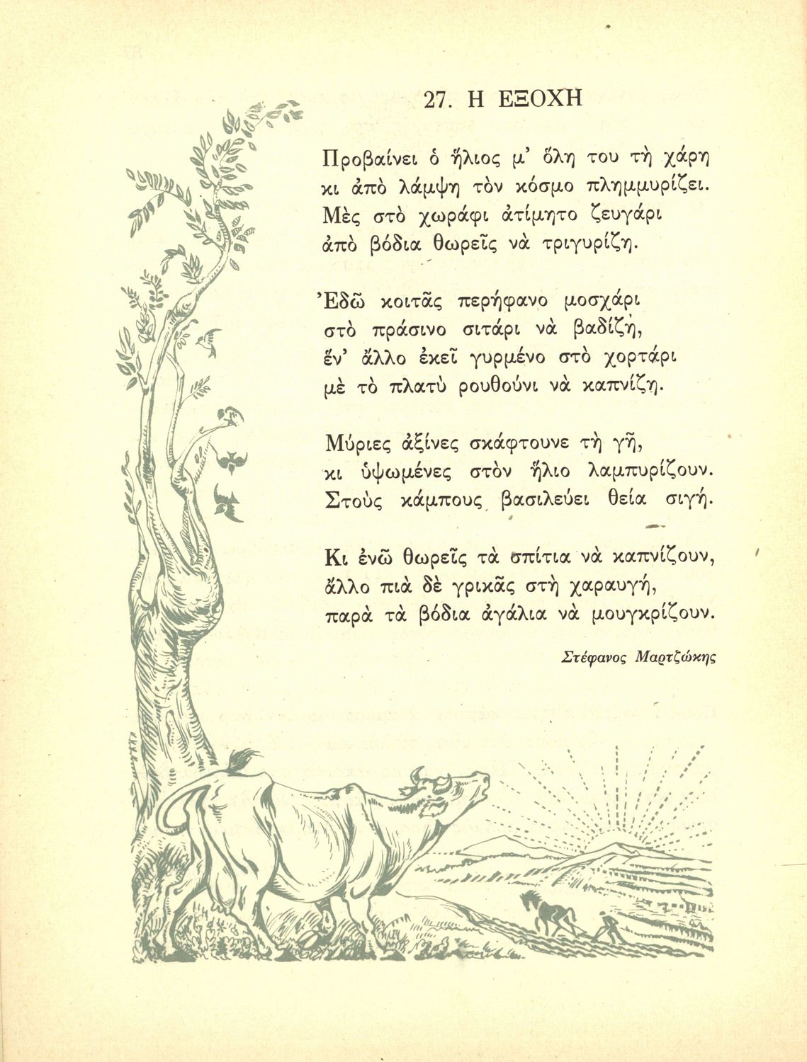 Αναγνωστικό Ε΄ Δημοτικού που περιέχει κείμενα εμπνευσμένα από την εθνική, κοινωνική και οικογενειακή ζωή και την ελληνική φύση, μυθολογία και ιστορία. Φέρει το σύμβολο της δικτατορίας.