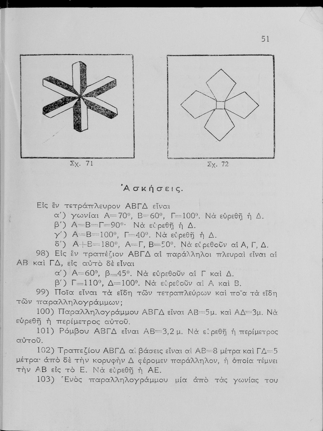 Σχολικό εγχειρίδιο Γεωμετρίας Γυμνασίων και Αστικών Σχολείων χωρισμένο σε Επιπεδομετρία και Στερεομετρία. Περιλαμβάνει και στοιχεία Χωρομετρίας.