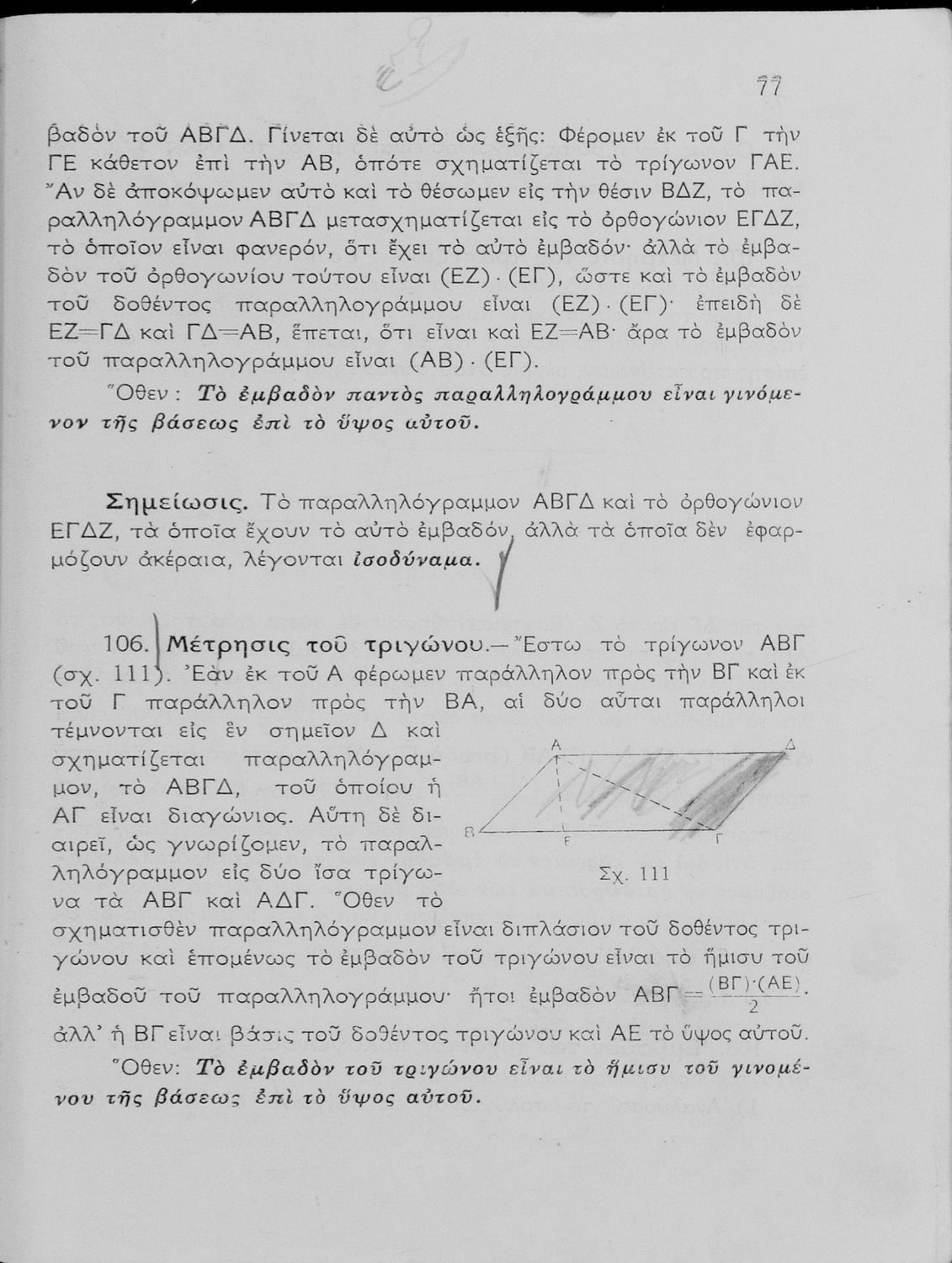 Σχολικό εγχειρίδιο Γεωμετρίας Γυμνασίων και Αστικών Σχολείων χωρισμένο σε Επιπεδομετρία και Στερεομετρία. Περιλαμβάνει και στοιχεία Χωρομετρίας.