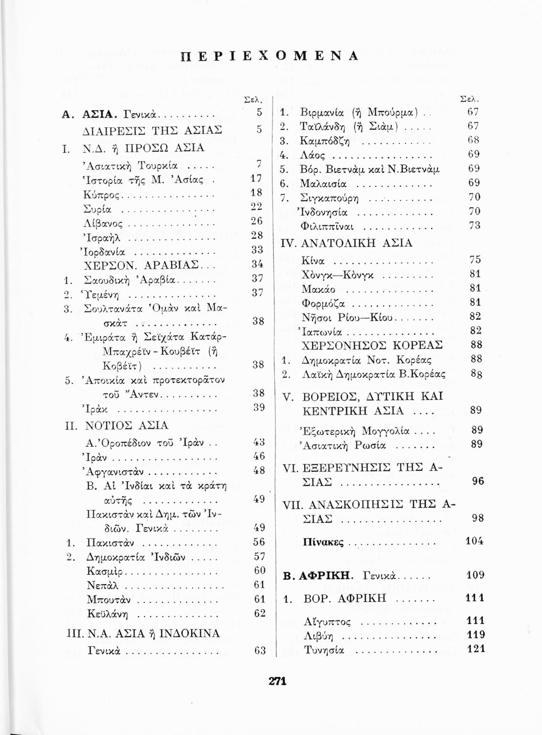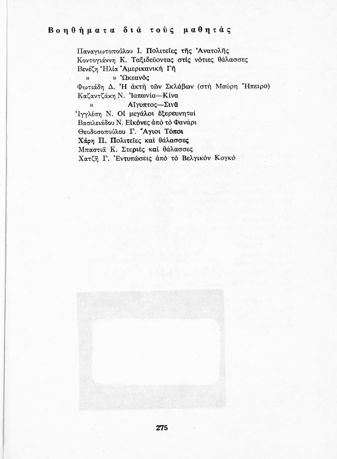 Σχολικό εγχειρίδιο Γεωγραφίας που εξετάζει ενδεικτικές χώρες και περιοχές από τις πέντε ηπείρους εκτός της Ευρώπης από γεωφυσική και οικονομική πλευρά. Φέρει το σύμβολο της δικτατορίας.