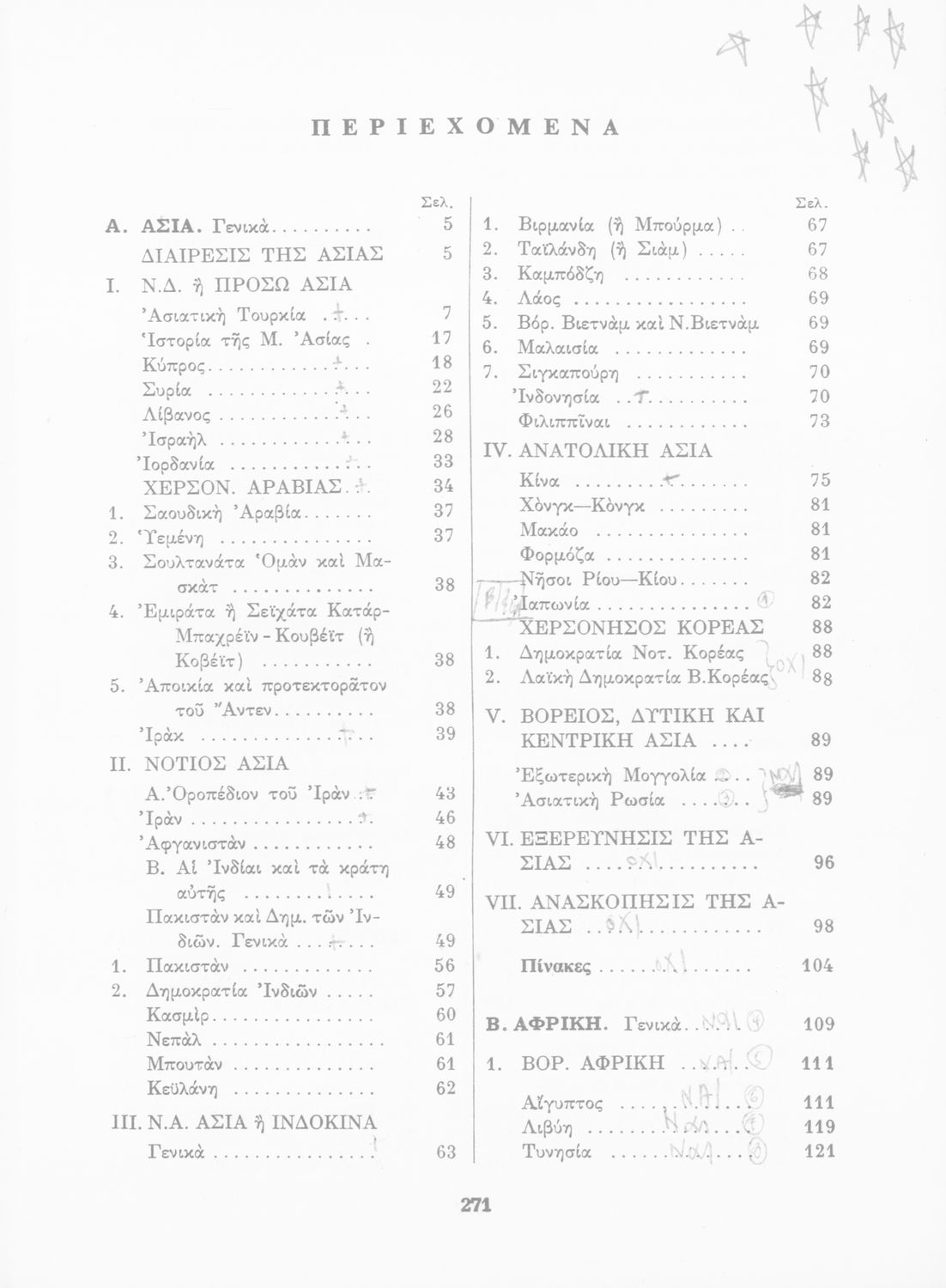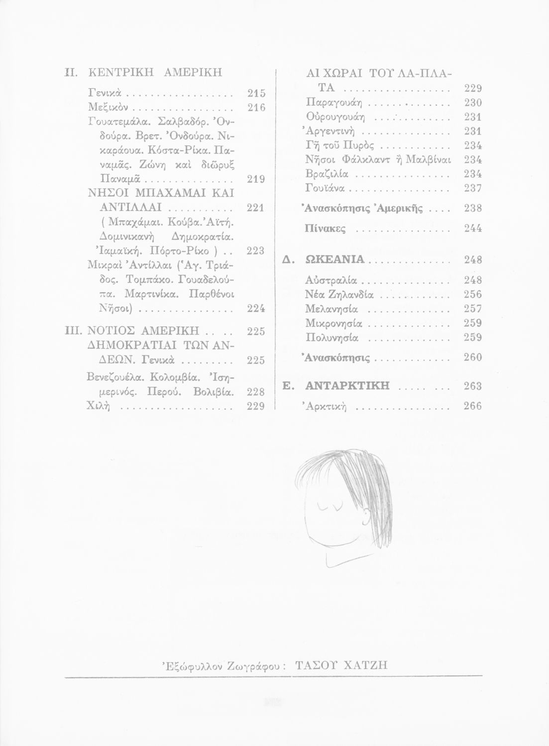 Σχολικό εγχειρίδιο Γεωγραφίας που εξετάζει ενδεικτικές χώρες και περιοχές από τις πέντε ηπείρους εκτός της Ευρώπης από γεωφυσική και οικονομική πλευρά. Φέρει το σύμβολο της δικτατορίας.