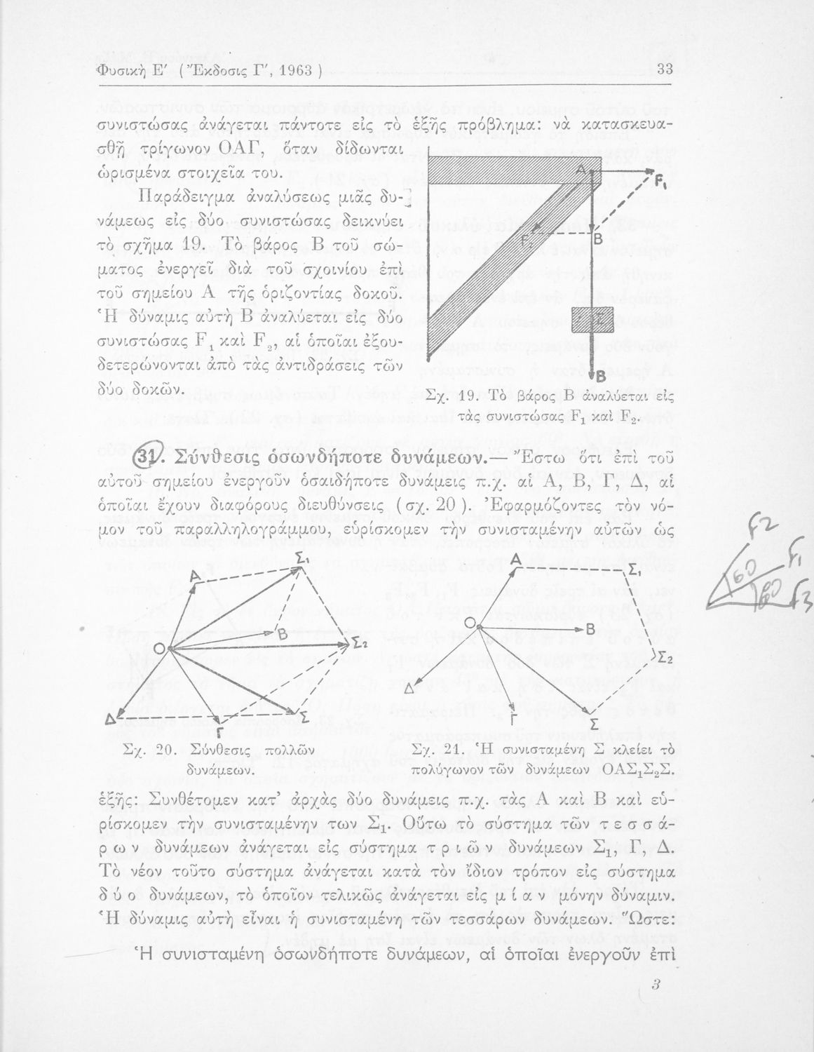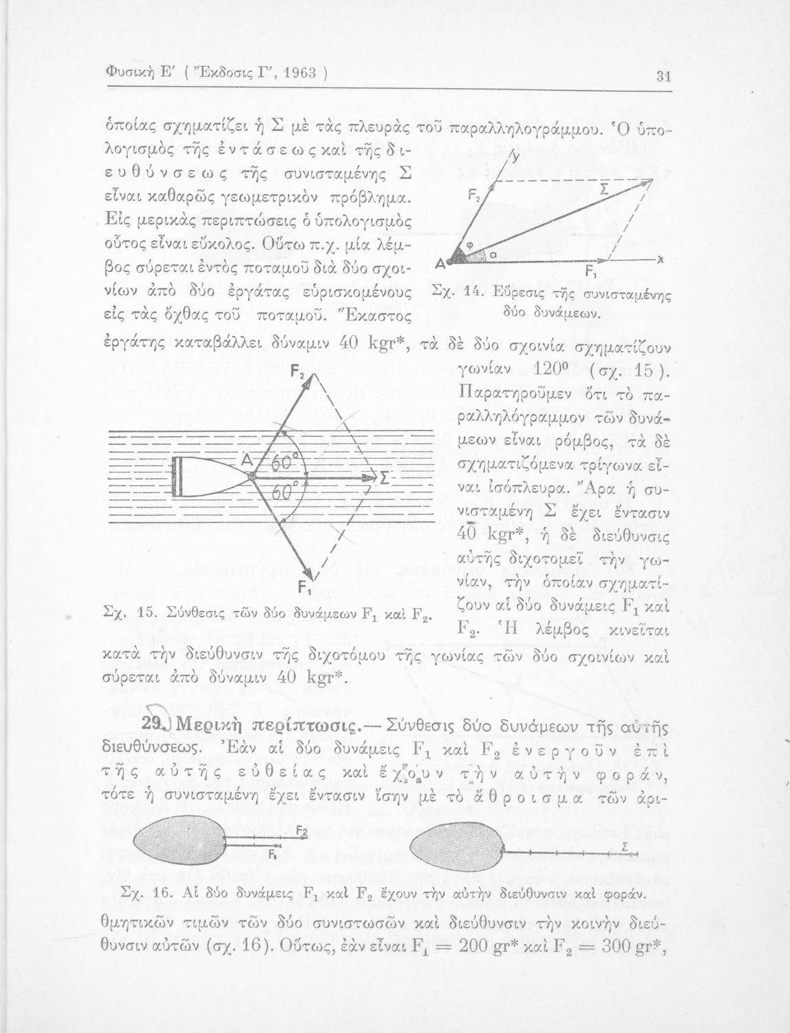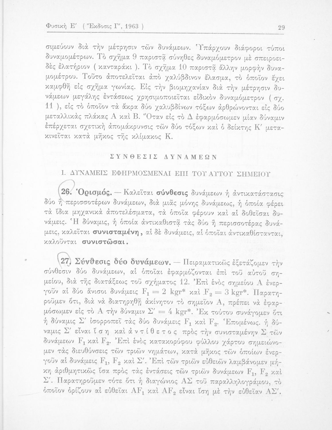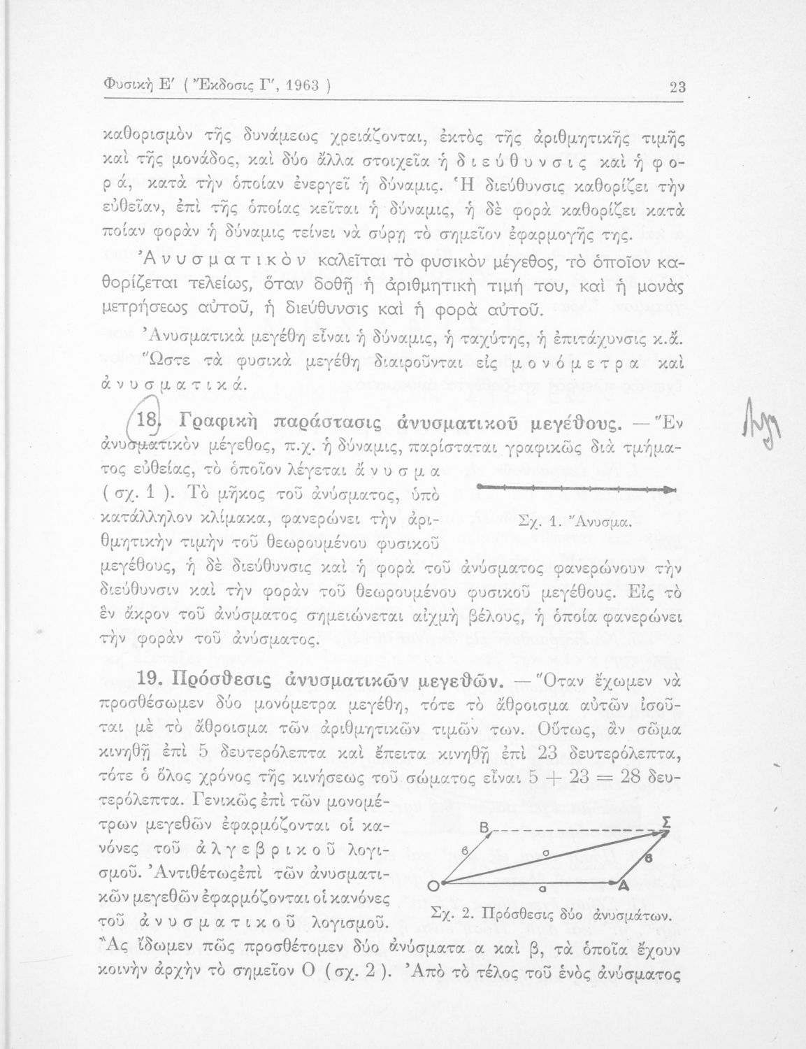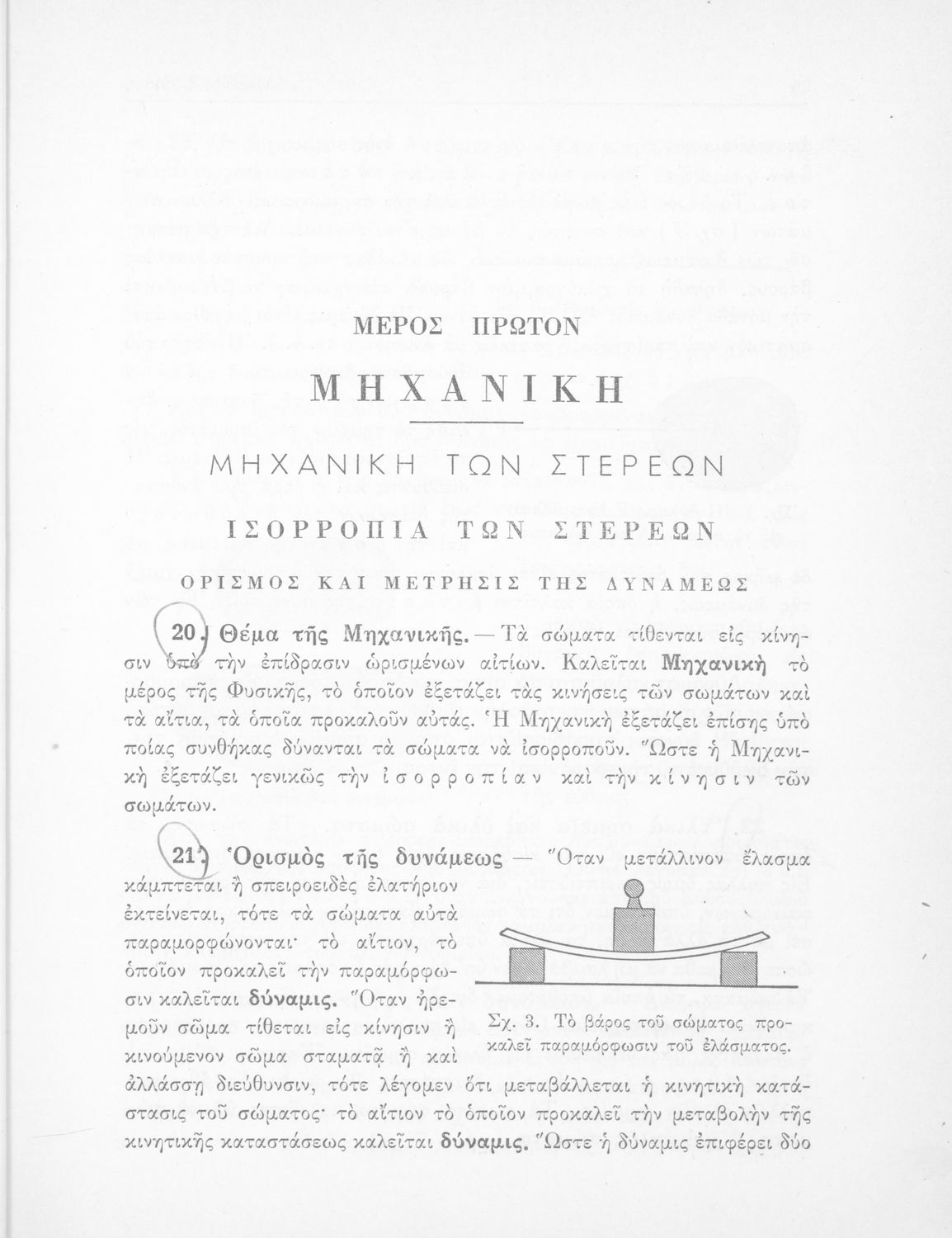 Βαθμίδα εκπαίδευσης: Δευτεροβάθμια Τάξη: Ε' Γυμνασίου Μάθημα: Φυσική Γλώσσα: Καθαρεύουσα Παρουσίαση περιεχομένου: Σχολικό εγχειρίδιο Φυσικής που απευθύνεται σε μαθητές της Ε΄ Γυμνασίου με σκοπό την ερμηνεία φυσικών φαινομένων και μεγεθών (φυσικά μεγέθη, ενέργεια, κίνηση κ.ά.). Προσδιορίζονται δυνάμεις και ισορροπία αυτών σε στερεά, υγρά και αέρια σώματα και ερμηνεύονται οι φυσικοί νόμοι που διέπουν τα φαινόμενα αυτά. Γίνεται αναλυτική περιγραφή των διάφορων πεδίων της φυσικής επιστήμης. |