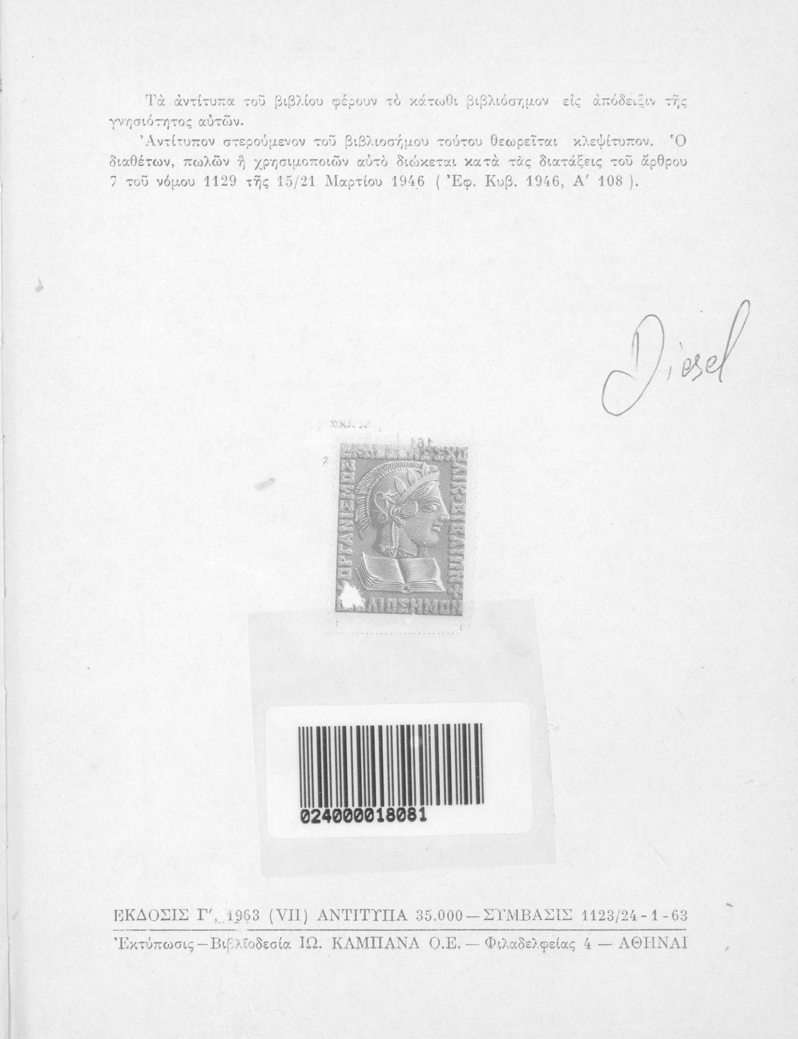 Εκδότης: Οργανισμός Εκδόσεως Διδακτικών Βιβλίων Έτος έκδοσης: 1963 Τόπος έκδοσης: Αθήνα Έκδοση: 3η Υπουργική απόφαση / Σύμβαση: 1123/24-1-1963 Έτος έγκρισης: 1963 |