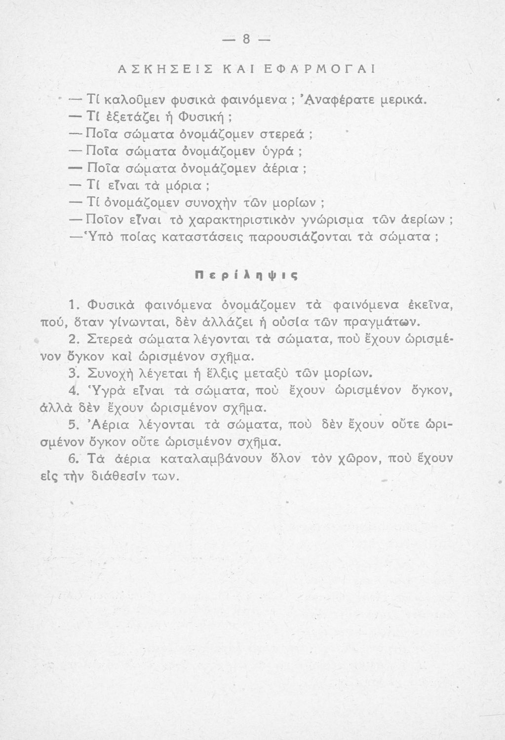 Μαθητικό βοήθημα της Ε΄ Δημοτικού για το μάθημα της Φυσικής στο Δημοτικό . Παρέχει βασικές γνώσεις της φυσικής επιστήμης και της χημείας. Αναλύει τις ιδιότητες των σωμάτων, καθώς και της θερμότητας, του ηλεκτρισμού και του μαγνητισμού, την υδροστατική, την βαρύτητα και την αεροστατική. Σχετικά με τη χημεία αναφέρεται στα μέταλλα, στα οξέα, τις βάσεις, τα άλατα. Αναφέρεται στην πρακτική εφαρμογή της φυσικής και της χημείας στην καθημερινότητά. Επίσης, περιλαμβάνει πολλά από τα όργανα, που χρησιμοποιούνται στη φυσική, και τη χημεία. Περιέχει εικόνες και σχεδιαγράμματα τα οποία βοηθούν τη διδασκαλία. Προτείνεται μια συγκεκριμένη δομή για τη διδασκαλία σύμφωνα με την οποία το μάθημα διαρθρώνεται αρχικά με την ανάγνωση, που αναφέρεται στη θεωρία, στην περίληψη των σημαντικότερων σημείων, στις ερωτήσεις κατανόησης και τέλος στο γύμνασμα, το οποίο είναι η πρακτική εφαρμογή για την εμπέδωση της θεωρίας.