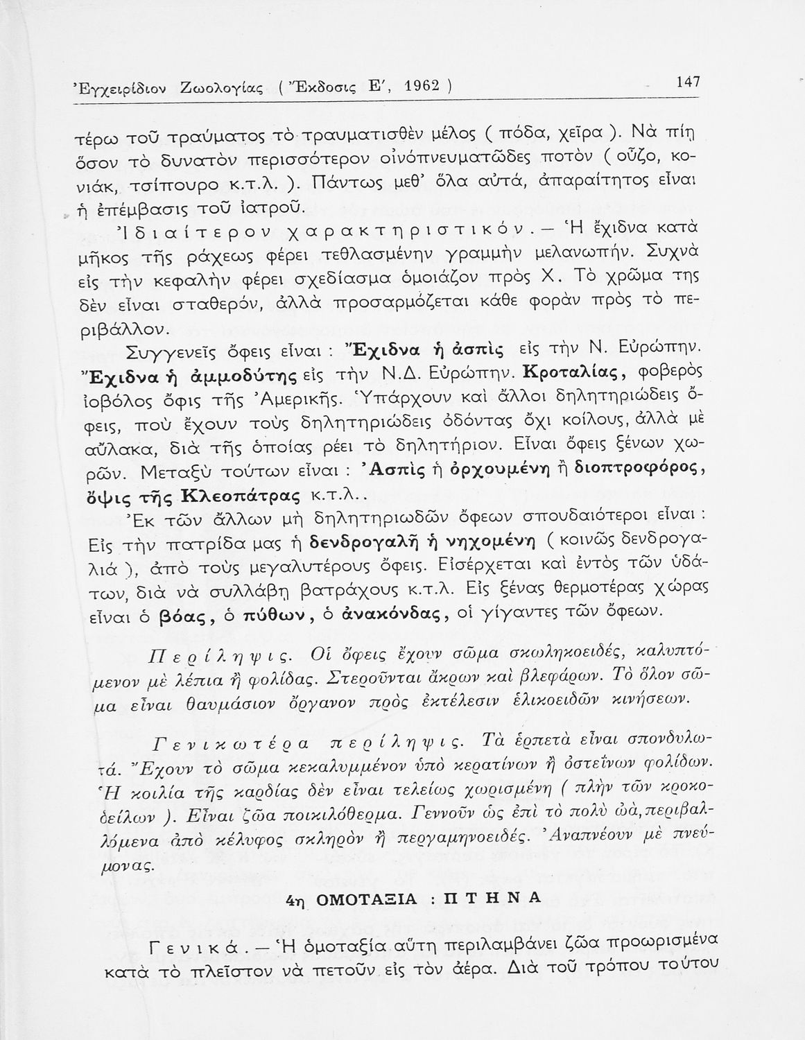 Σχολικό εγχειρίδιο Ζωολογίας για την Γ΄ τάξη των Εξαταξίων Γυμνασίων που παρουσιάζει τα διάφορα ζώα ανάλογα με την συνομοταξία στην οποία ανήκουν.