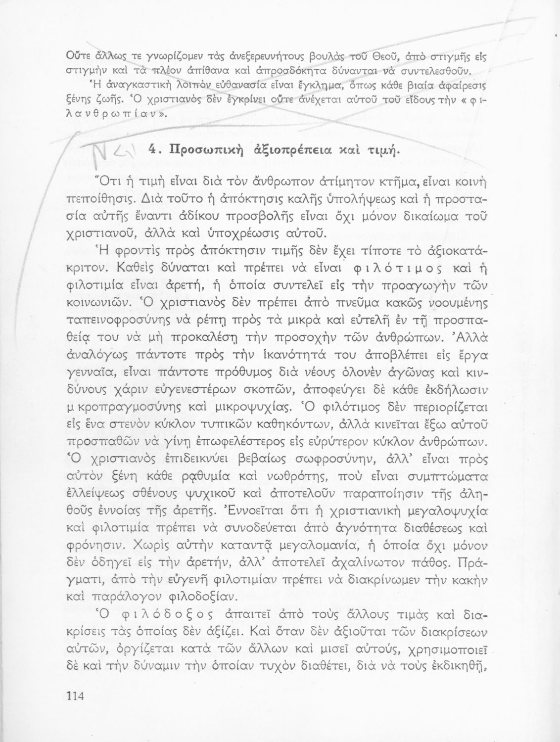 Σχολικό εγχειρίδιο Θρησκευτικών που πραγματεύεται την έννοια της αρετής και της ηθικής, της αμαρτίας και της λύτρωσης, της δικαιοσύνης και της αγάπης όπως αυτή ορίζεται από το Χριστιανισμό. Φέρει το σύμβολο της δικτατορίας.