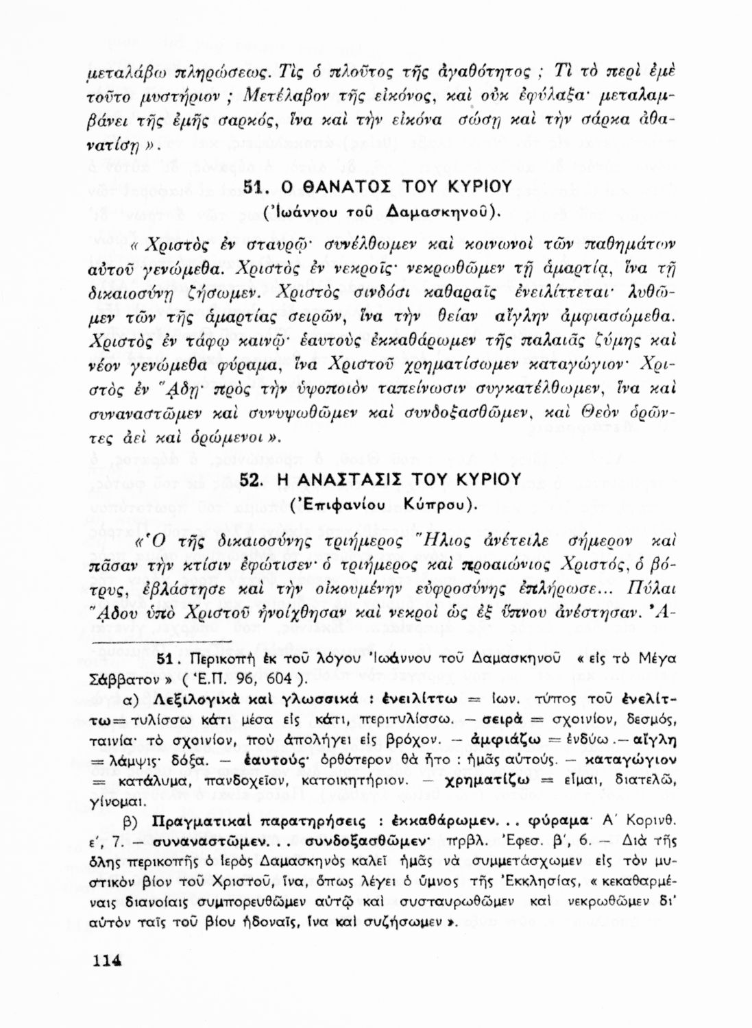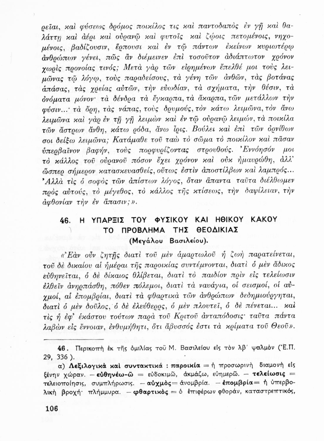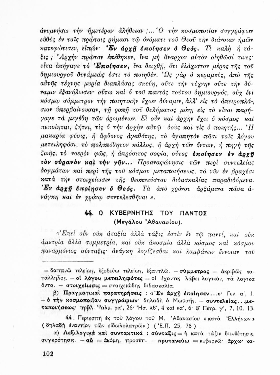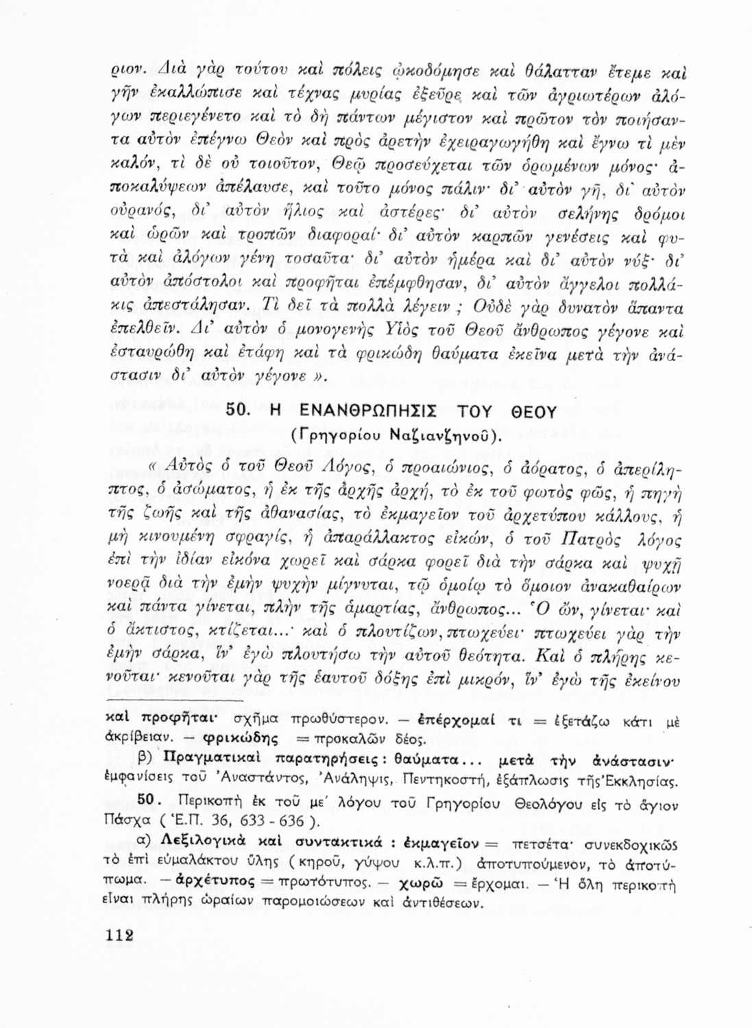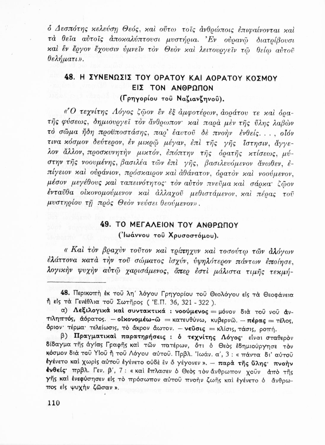 Σχολικό εγχειρίδιο Θρησκευτικών Γυμνασίου που περιλαμβάνει κείμενα των Πατέρων της Εκκλησίας, τις μεταφράσεις τους και βιογραφικά σημειώματα των συγγραφέων. Ο συγγραφέας ήταν τακτικός καθηγητής του Πανεπιστημίου Αθηνών. Φέρει το σύμβολο της δικτατορίας.