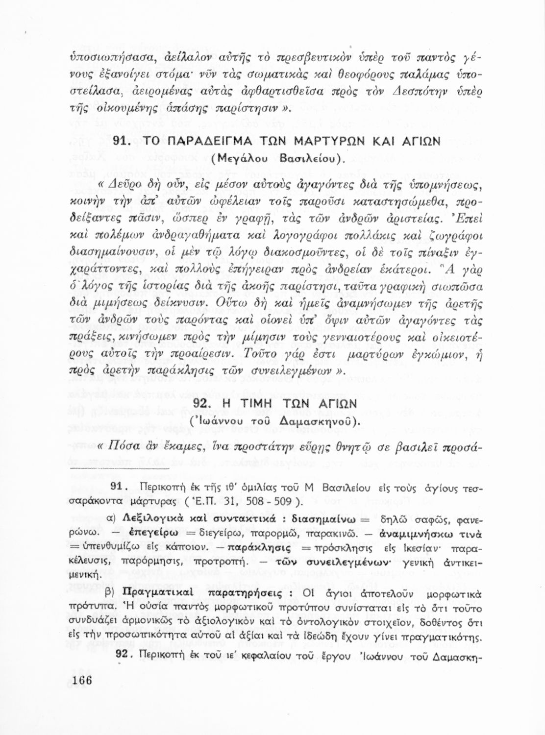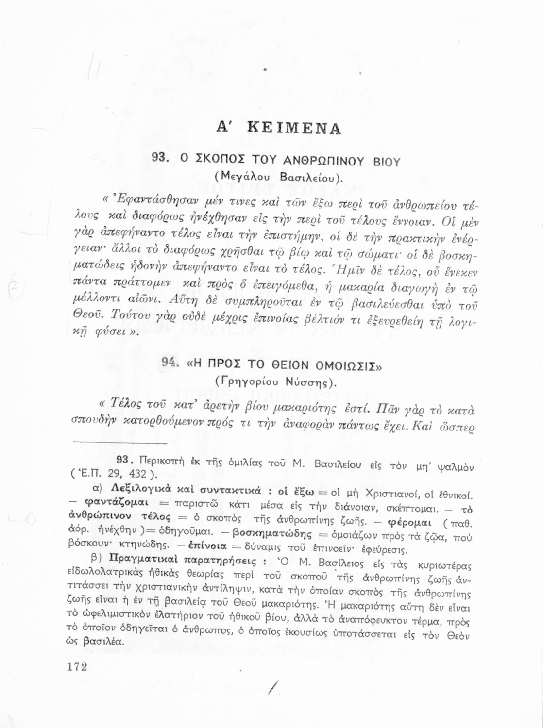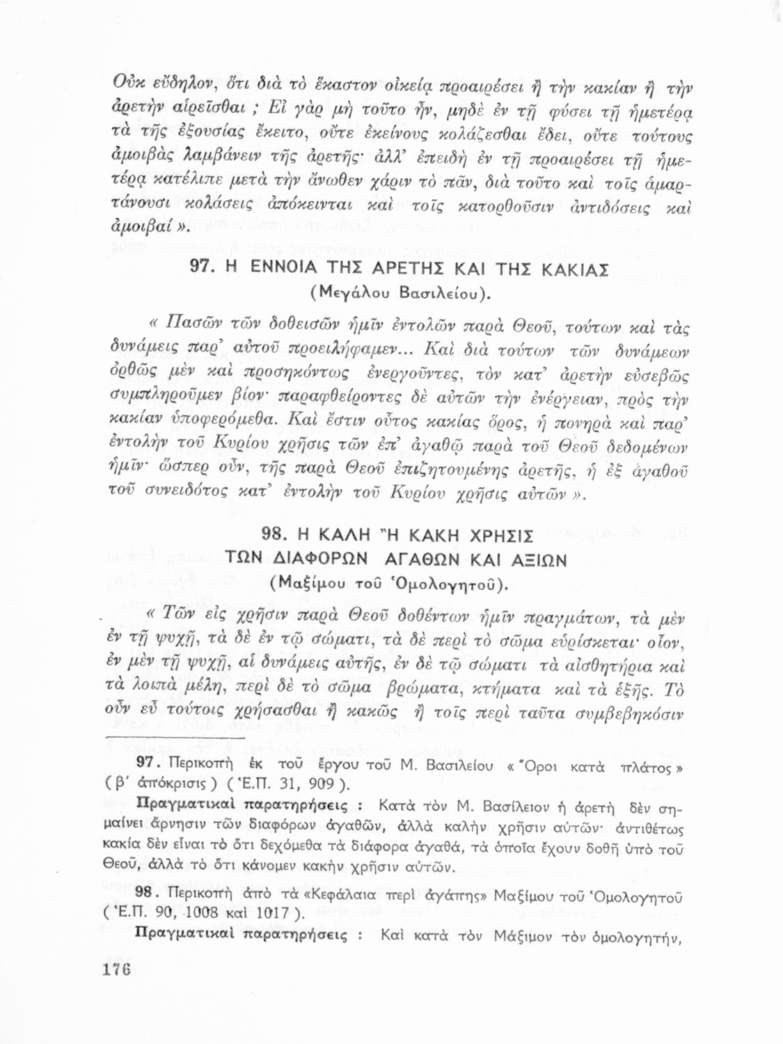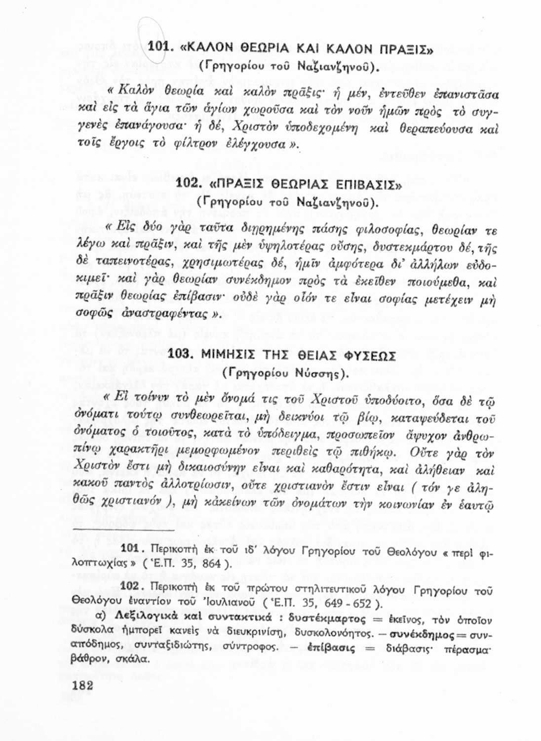 Σχολικό εγχειρίδιο Θρησκευτικών Γυμνασίου που περιλαμβάνει κείμενα των Πατέρων της Εκκλησίας, τις μεταφράσεις τους και βιογραφικά σημειώματα των συγγραφέων. Ο συγγραφέας ήταν τακτικός καθηγητής του Πανεπιστημίου Αθηνών. Φέρει το σύμβολο της δικτατορίας.