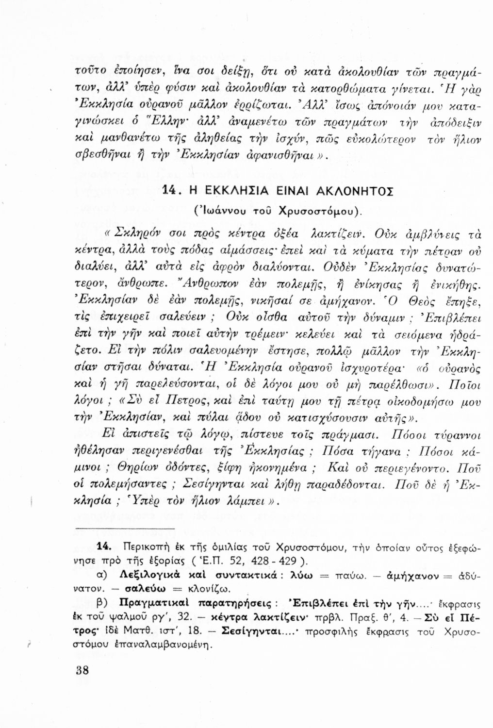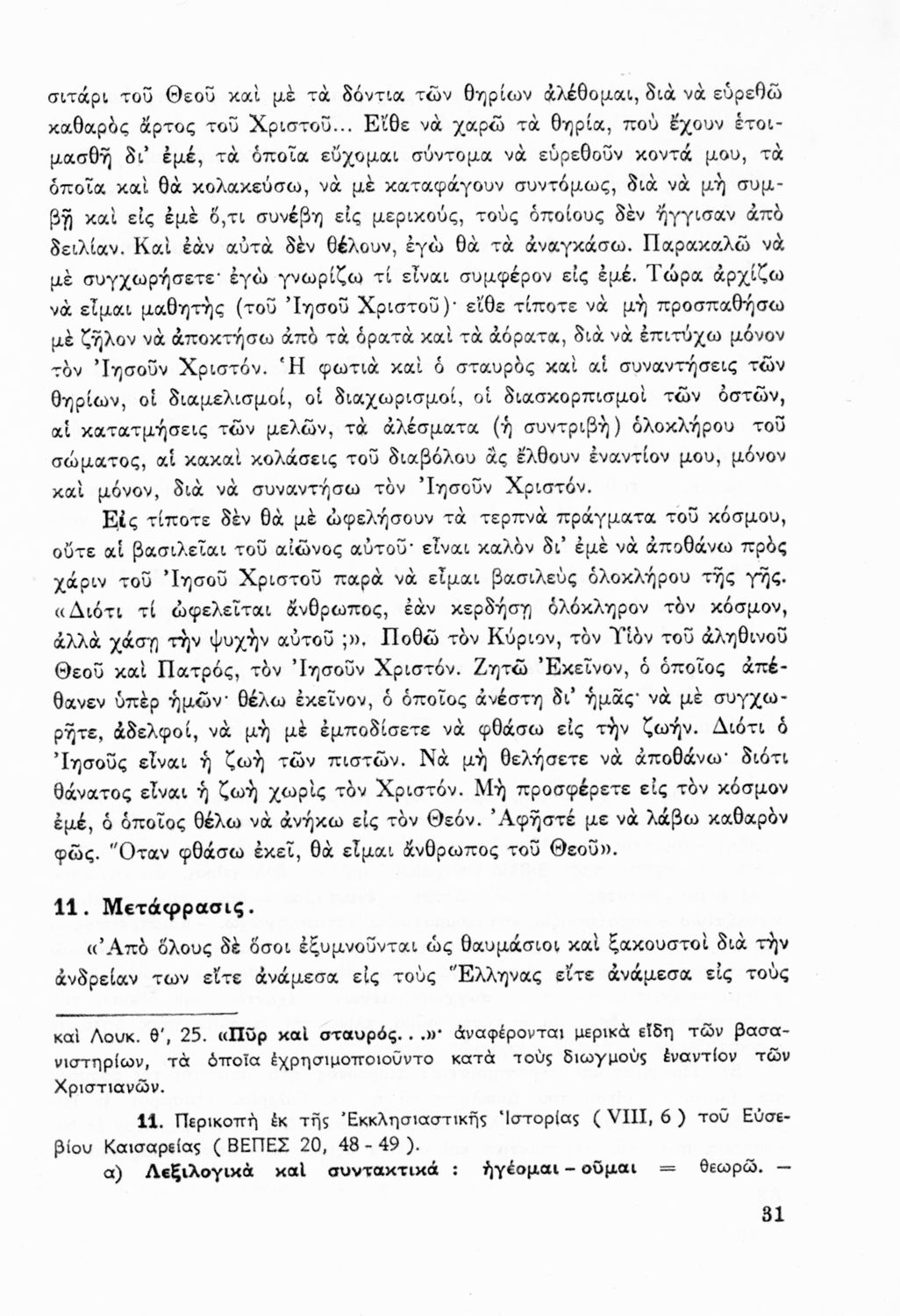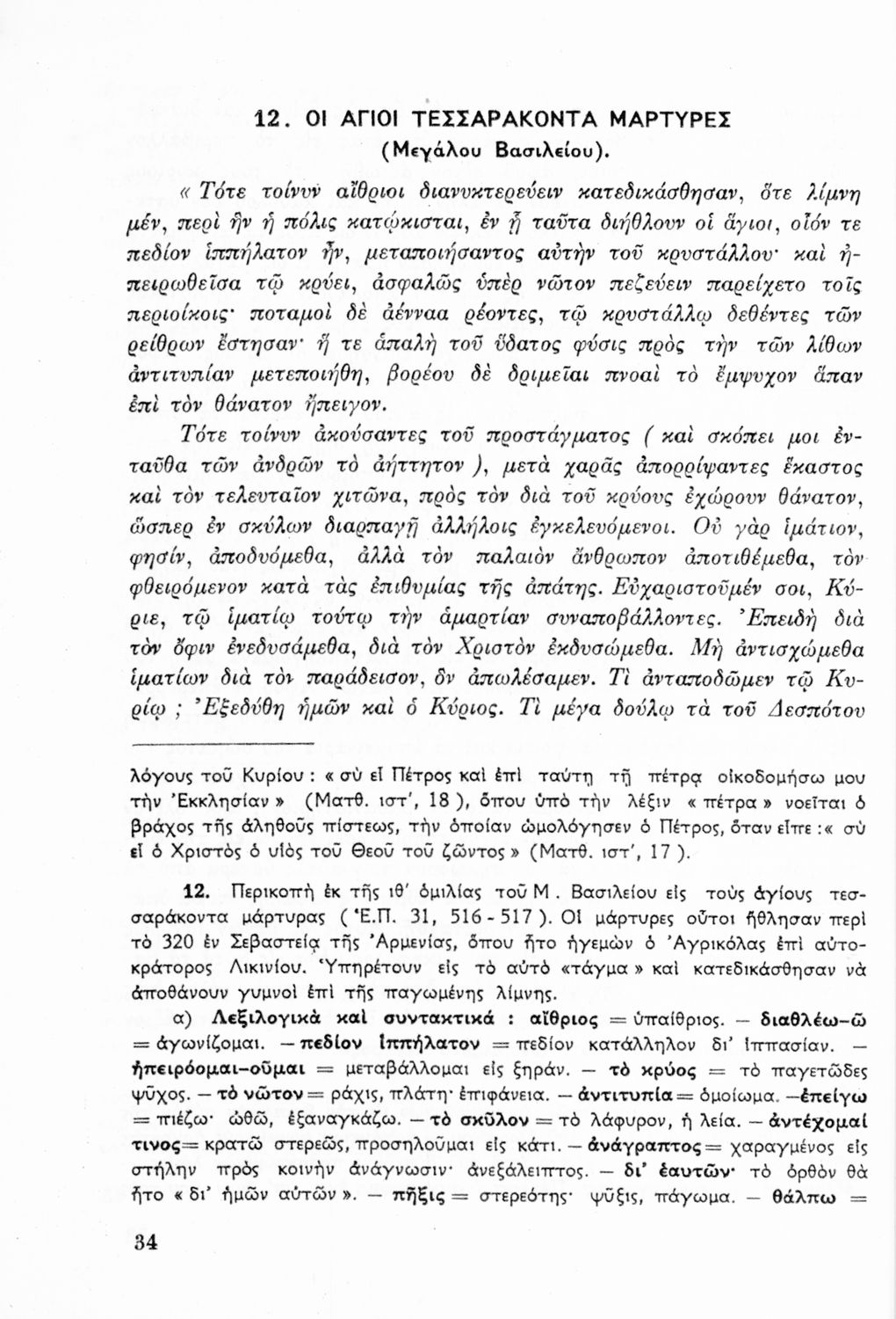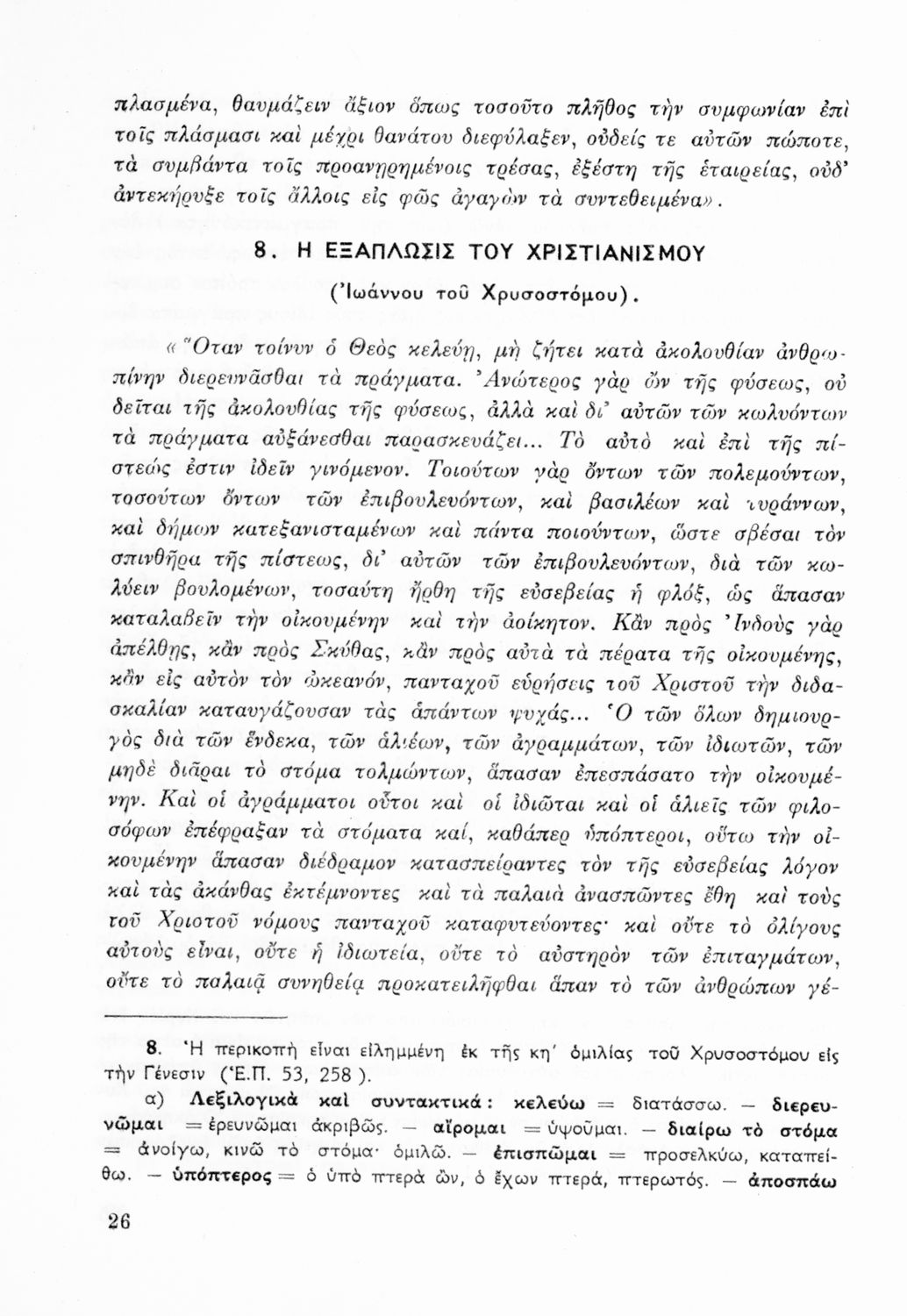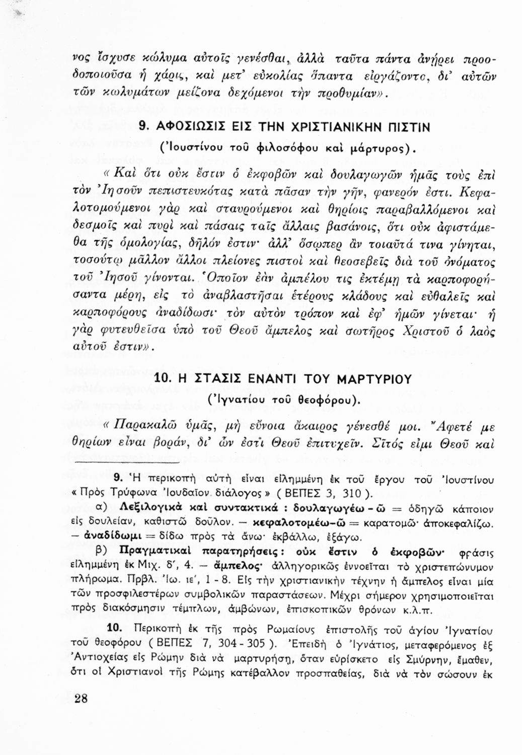 Σχολικό εγχειρίδιο Θρησκευτικών Γυμνασίου που περιλαμβάνει κείμενα των Πατέρων της Εκκλησίας, τις μεταφράσεις τους και βιογραφικά σημειώματα των συγγραφέων. Ο συγγραφέας ήταν τακτικός καθηγητής του Πανεπιστημίου Αθηνών. Φέρει το σύμβολο της δικτατορίας.