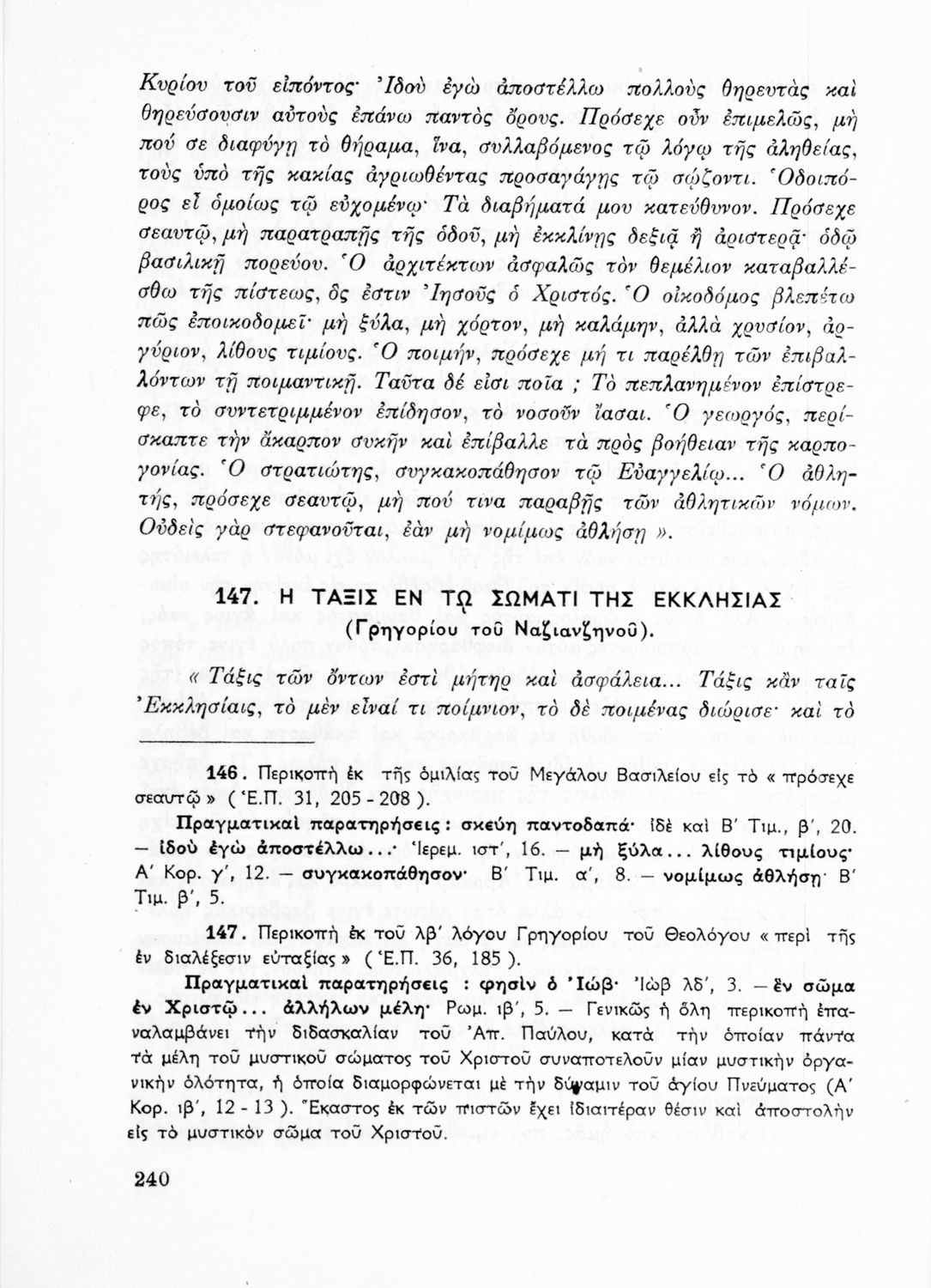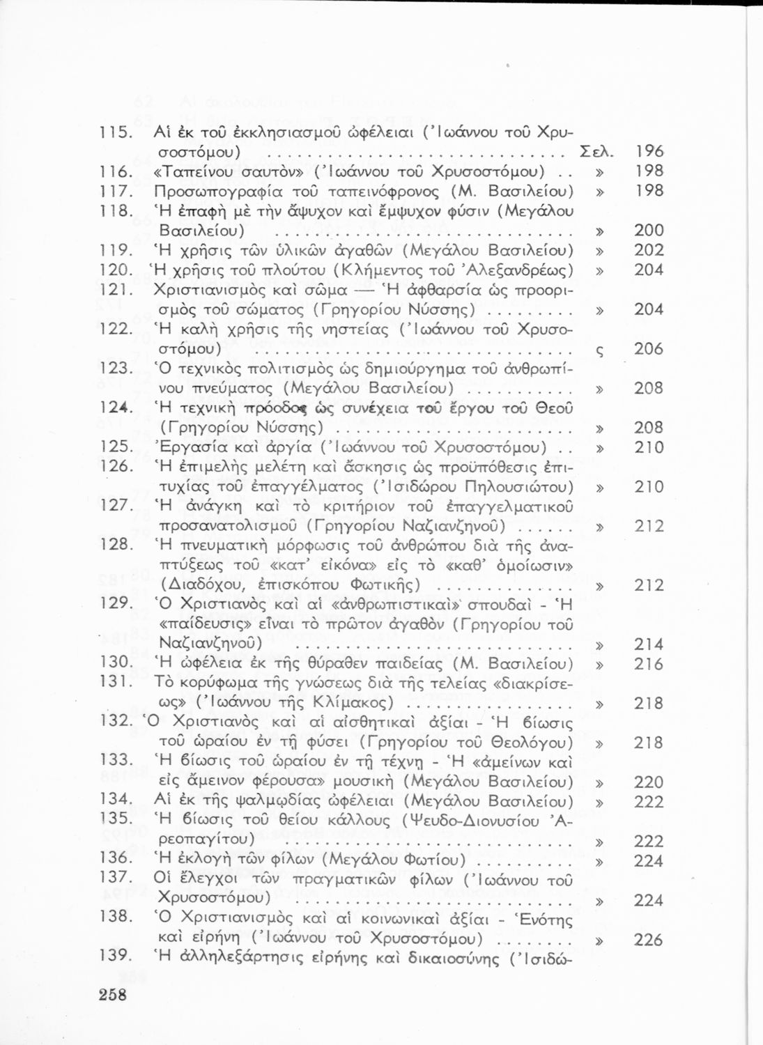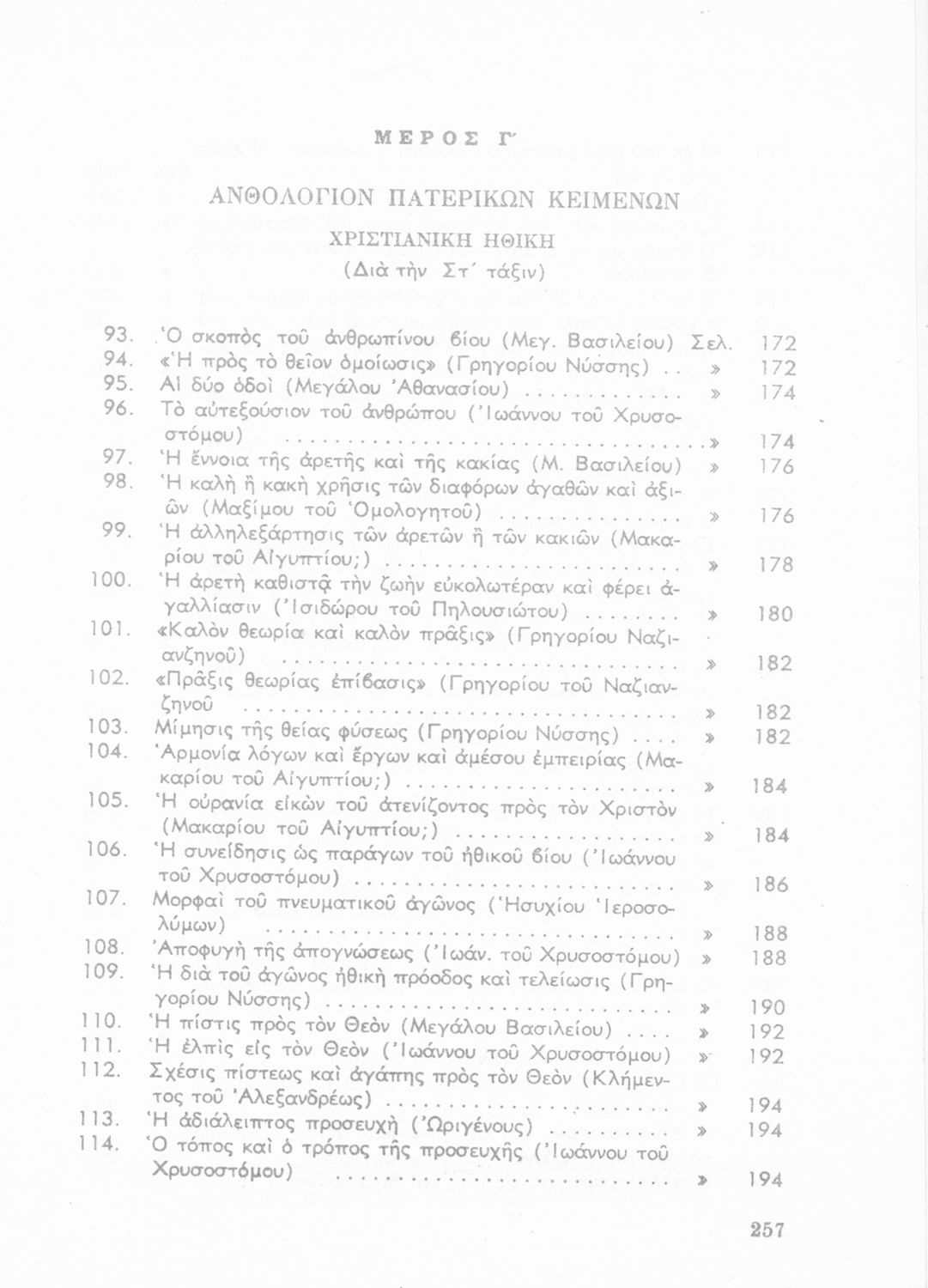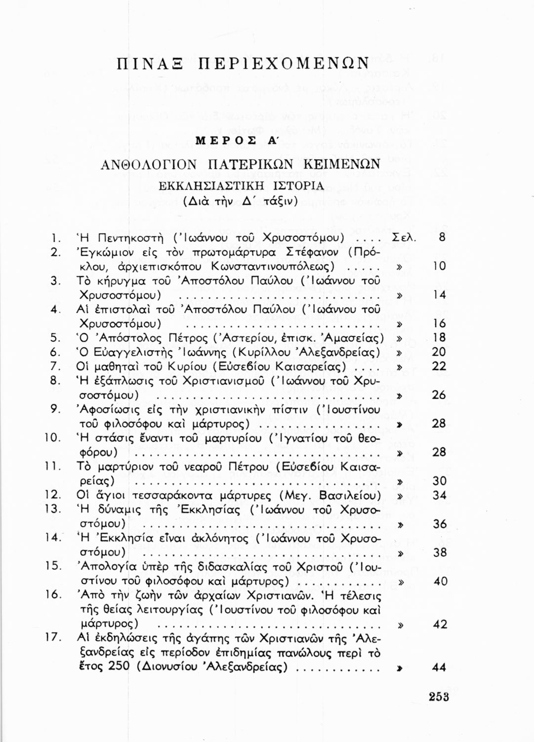 Σχολικό εγχειρίδιο Θρησκευτικών Γυμνασίου που περιλαμβάνει κείμενα των Πατέρων της Εκκλησίας, τις μεταφράσεις τους και βιογραφικά σημειώματα των συγγραφέων. Ο συγγραφέας ήταν τακτικός καθηγητής του Πανεπιστημίου Αθηνών. Φέρει το σύμβολο της δικτατορίας.