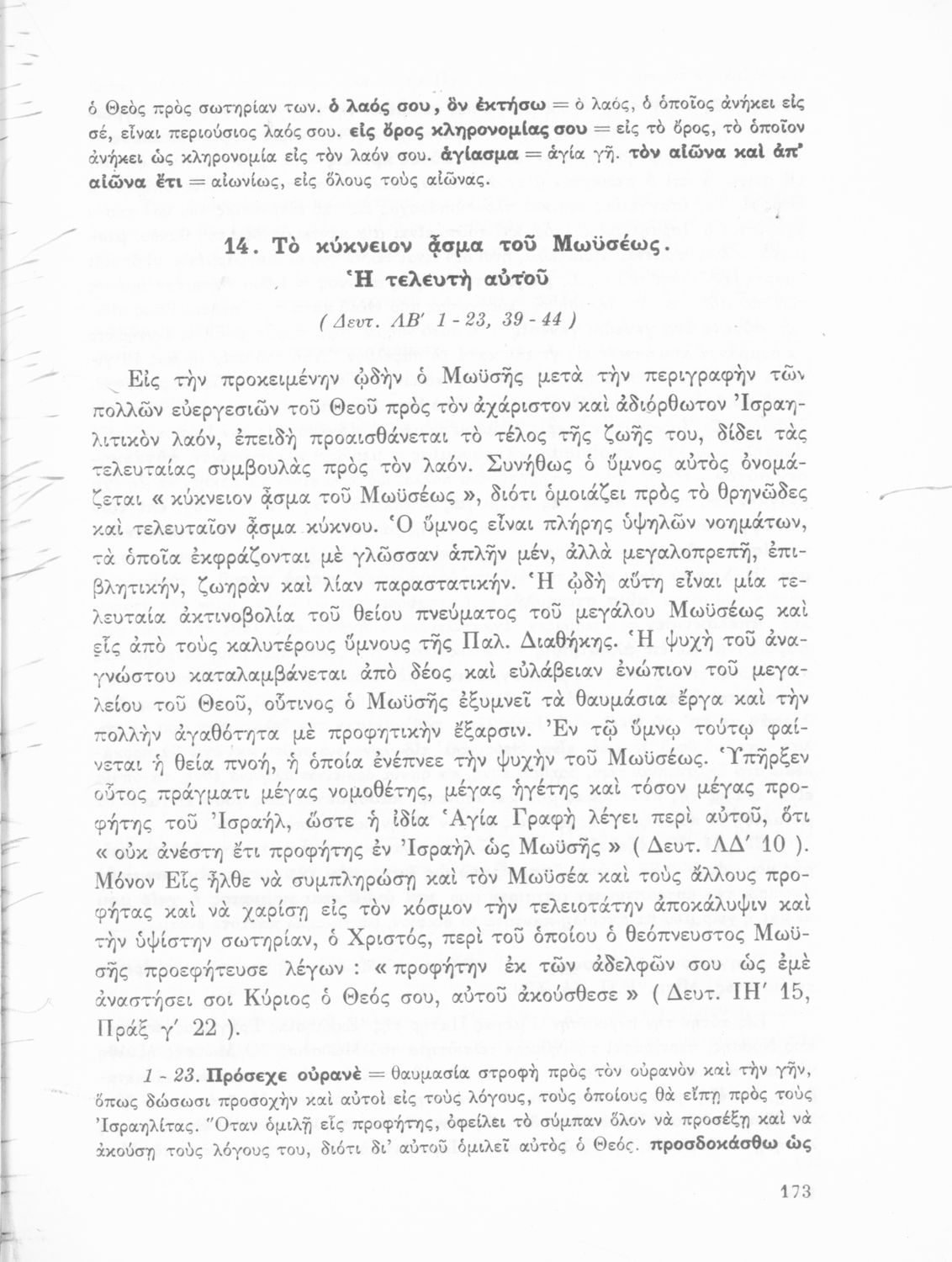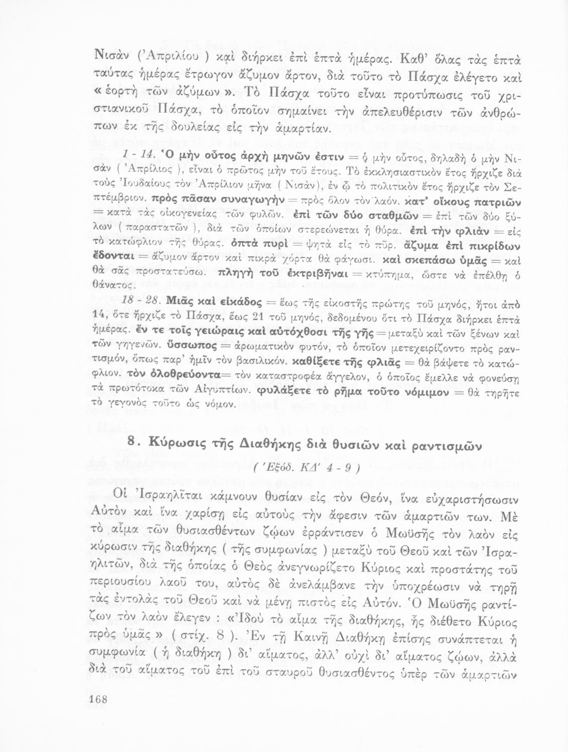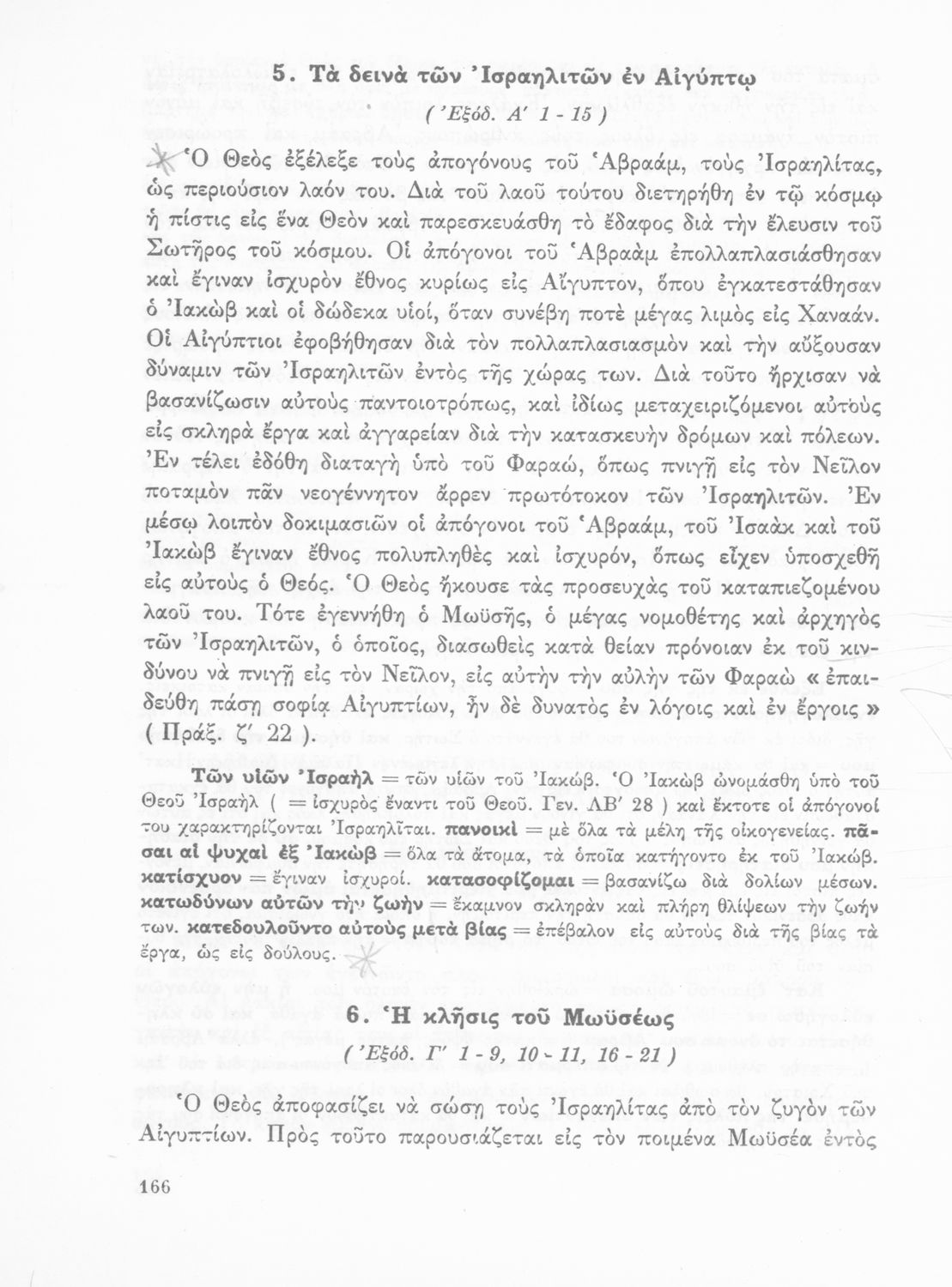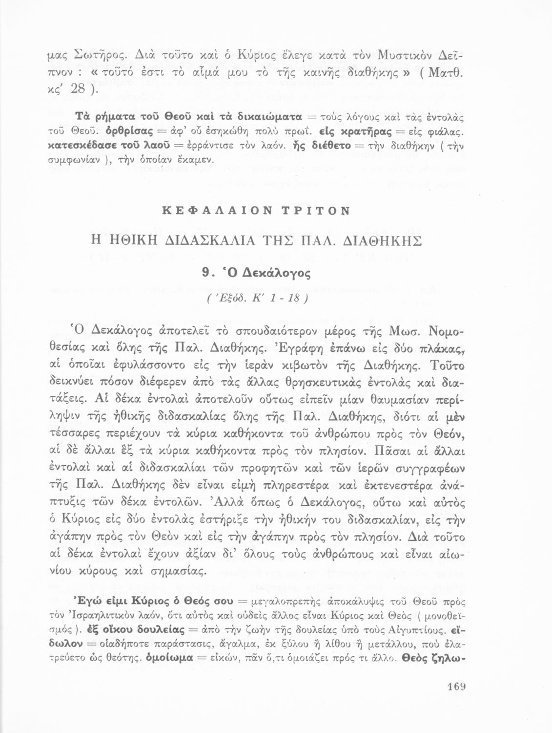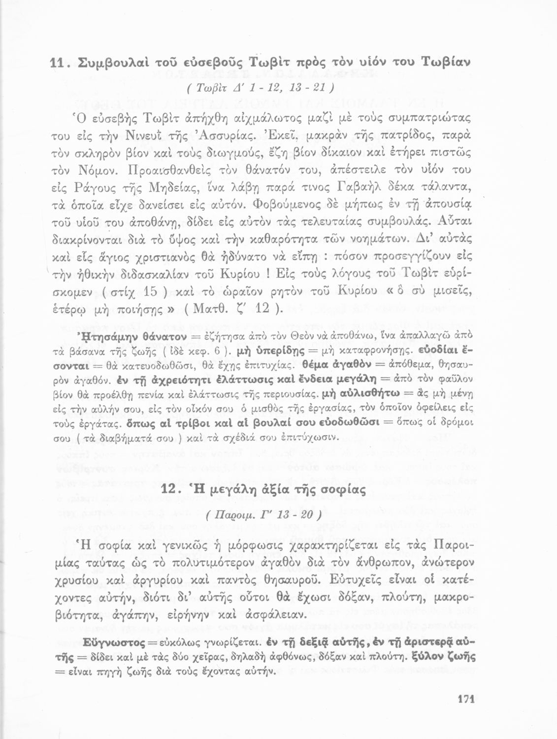 Σχολικό εγχειρίδιο Θρησκευτικών που περιλαμβάνει εισαγωγικά σχόλια στα βιβλία της Παλαιάς και Καινής Διαθήκης, περικοπές, ερμηνευτικές και πραγματολογικές σημειώσεις και πίνακα με τα κυριότερα ονόματα.