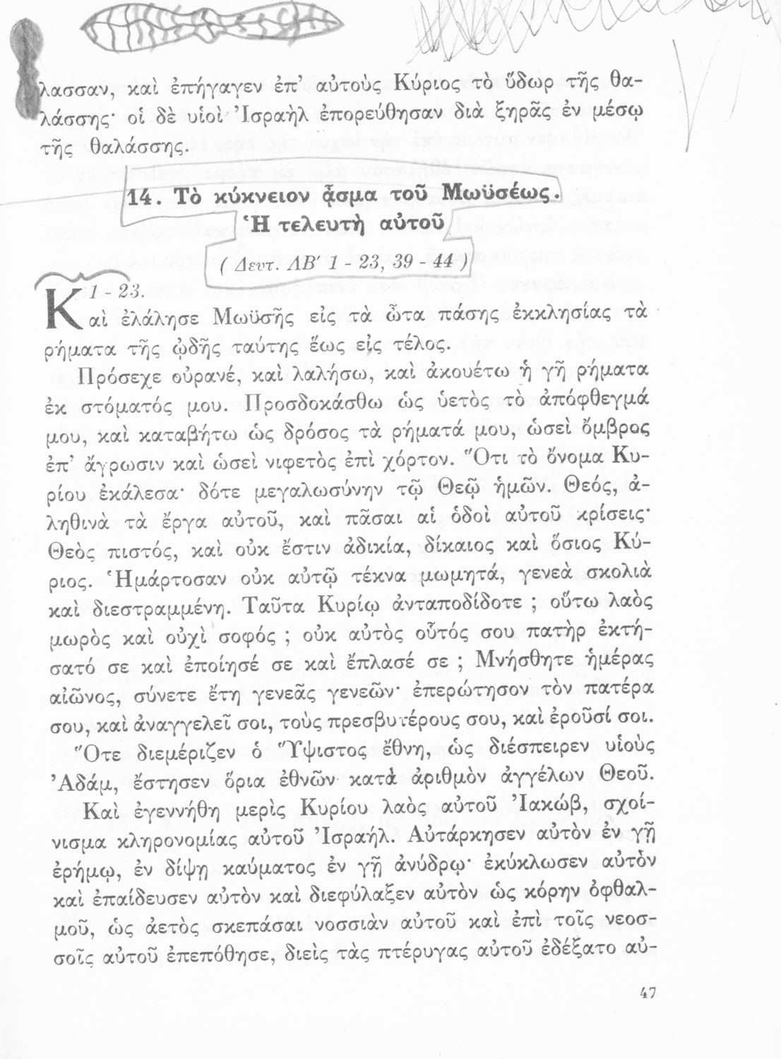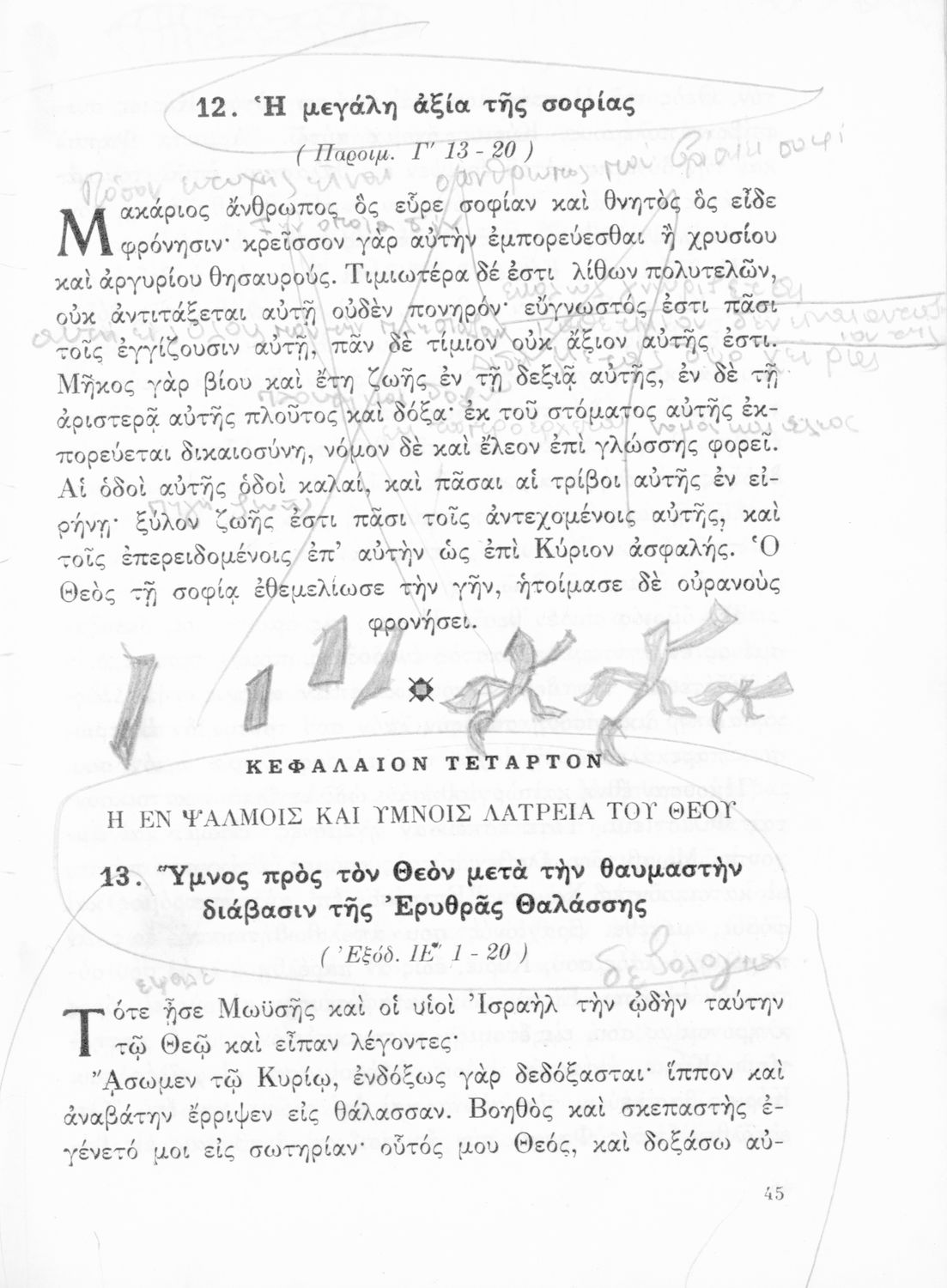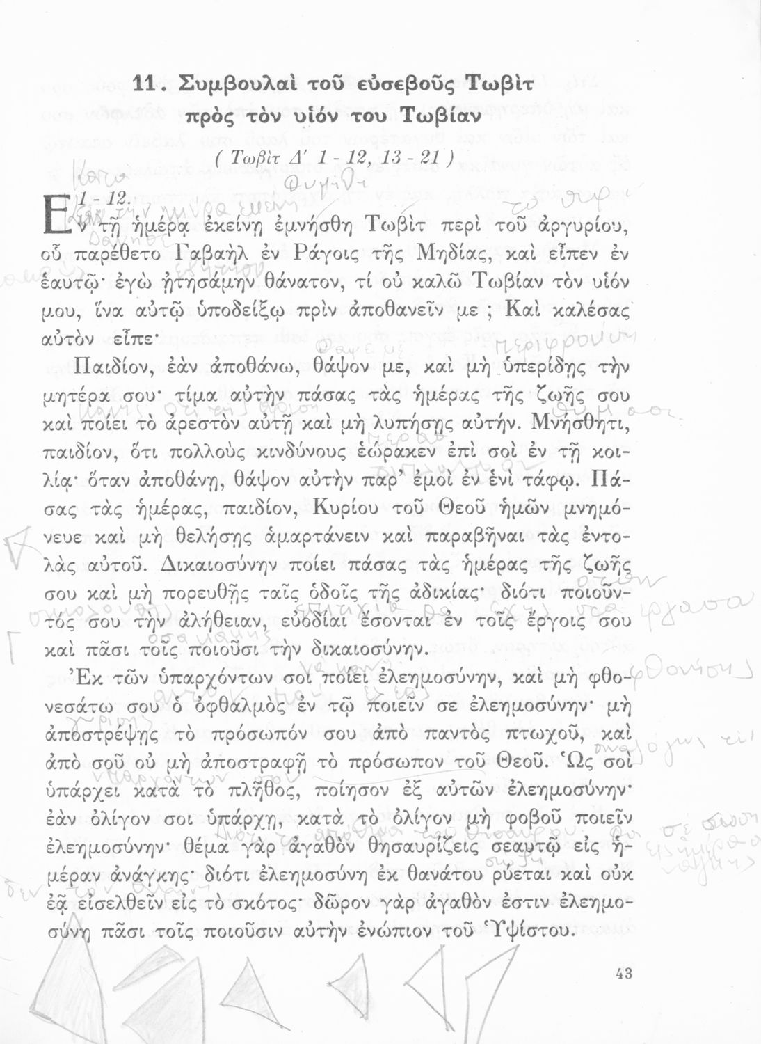 Σχολικό εγχειρίδιο Θρησκευτικών που περιλαμβάνει εισαγωγικά σχόλια στα βιβλία της Παλαιάς και Καινής Διαθήκης, περικοπές, ερμηνευτικές και πραγματολογικές σημειώσεις και πίνακα με τα κυριότερα ονόματα.