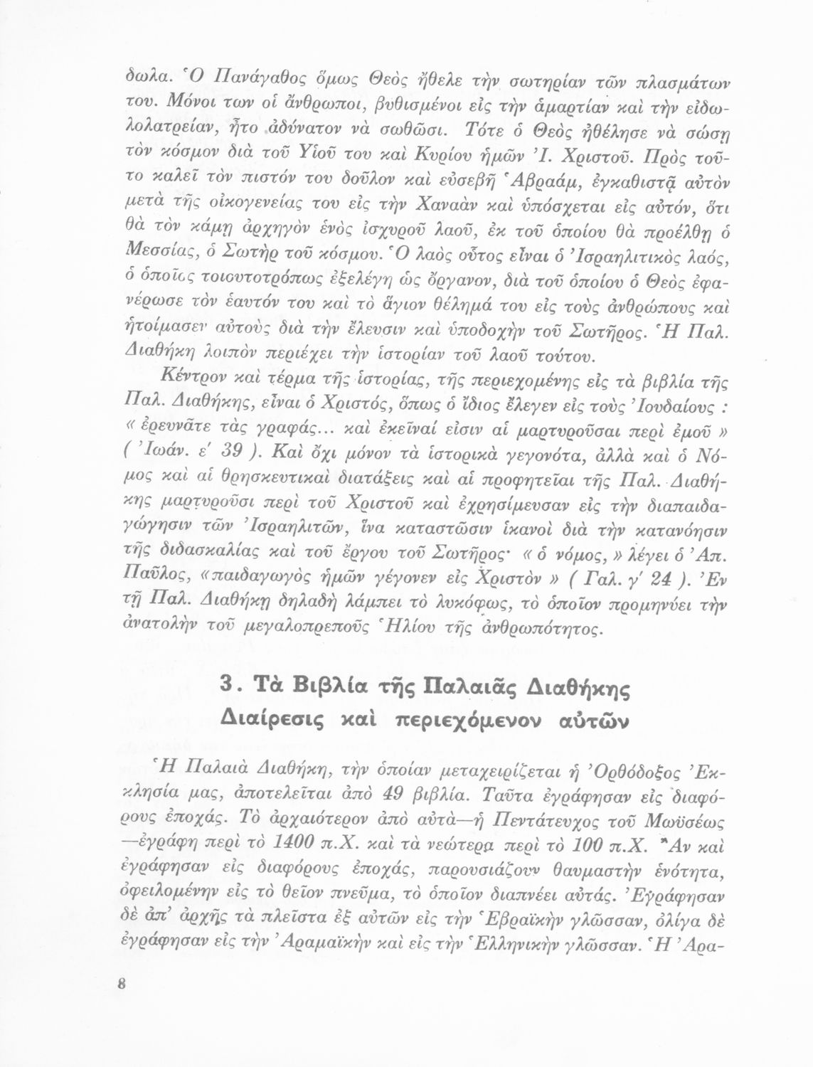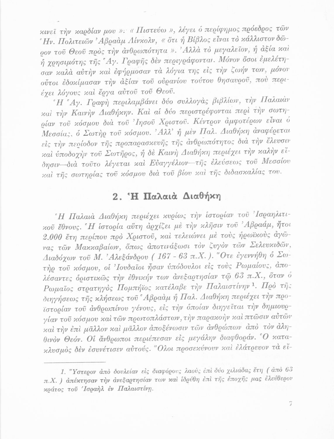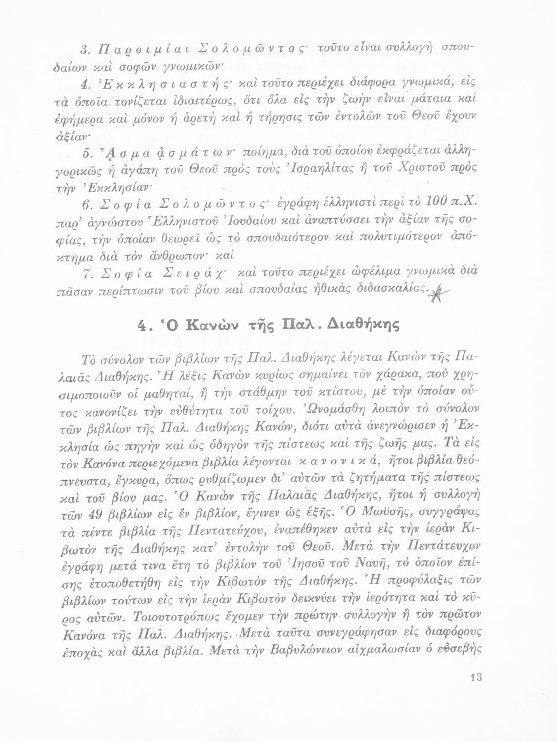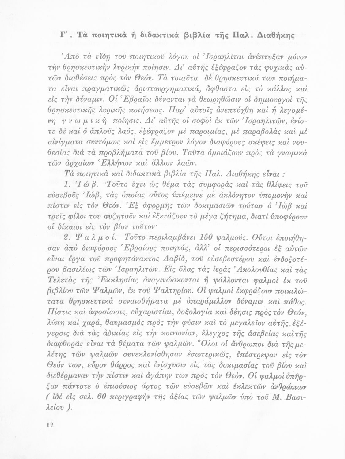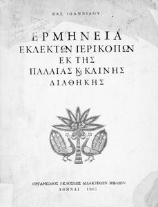 Σχολικό εγχειρίδιο Θρησκευτικών που περιλαμβάνει εισαγωγικά σχόλια στα βιβλία της Παλαιάς και Καινής Διαθήκης, περικοπές, ερμηνευτικές και πραγματολογικές σημειώσεις και πίνακα με τα κυριότερα ονόματα.