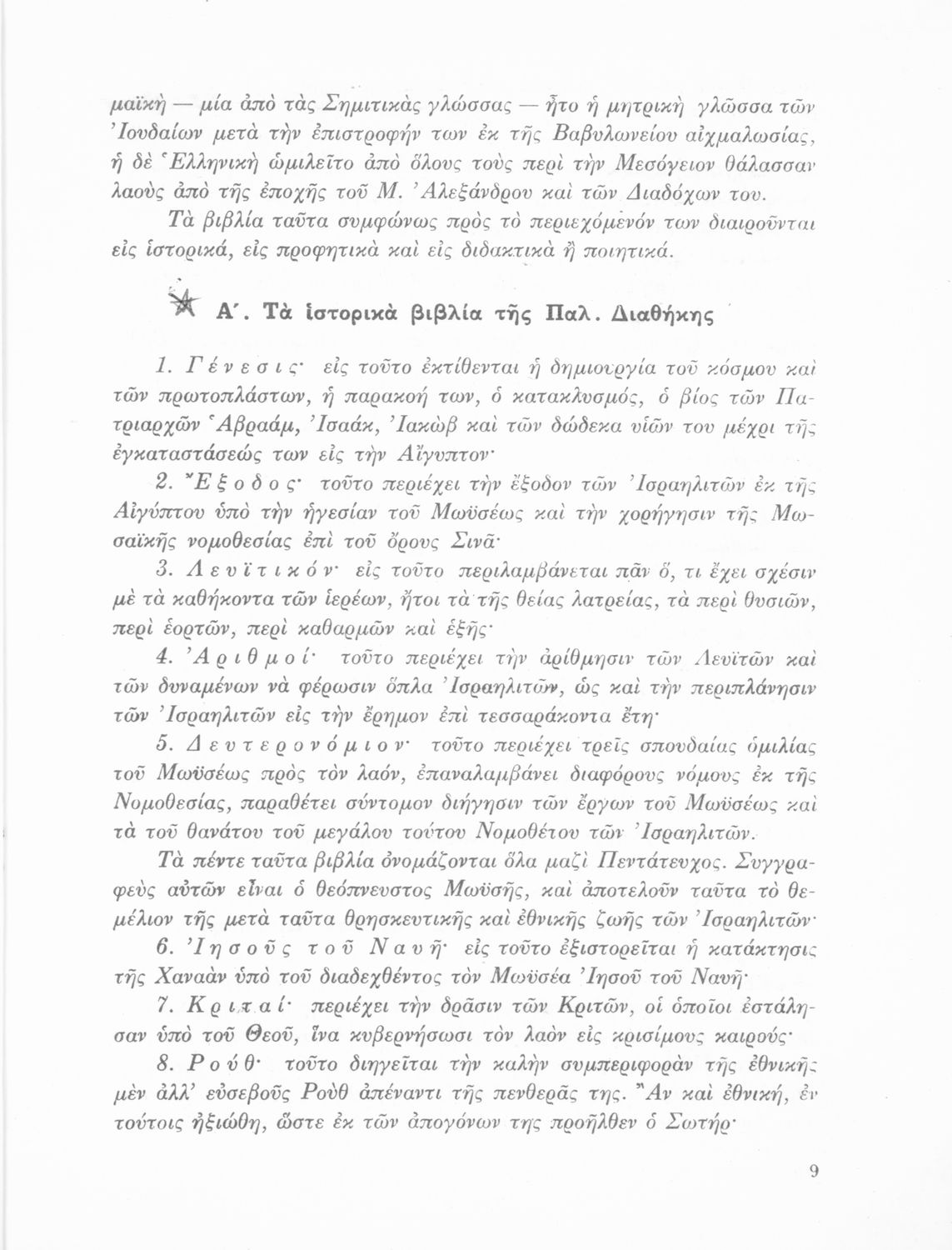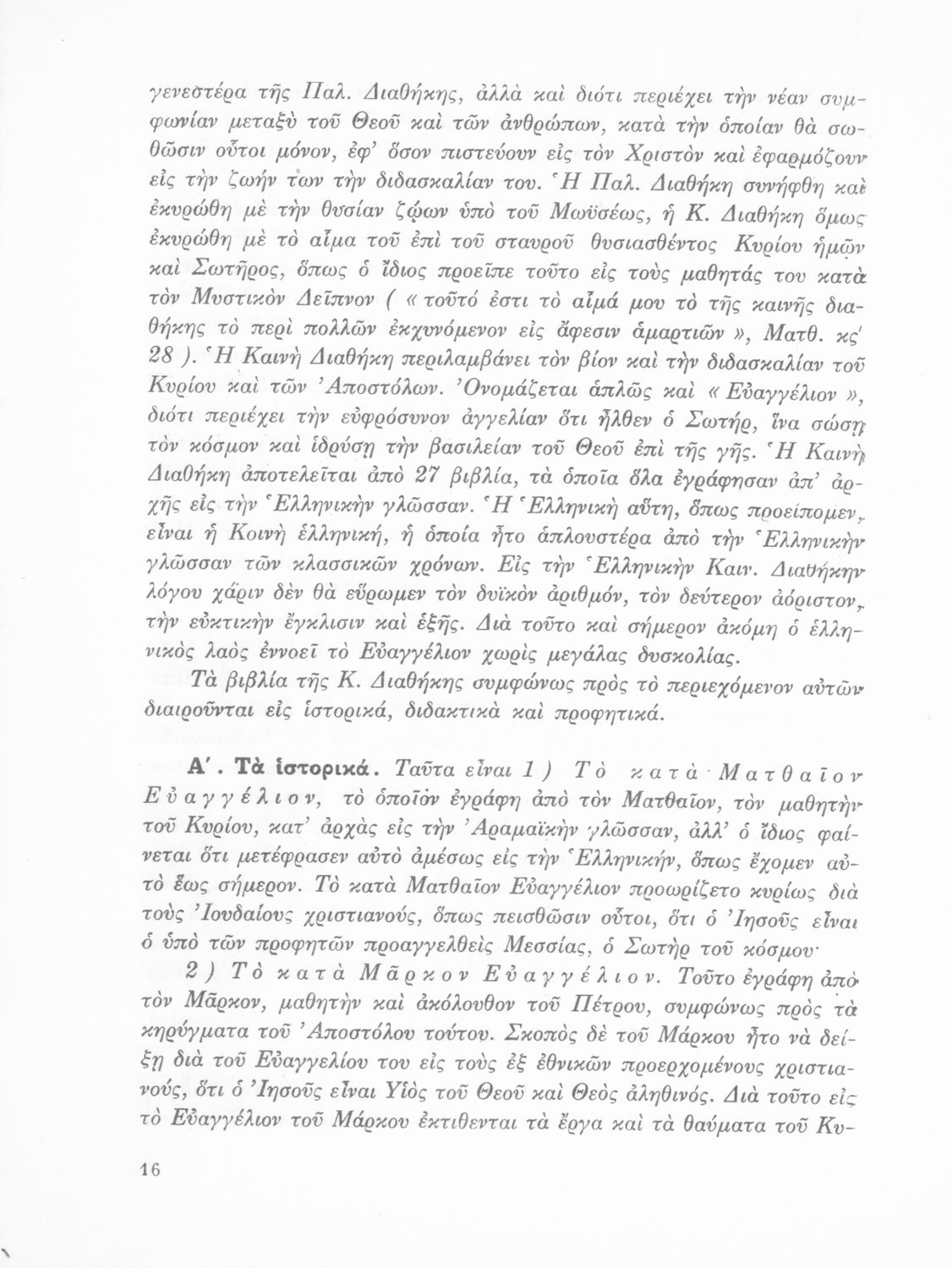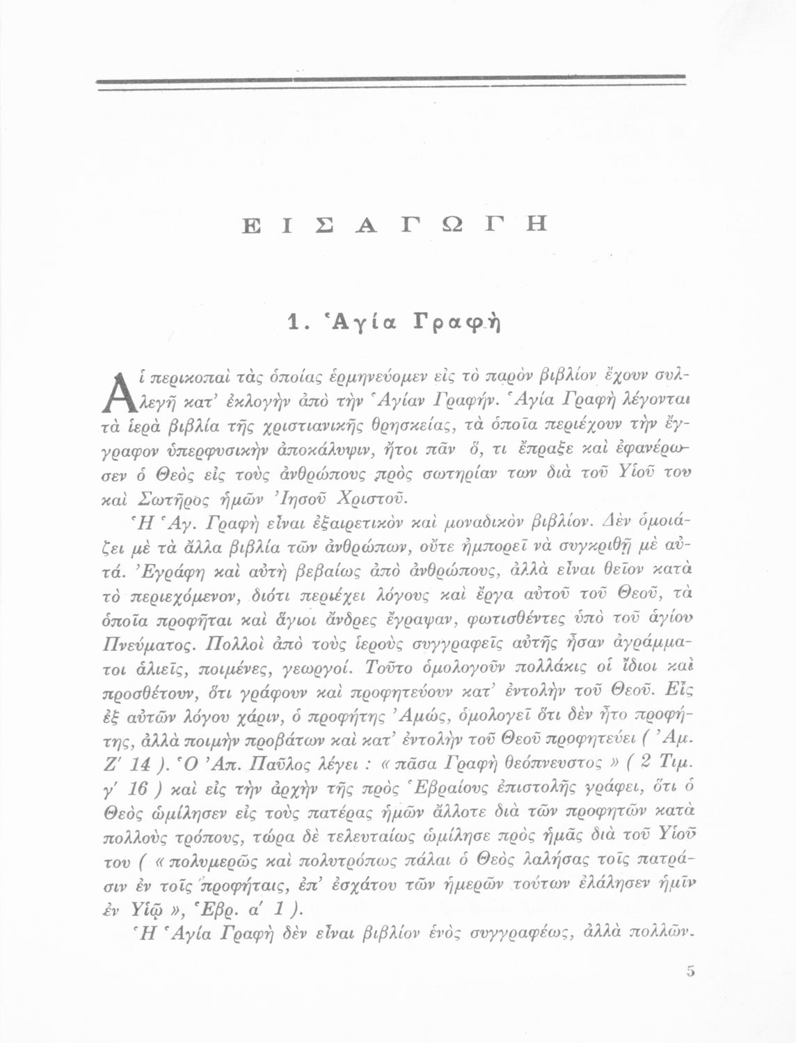 Σχολικό εγχειρίδιο Θρησκευτικών που περιλαμβάνει εισαγωγικά σχόλια στα βιβλία της Παλαιάς και Καινής Διαθήκης, περικοπές, ερμηνευτικές και πραγματολογικές σημειώσεις και πίνακα με τα κυριότερα ονόματα.