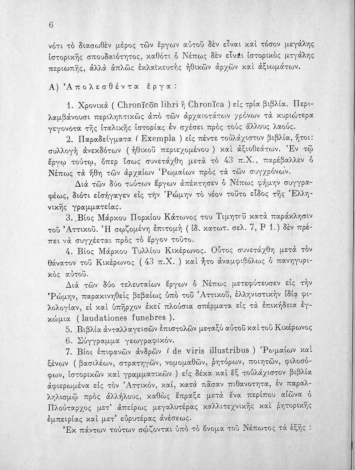 Σχολικό εγχειρίδιο Λατινικών για την Δ΄ Γυμνασίου παλαιού τύπου και την Ε΄ Γυμνασίου νέου τύπου που περιέχει σύντομο βιογραφικό σημείωμα του Νέπωτα, αποσπάσματα από τα έργα Αμίλκας, Αννίβας, Κάτων και Αττικός ...