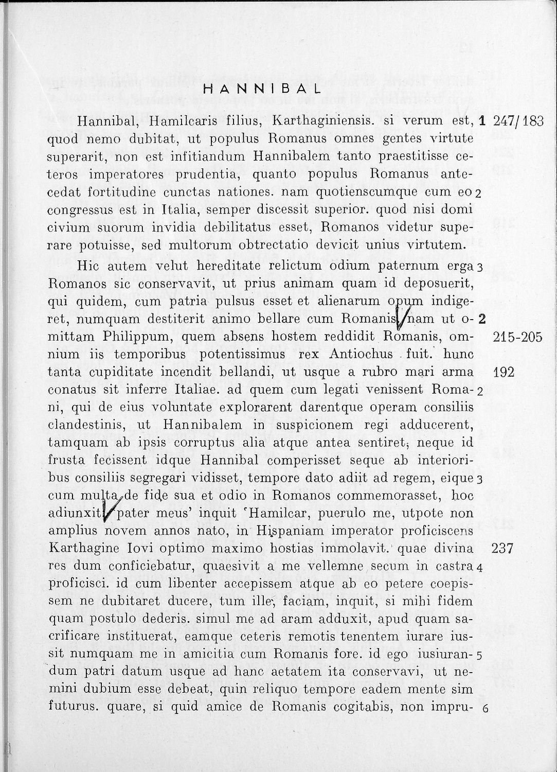 Σχολικό εγχειρίδιο Λατινικών Ε΄ Γυμνασίου που περιέχει σύντομο βιογραφικό σημείωμα του Νέπωτα, αποσπάσματα από τα έργα Αμίλκας, Αννίβας, Κάτων και Αττικός, ιστορικό και γεωγραφικό πίνακα και λεξιλόγιο.