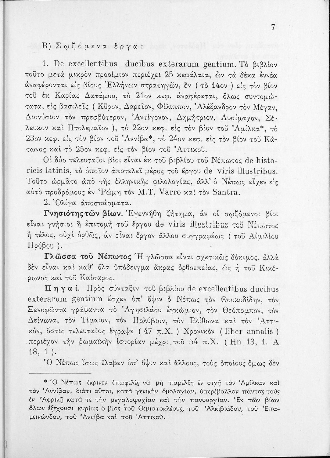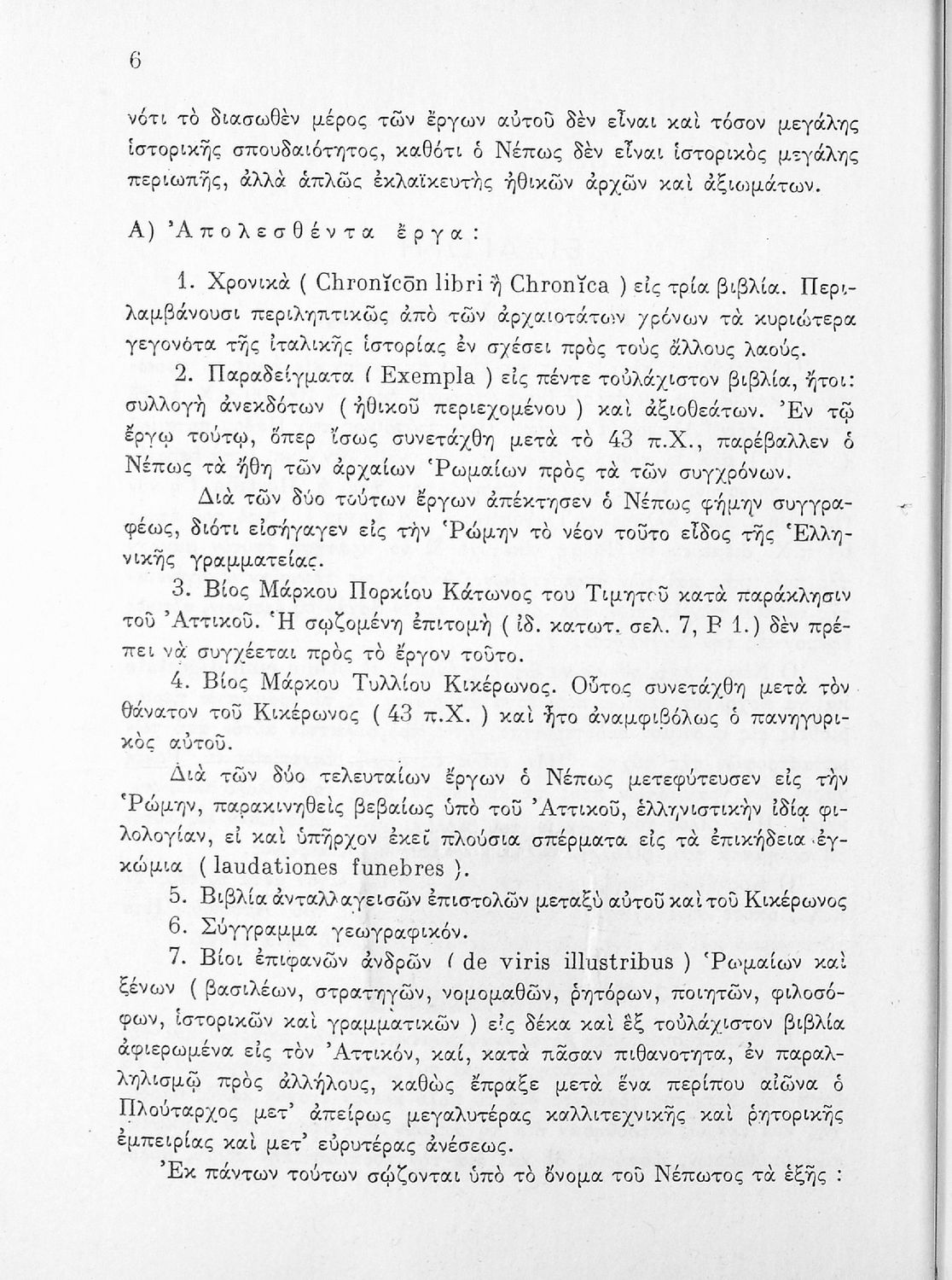 Σχολικό εγχειρίδιο Λατινικών που περιέχει σύντομο βιογραφικό σημείωμα του Νέπωτα, αποσπάσματα από τα έργα Αμίλκας, Αννίβας, Κάτων και Αττικός, ιστορικό και γεωγραφικό πίνακα και λεξιλόγιο. Ο συγγραφέας ήταν ακαδημαϊκός και καθηγητής της Λατινικής Φιλολογίας στο Πανεπιστήμιο Αθηνών.