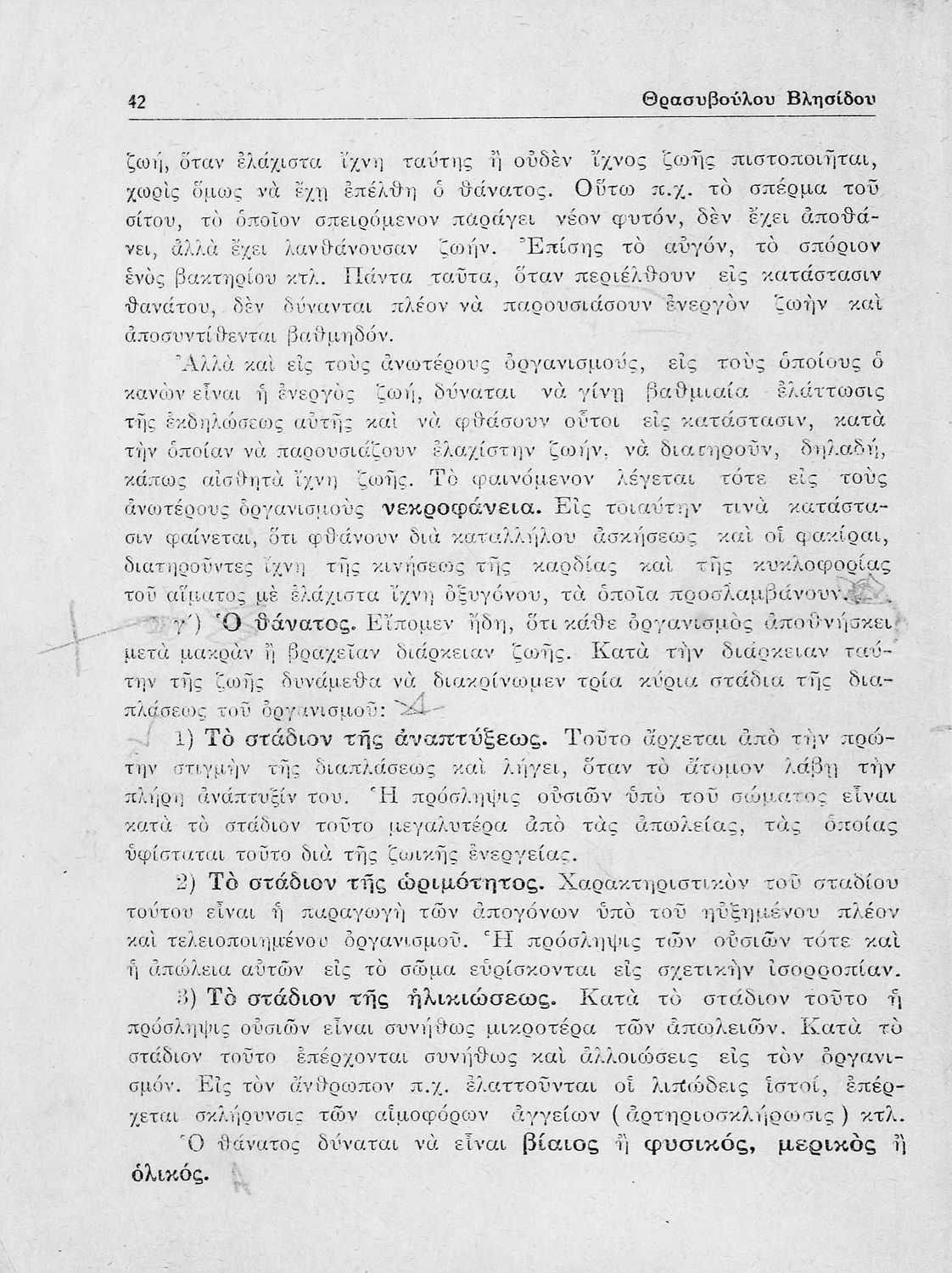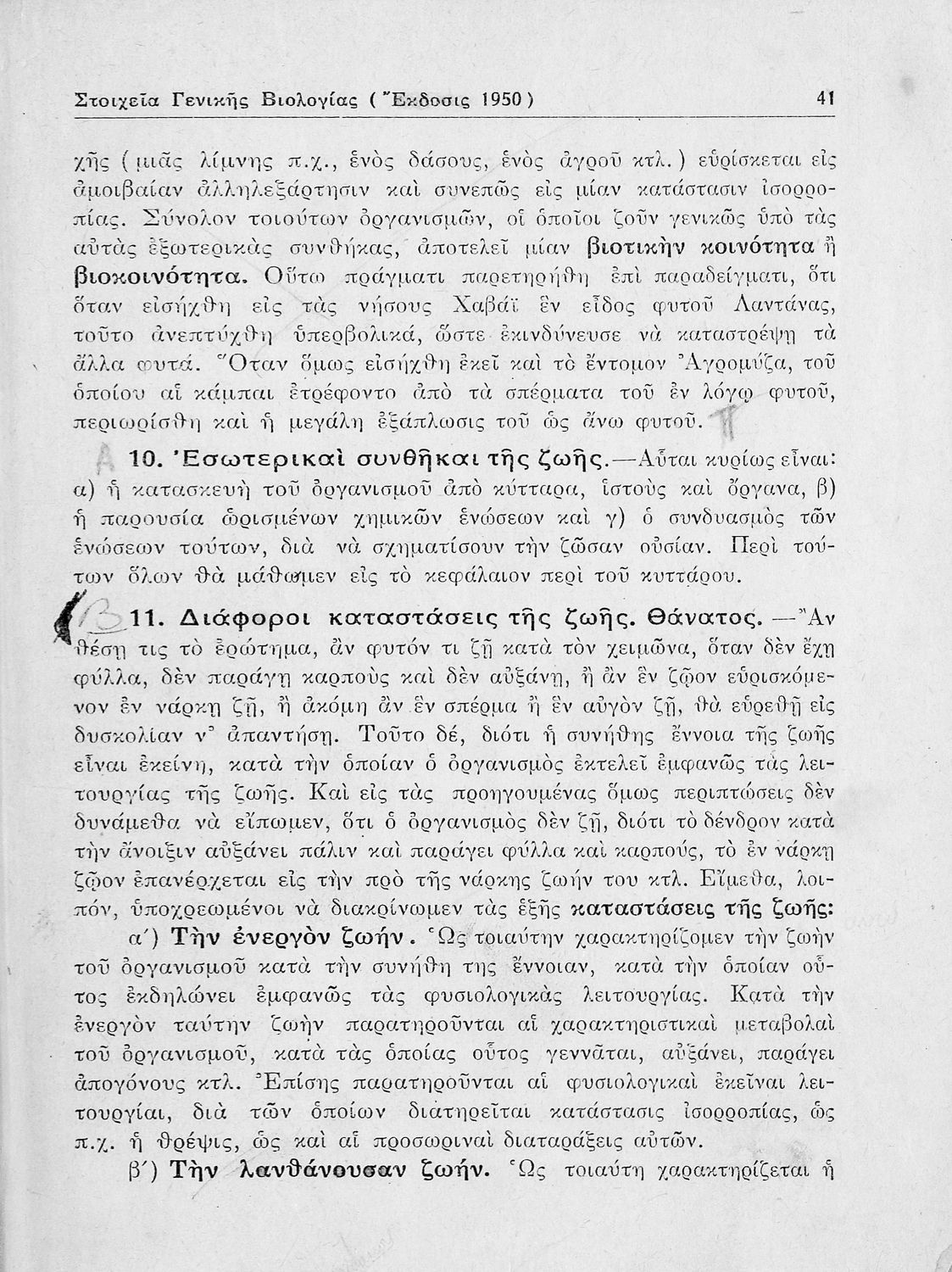 Σχολικό εγχειρίδιο Βιολογίας Δ΄ Γυμνασίου που εστιάζει στις συνθήκες γέννησης, μεταβολής και θανάτου των έμβιων οργανισμών. Ο συγγραφέας ήταν καθηγητής της γενικής Βιολογίας στο Πανεπιστήμιο Αθηνών.
