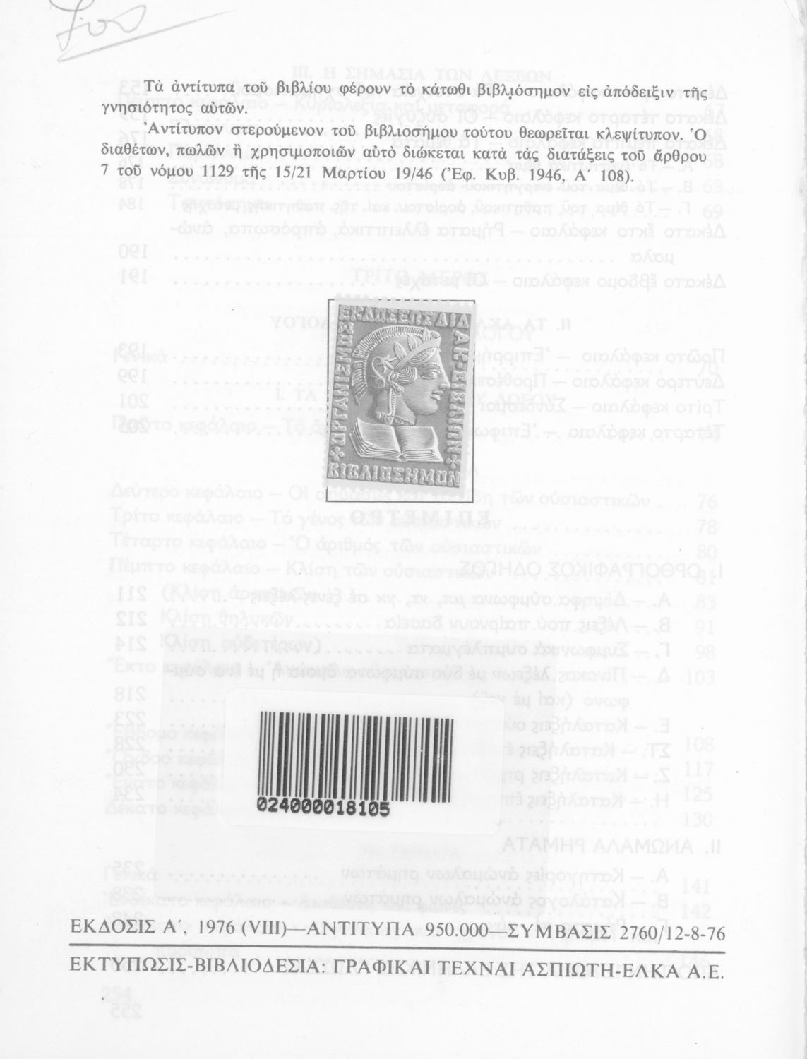 Γραμματικής Νέων Ελληνικών για τις τάξεις του Δημοτικού. Στο βιβλίο παρουσιάζονται οι βασικοί κανόνες γραμματικής και συντακτικού της ελληνικής γλώσσας.