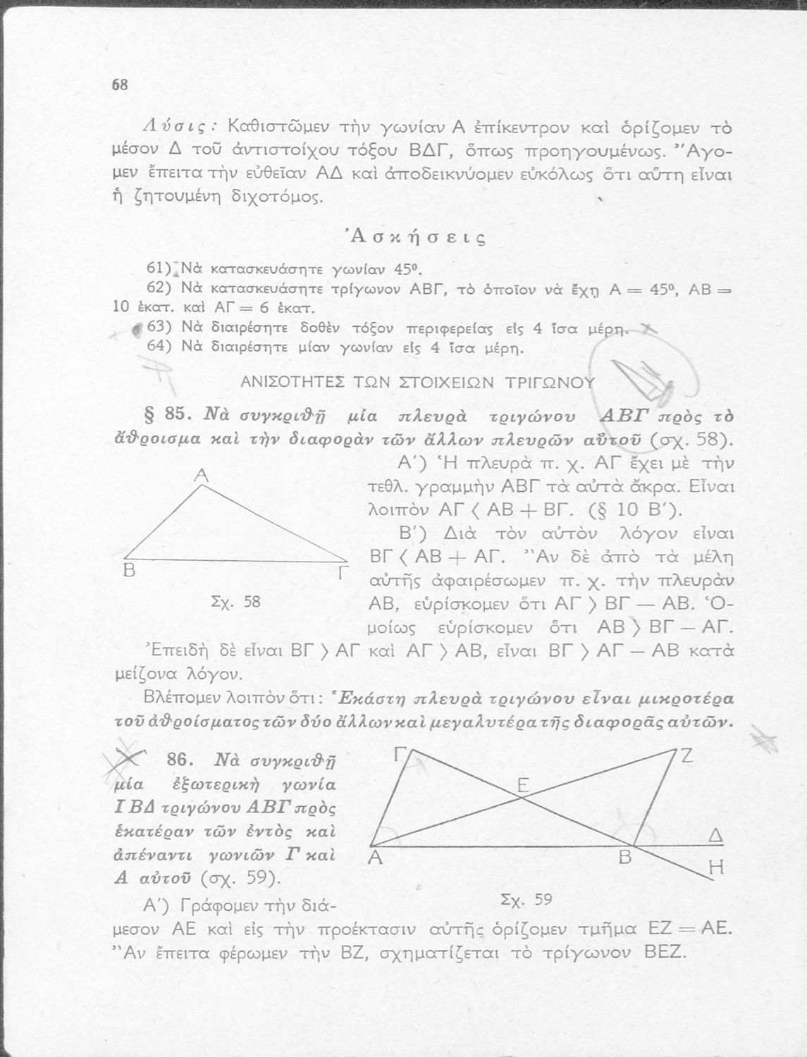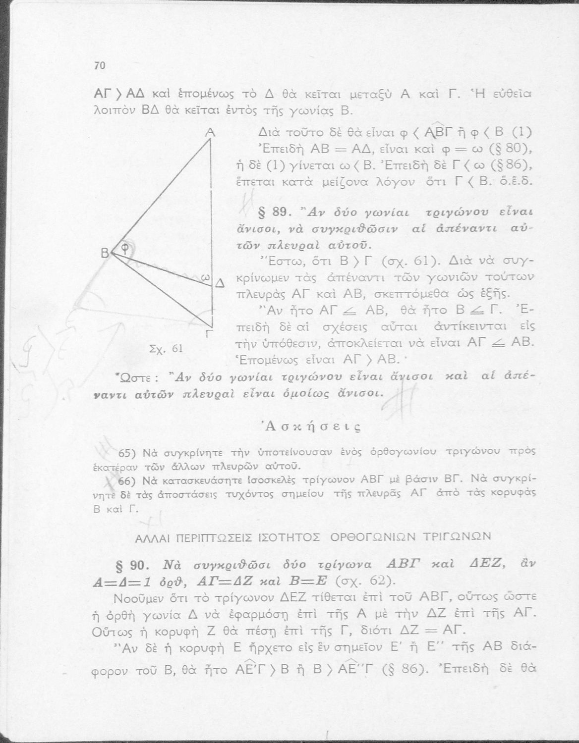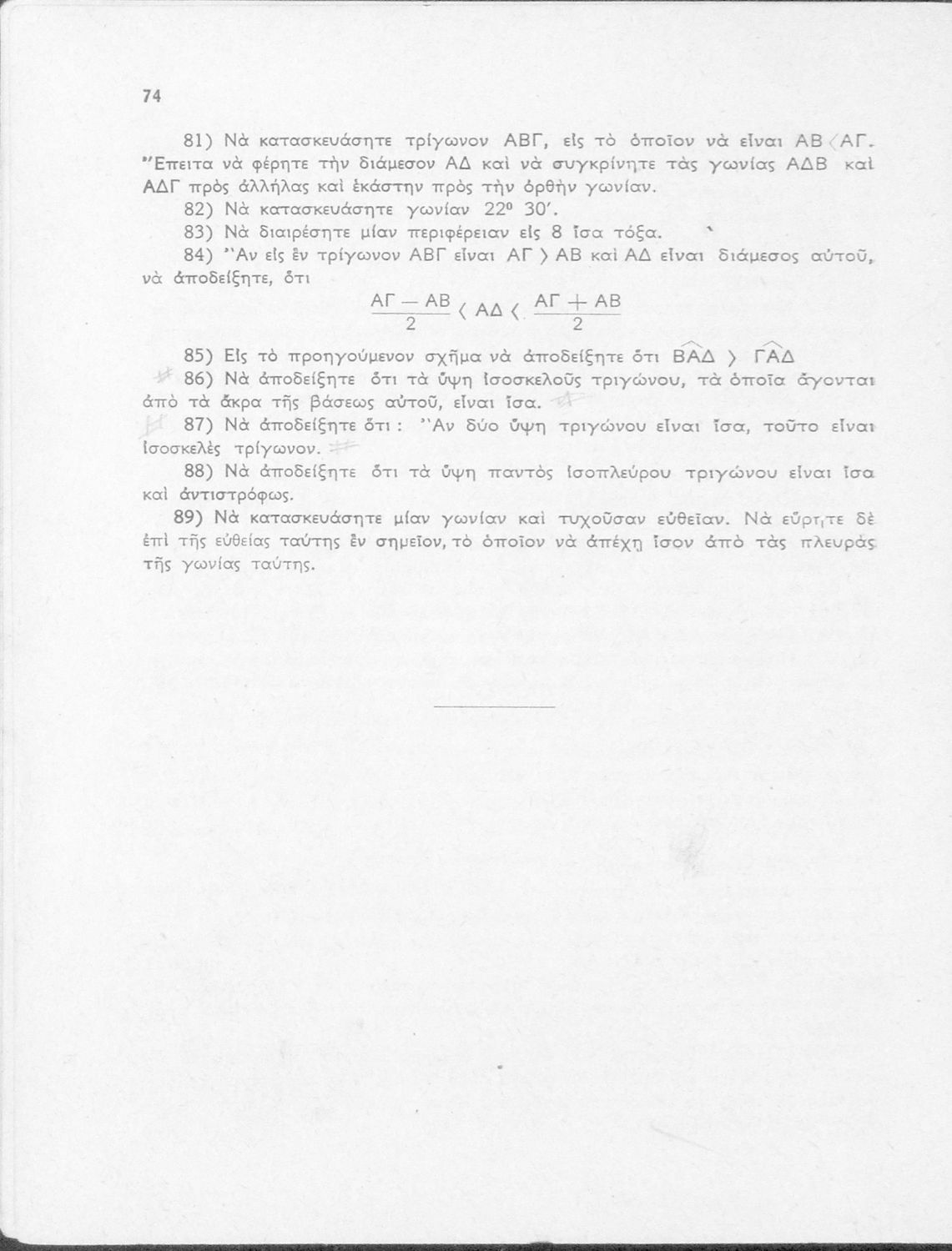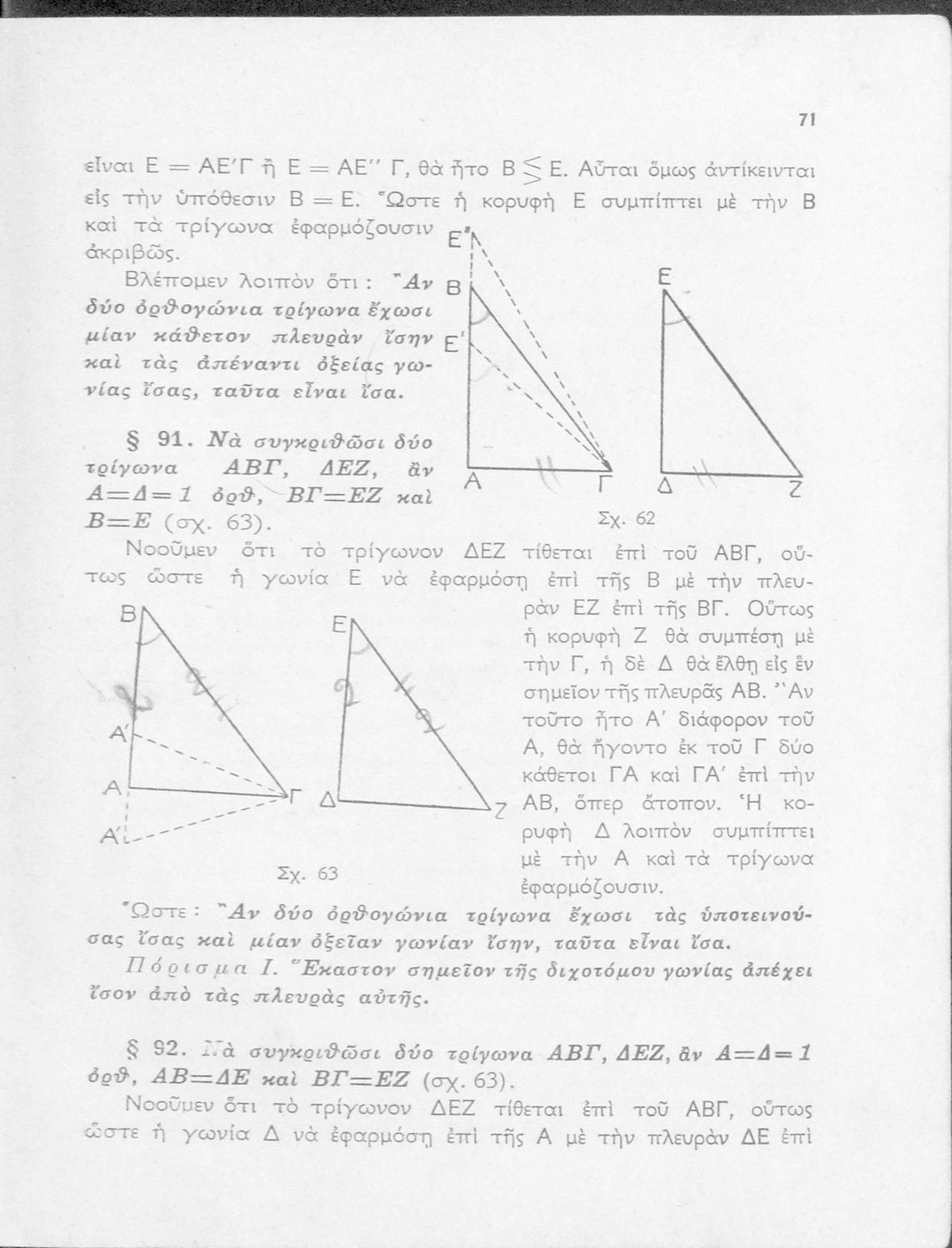 Σχολικό εγχειρίδιο Γεωμετρίας Γυμνασίου που είναι χωρισμένο σε θεωρήματα και ασκήσεις και εστιάζει στα βασικά θεωρήματα και ιδιότητες των γεωμετρικών σχημάτων. .