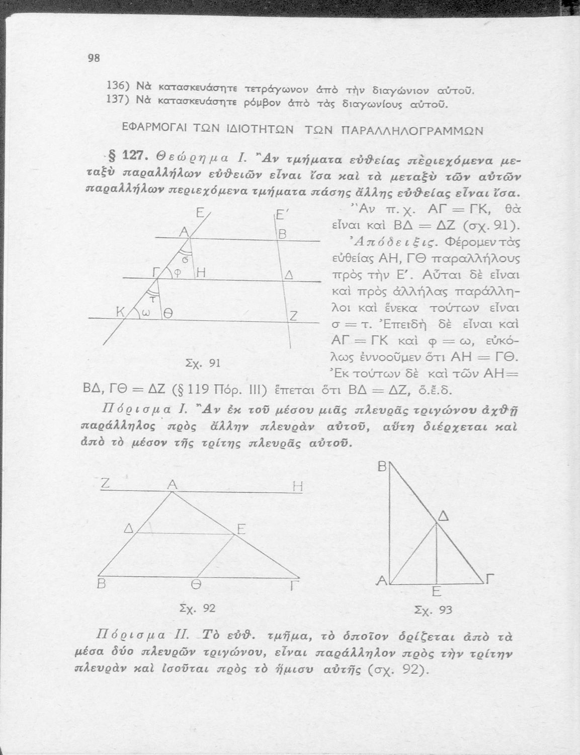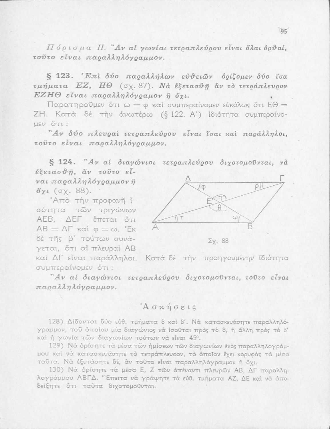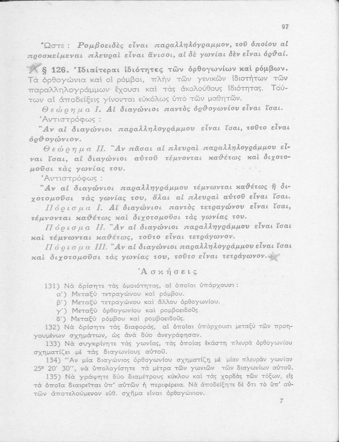 Σχολικό εγχειρίδιο Γεωμετρίας Γυμνασίου που είναι χωρισμένο σε θεωρήματα και ασκήσεις και εστιάζει στα βασικά θεωρήματα και ιδιότητες των γεωμετρικών σχημάτων. .
