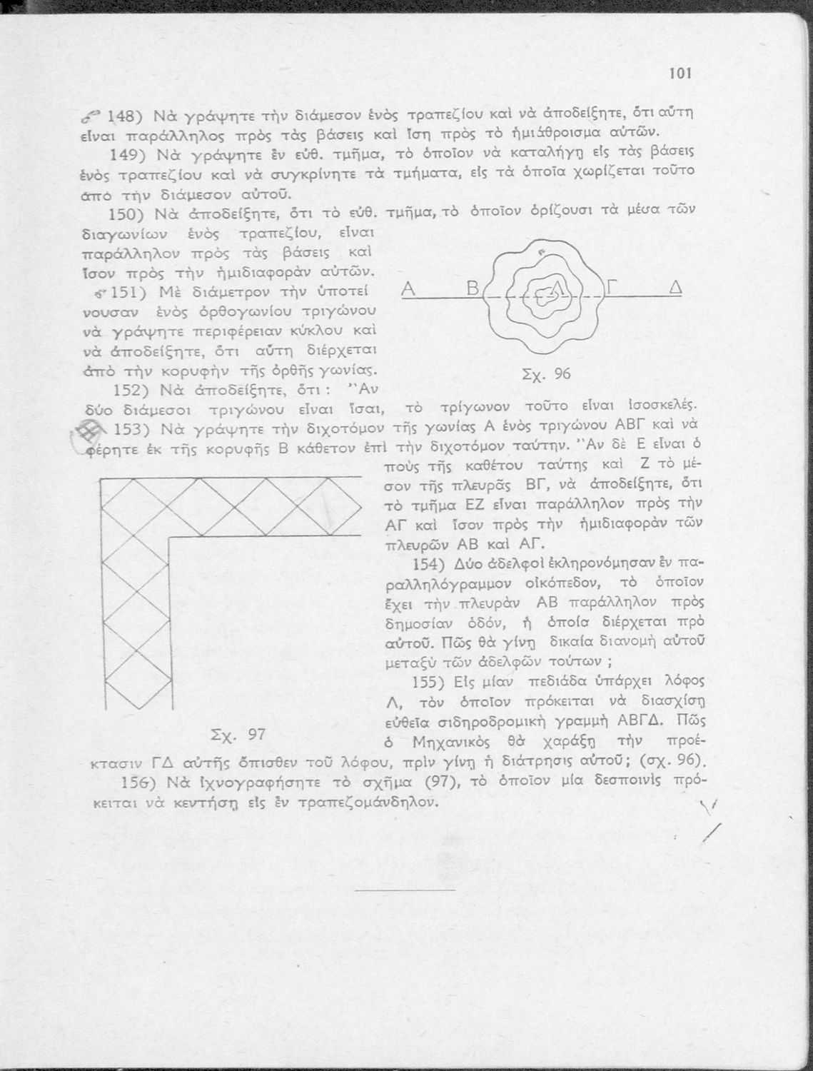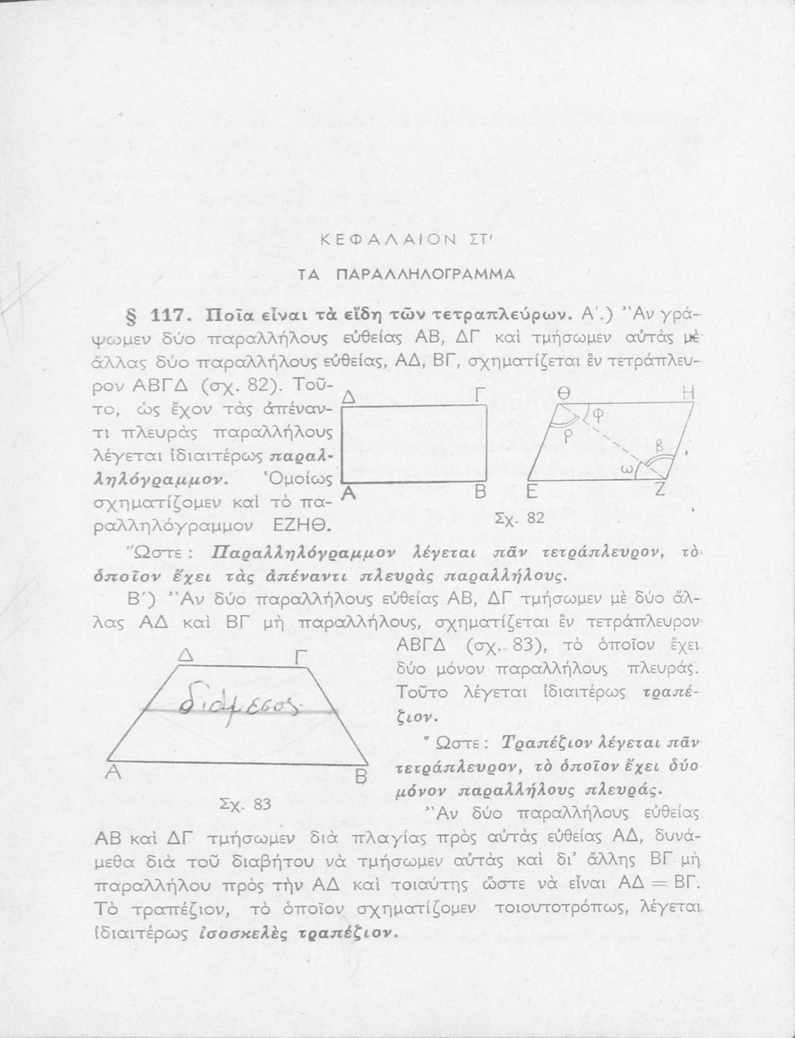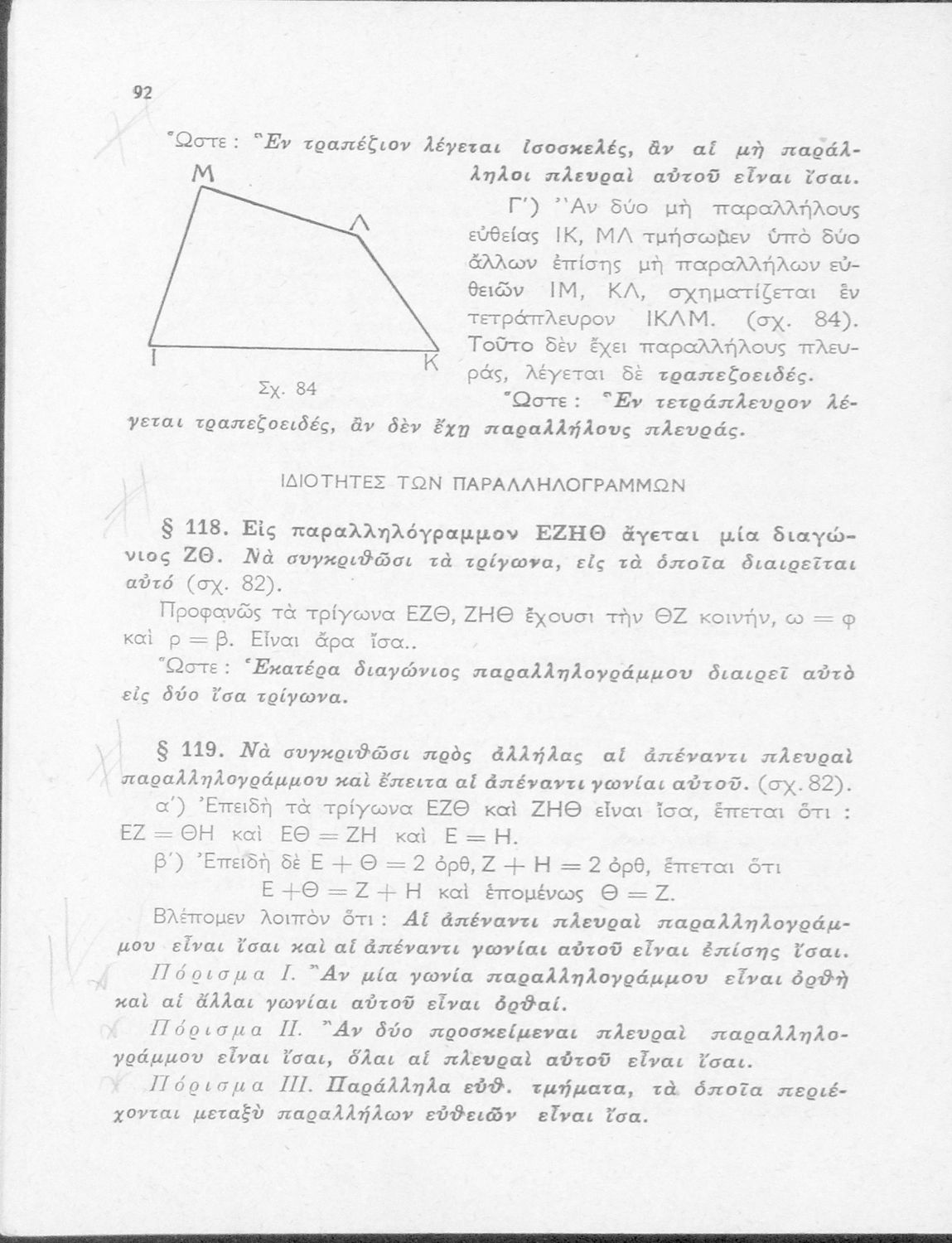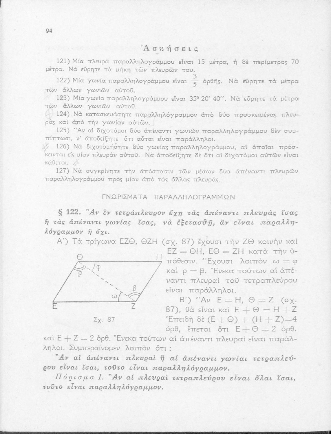 Σχολικό εγχειρίδιο Γεωμετρίας Γυμνασίου που είναι χωρισμένο σε θεωρήματα και ασκήσεις και εστιάζει στα βασικά θεωρήματα και ιδιότητες των γεωμετρικών σχημάτων. .