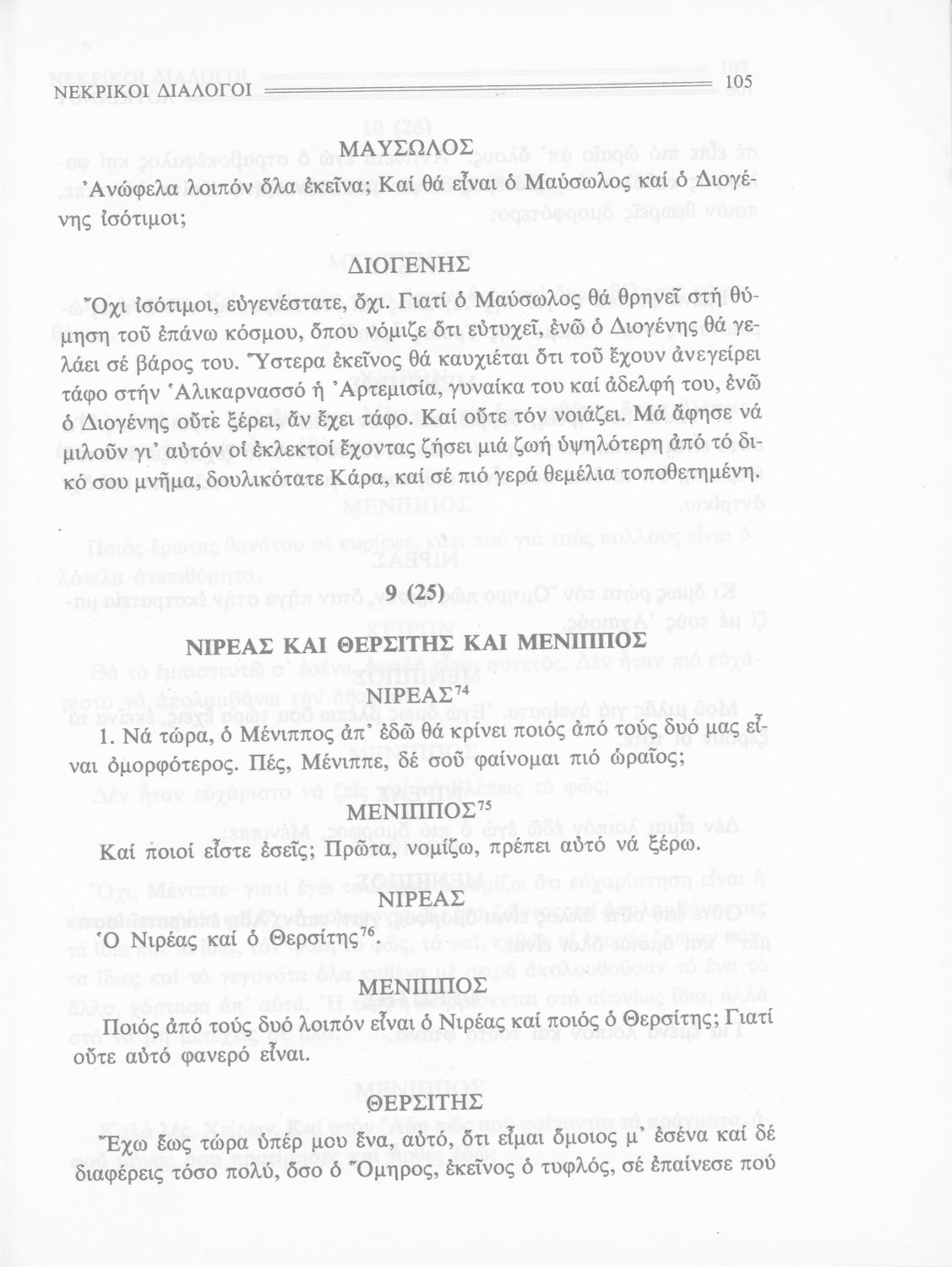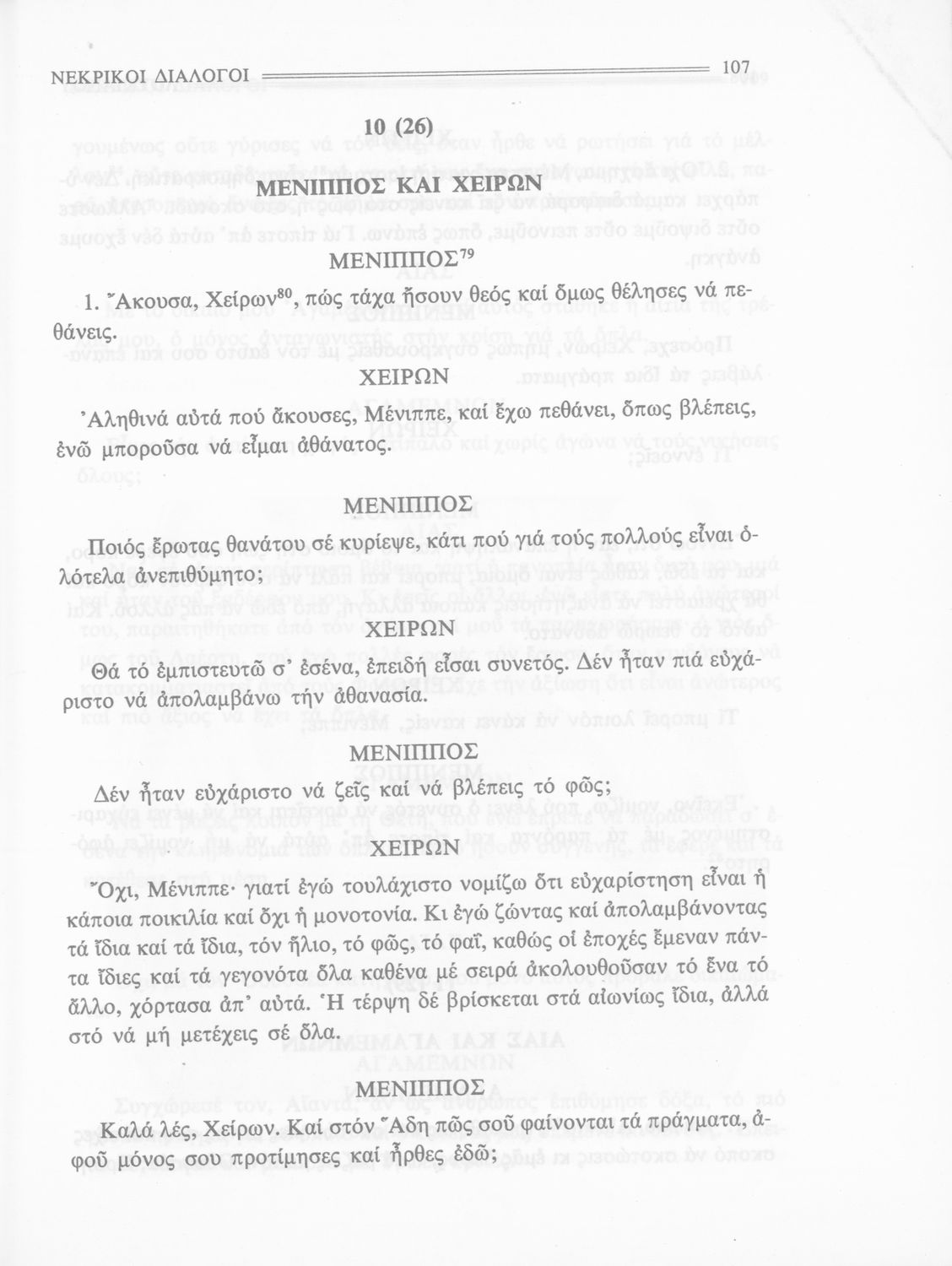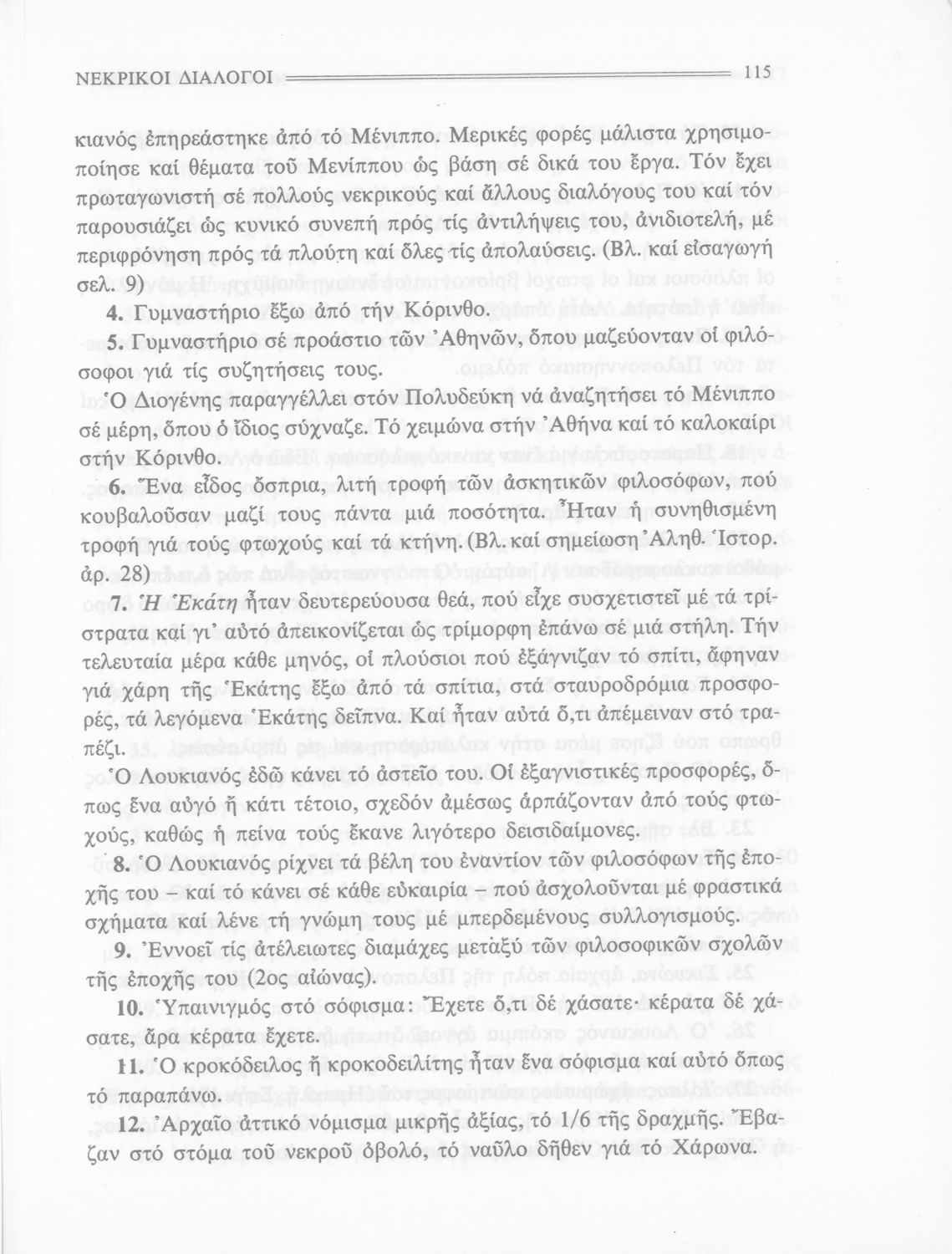 Σχολικό εγχειρίδιο Αρχαίων Ελληνικών Α΄ Γυμνασίου που περιλαμβάνει εισαγωγή στη ζωή και το έργο του Λουκιανού, αποσπάσματα από του Νεκρικούς διαλόγους και ερμηνευτικές σημειώσεις.