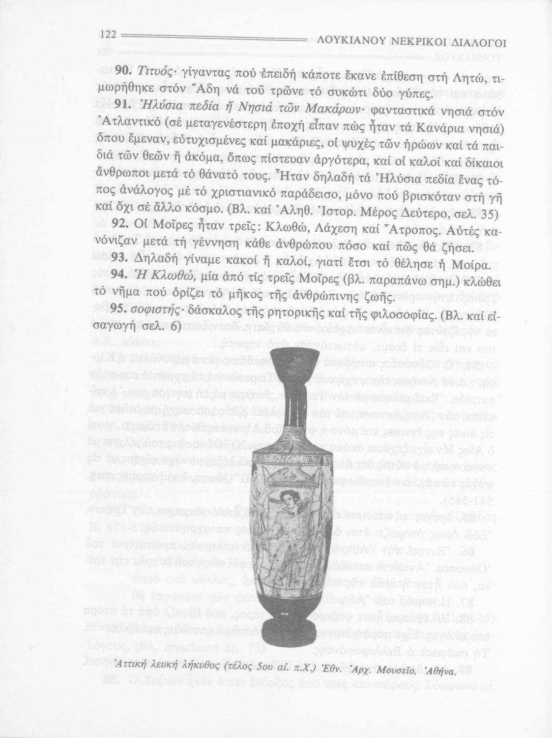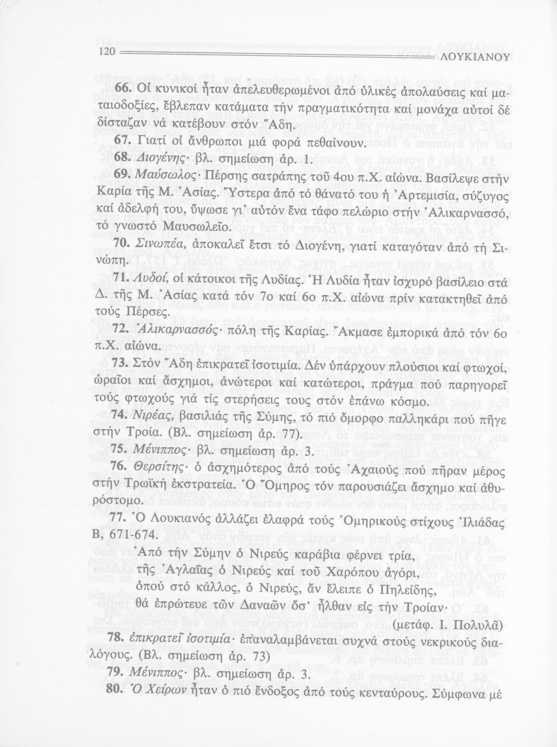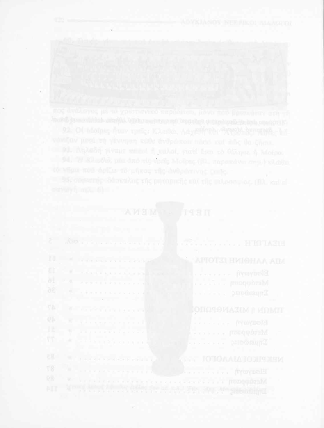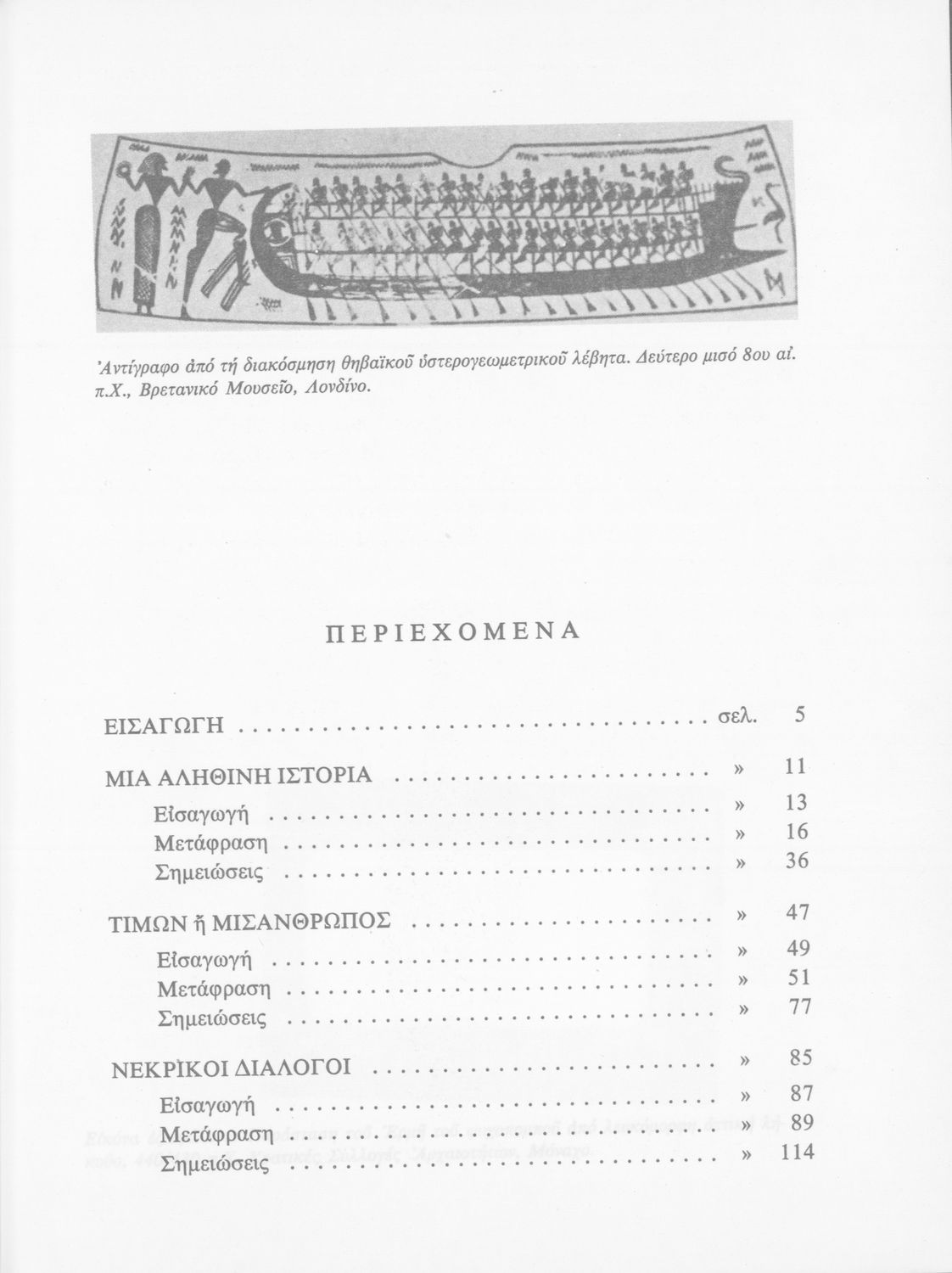 Σχολικό εγχειρίδιο Αρχαίων Ελληνικών Α' Γυμνασίου που περιέχει εισαγωγή στην ζωή και το έργο του Λουκιανού, τα έργα του Μία αληθινή ιστορία, Τιμών ή Μισάνθρωπος, Νεκρικοί Διάλογοι και ερμηνευτικές σημειώσεις.