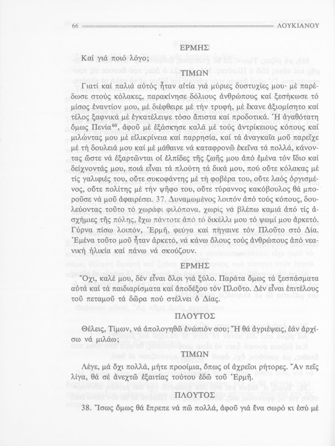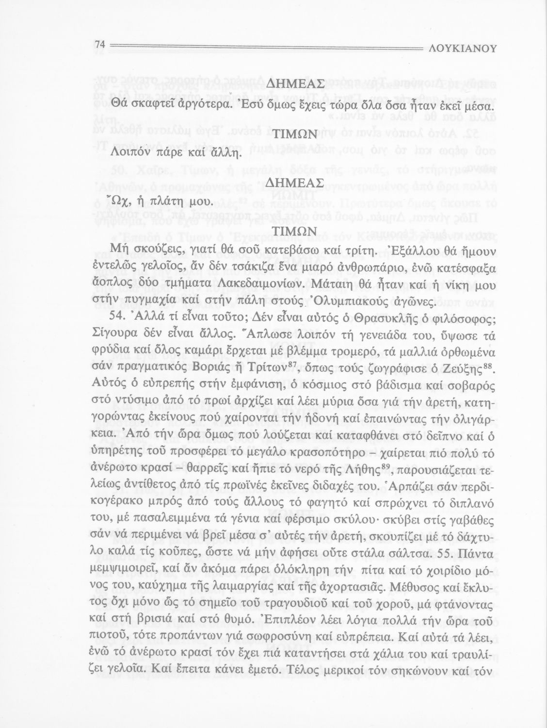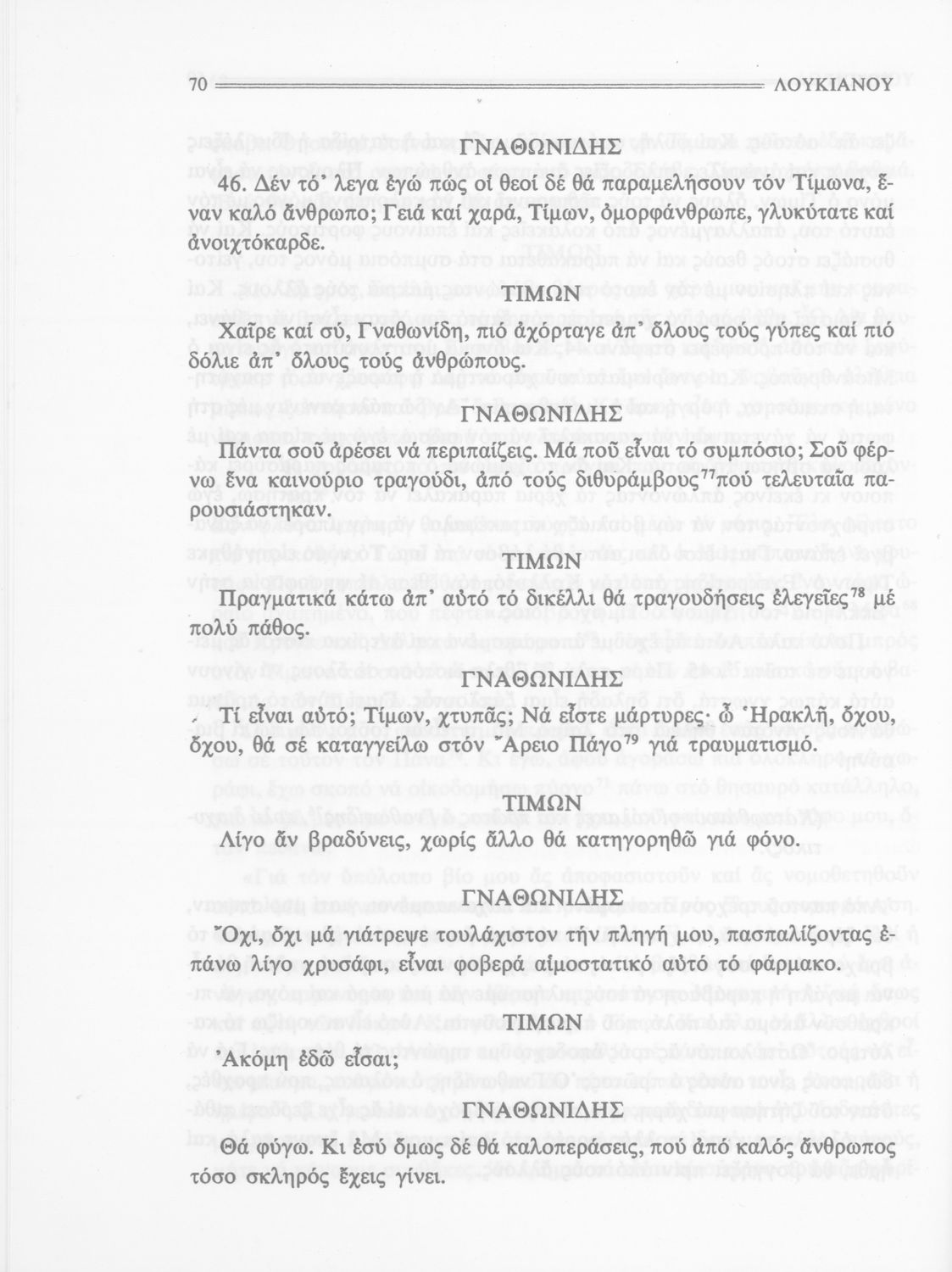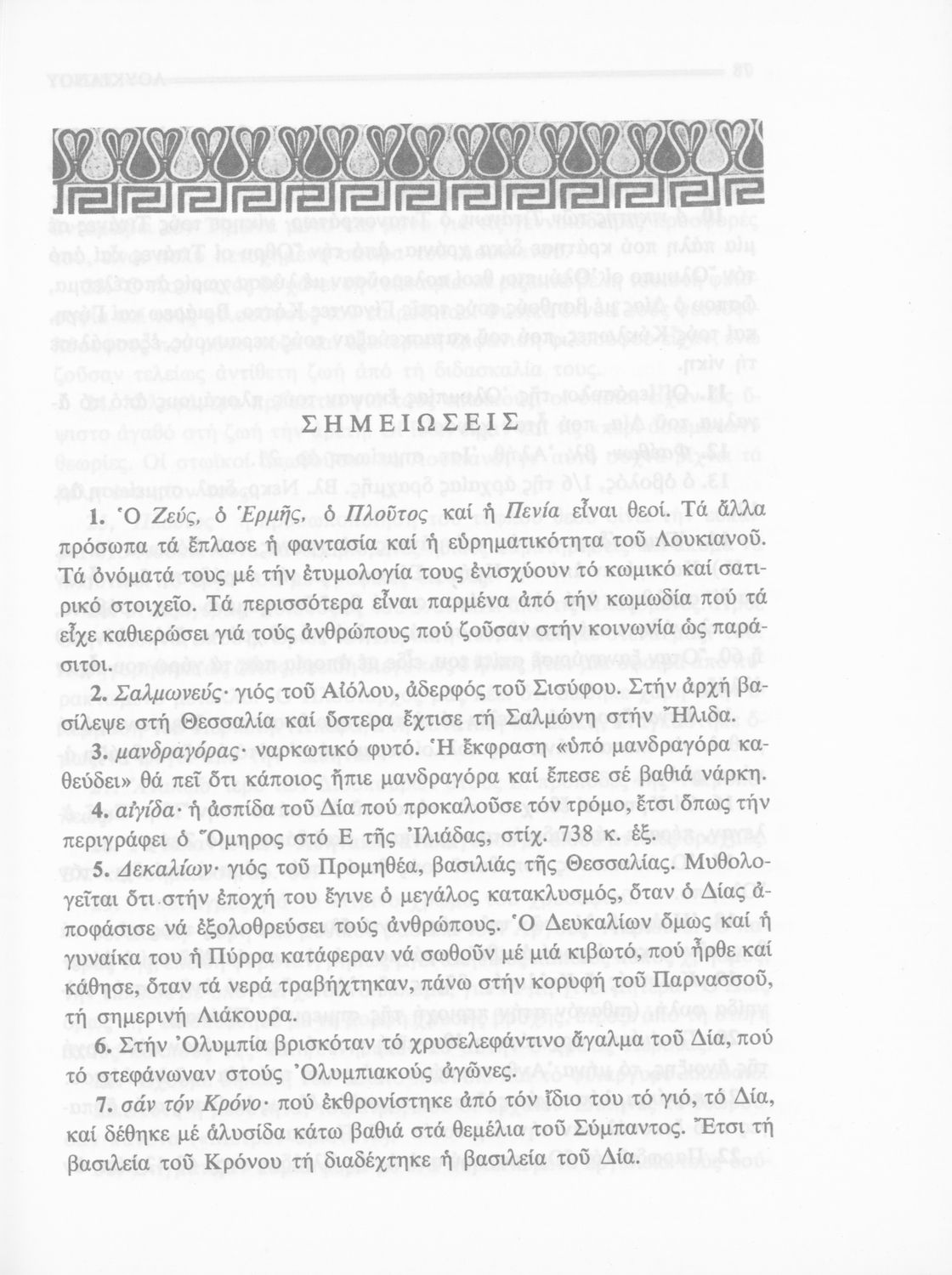 Σχολικό εγχειρίδιο Αρχαίων Ελληνικών Α' Γυμνασίου που περιέχει εισαγωγή στην ζωή και το έργο του Λουκιανού, τα έργα του Μία αληθινή ιστορία, Τιμών ή Μισάνθρωπος, Νεκρικοί Διάλογοι και ερμηνευτικές σημειώσεις.