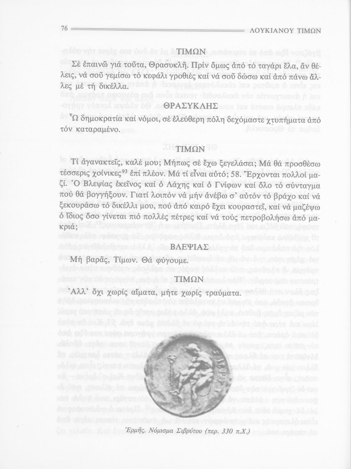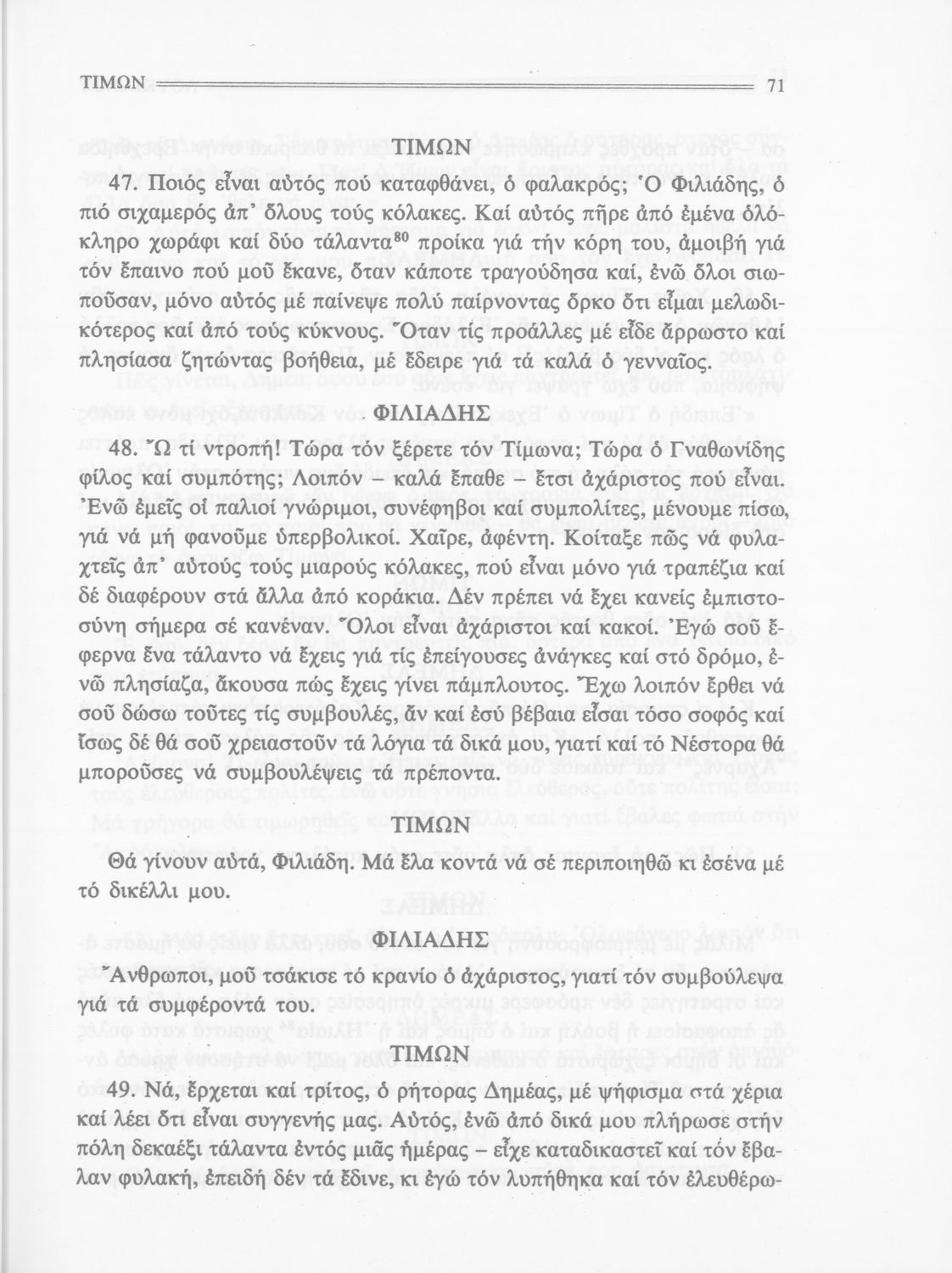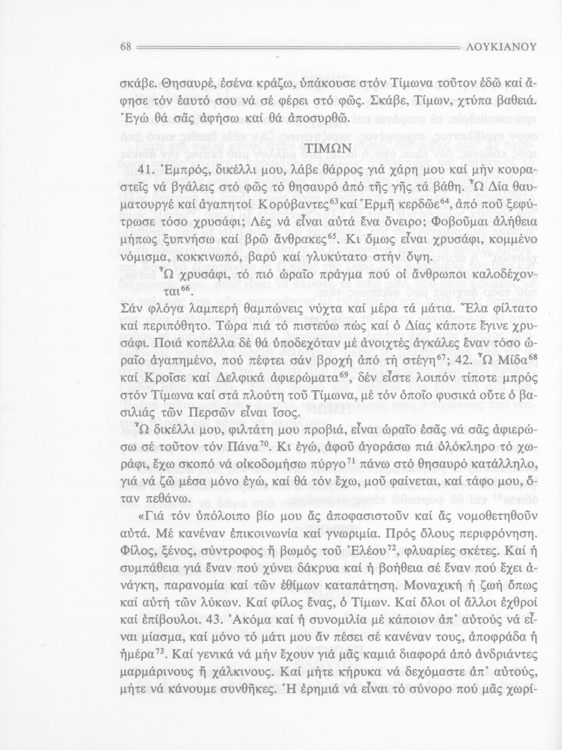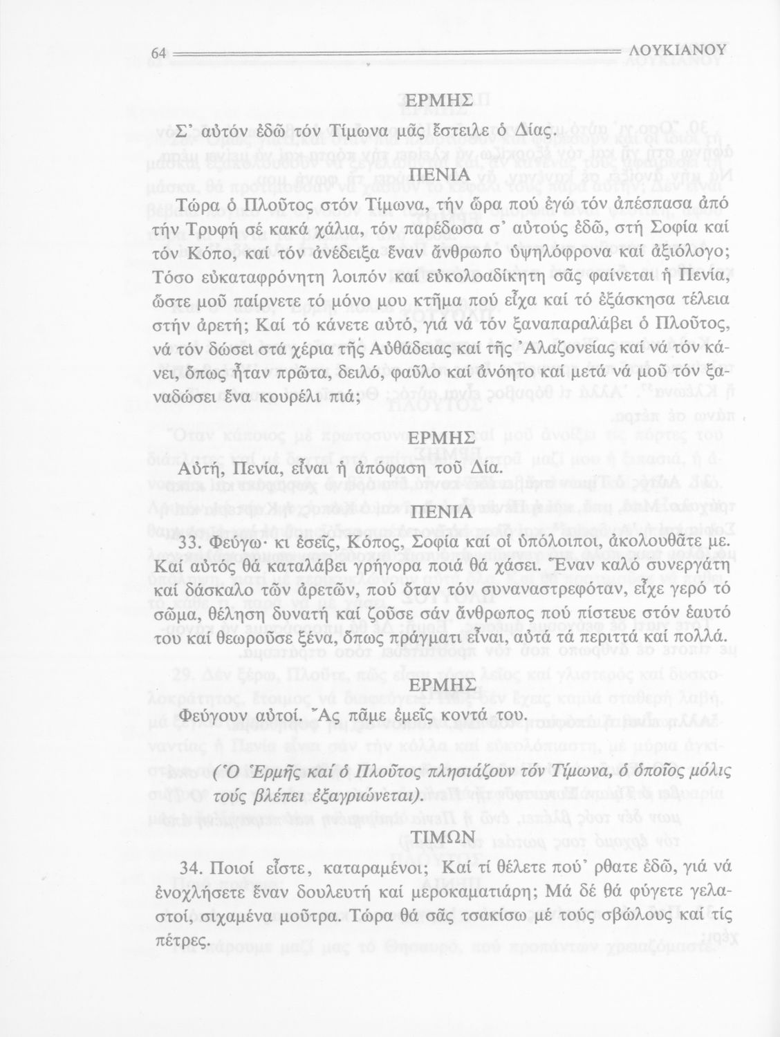 Σχολικό εγχειρίδιο Αρχαίων Ελληνικών Α' Γυμνασίου που περιέχει εισαγωγή στην ζωή και το έργο του Λουκιανού, τα έργα του Μία αληθινή ιστορία, Τιμών ή Μισάνθρωπος, Νεκρικοί Διάλογοι και ερμηνευτικές σημειώσεις.