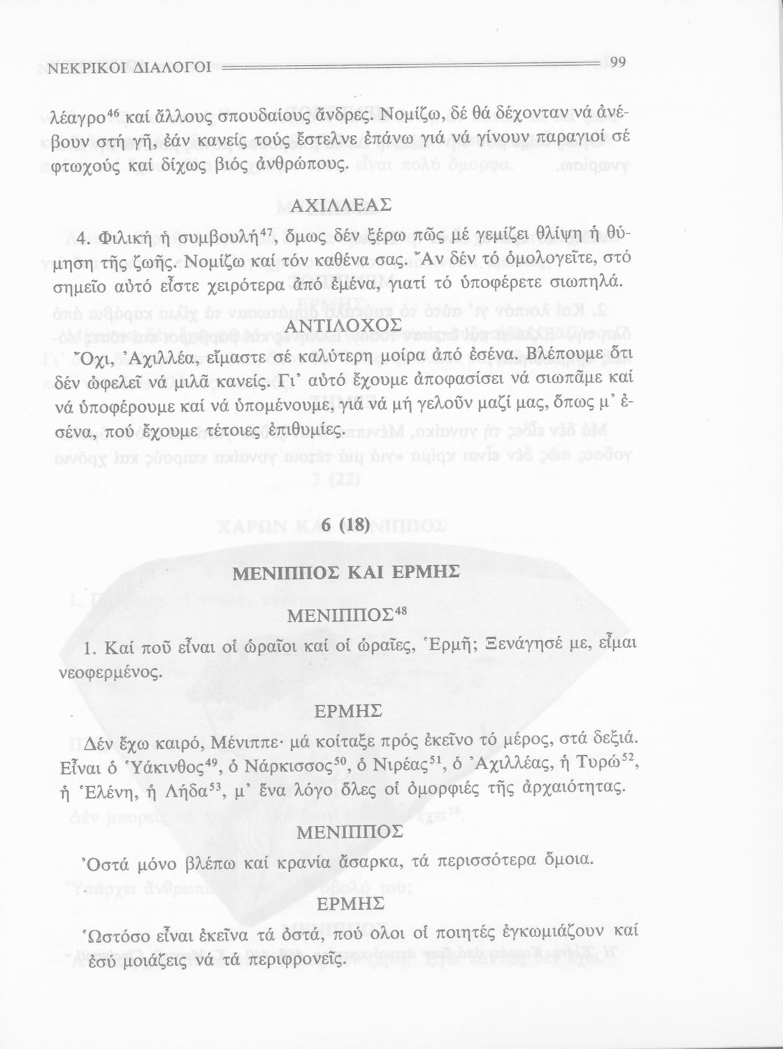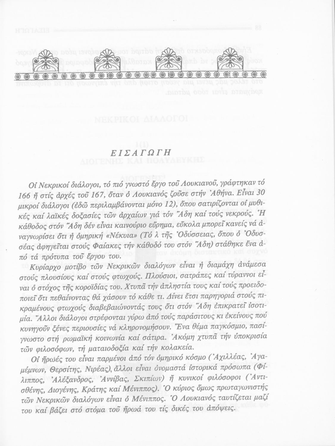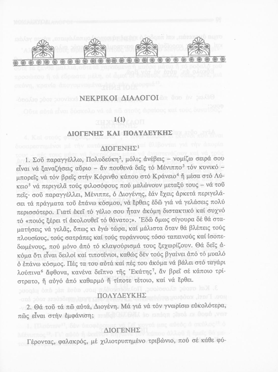 Σχολικό εγχειρίδιο Αρχαίων Ελληνικών Α΄ Γυμνασίου που περιλαμβάνει εισαγωγή στη ζωή και το έργο του Λουκιανού, αποσπάσματα από του Νεκρικούς διαλόγους και ερμηνευτικές σημειώσεις.