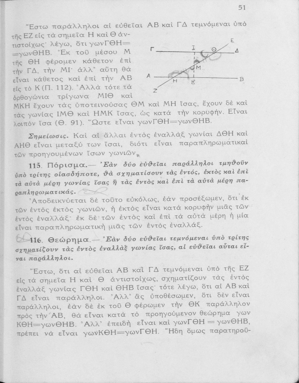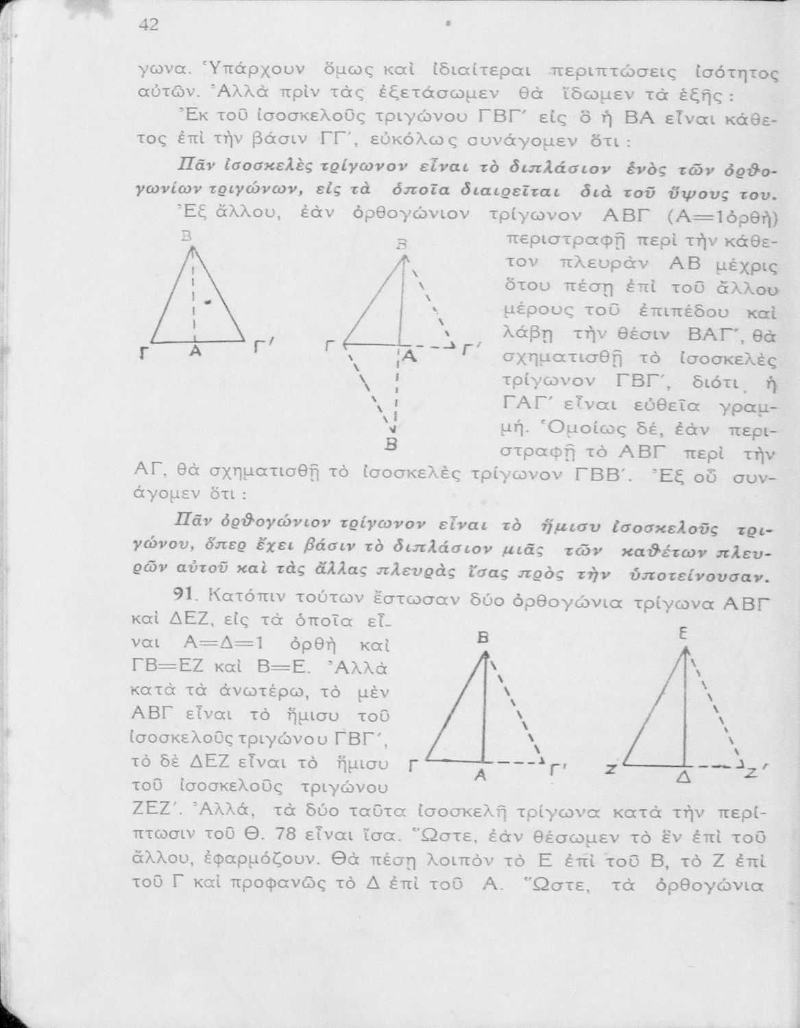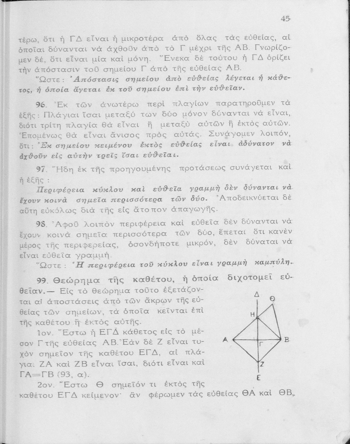 Σχολικό εγχειρίδιο Γεωμετρίας Γυμνασίου που είναι χωρισμένο σε θεωρήματα και ασκήσεις και εστιάζει στα βασικά θεωρήματα και ιδιότητες των γεωμετρικών σχημάτων. .