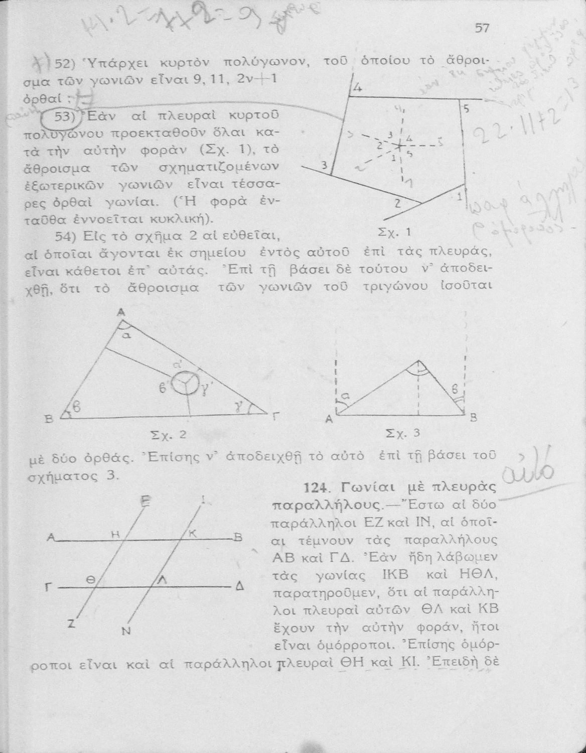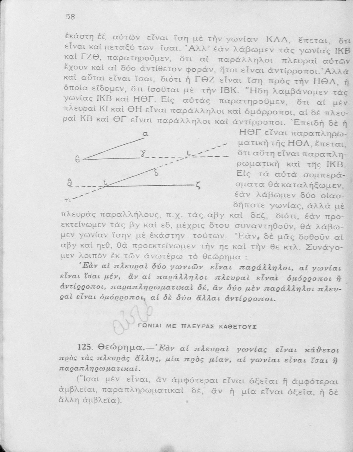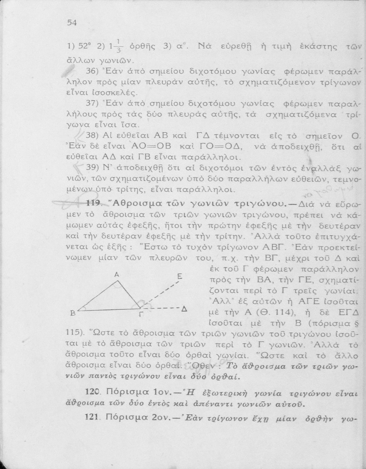 Σχολικό εγχειρίδιο Γεωμετρίας Γυμνασίου που είναι χωρισμένο σε θεωρήματα και ασκήσεις και εστιάζει στα βασικά θεωρήματα και ιδιότητες των γεωμετρικών σχημάτων. .