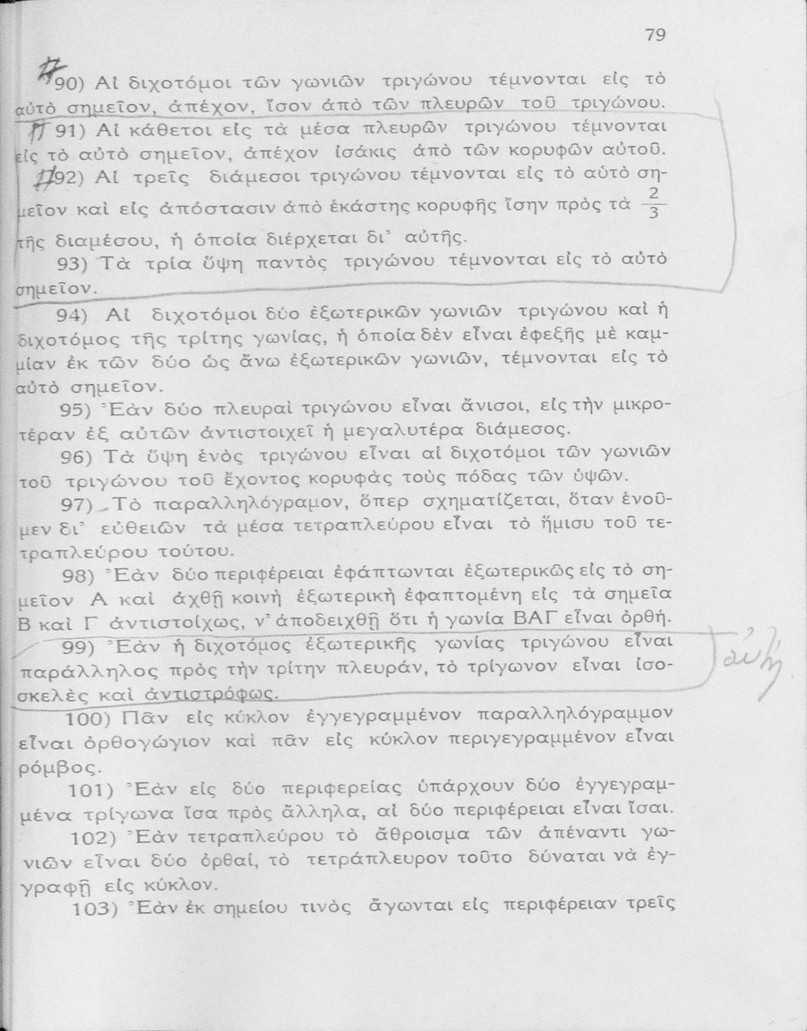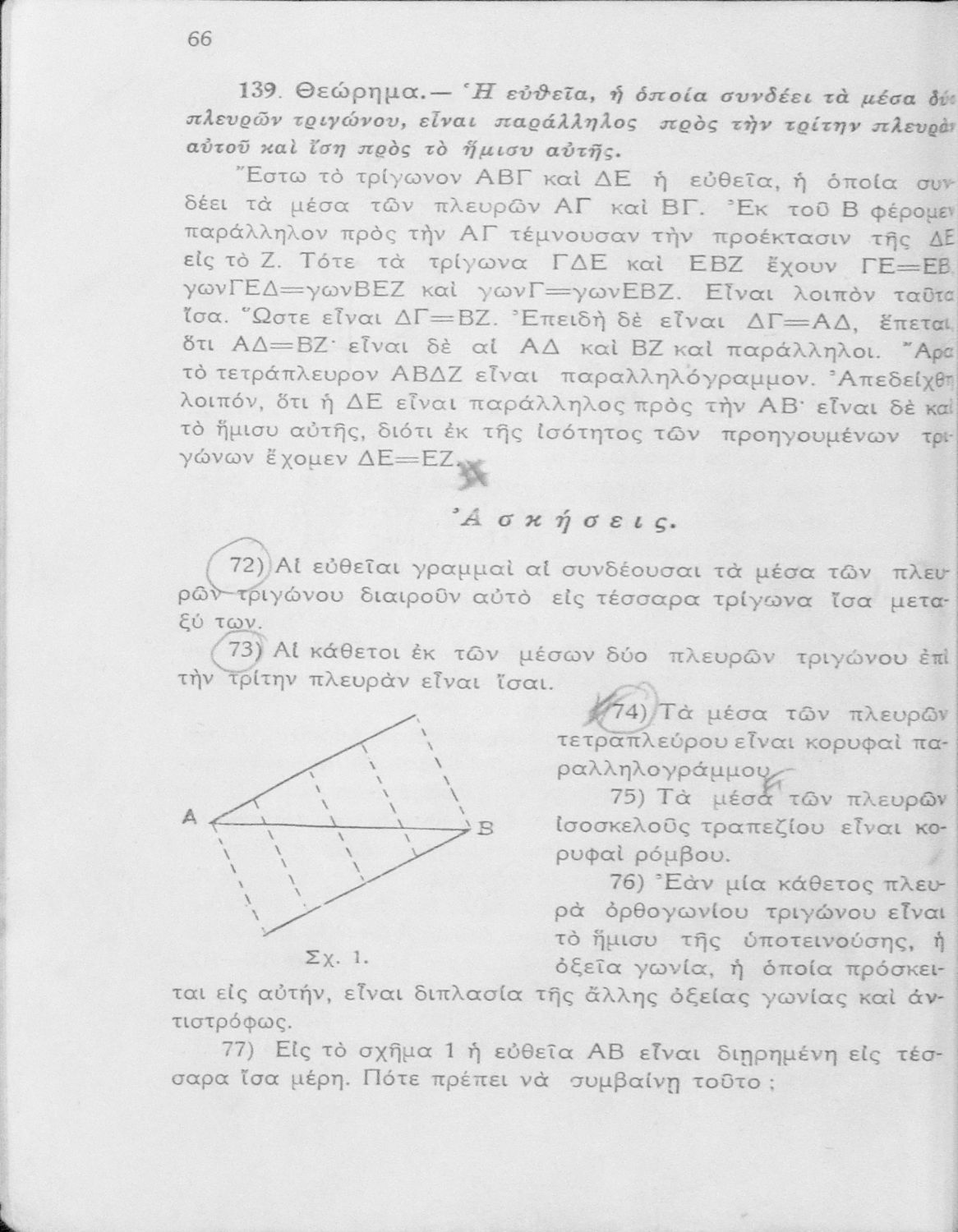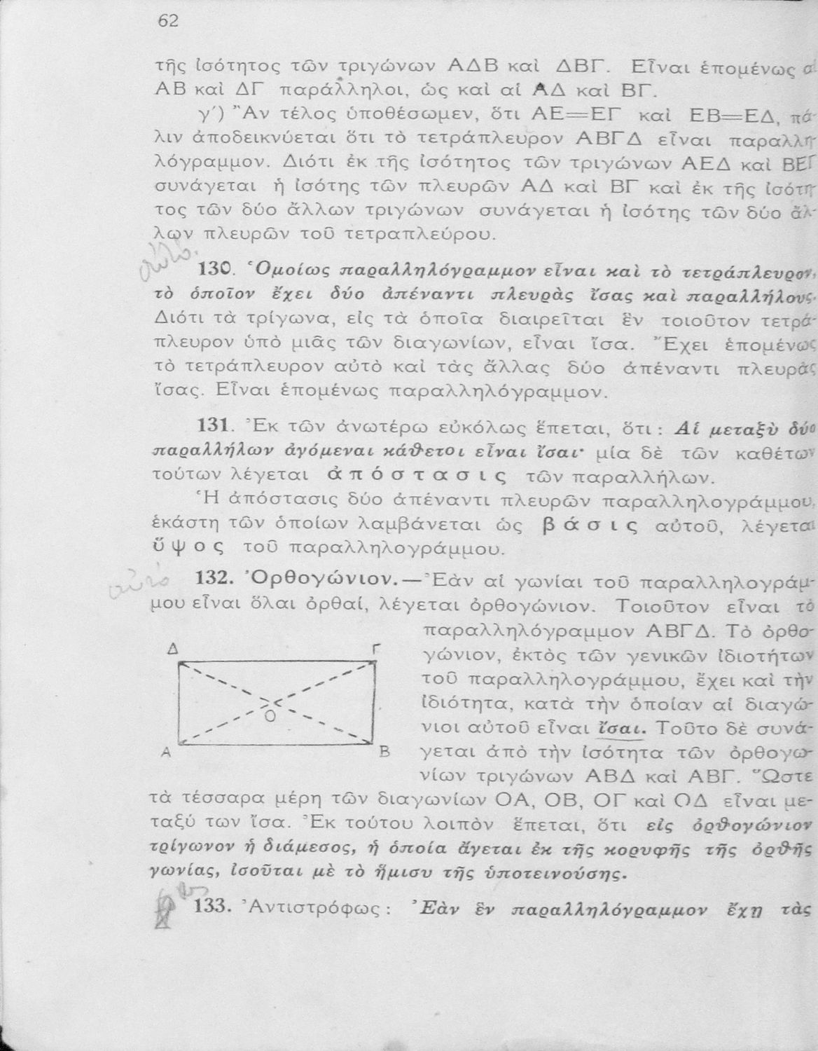 Σχολικό εγχειρίδιο Γεωμετρίας Γυμνασίου που είναι χωρισμένο σε θεωρήματα και ασκήσεις και εστιάζει στα βασικά θεωρήματα και ιδιότητες των γεωμετρικών σχημάτων. .