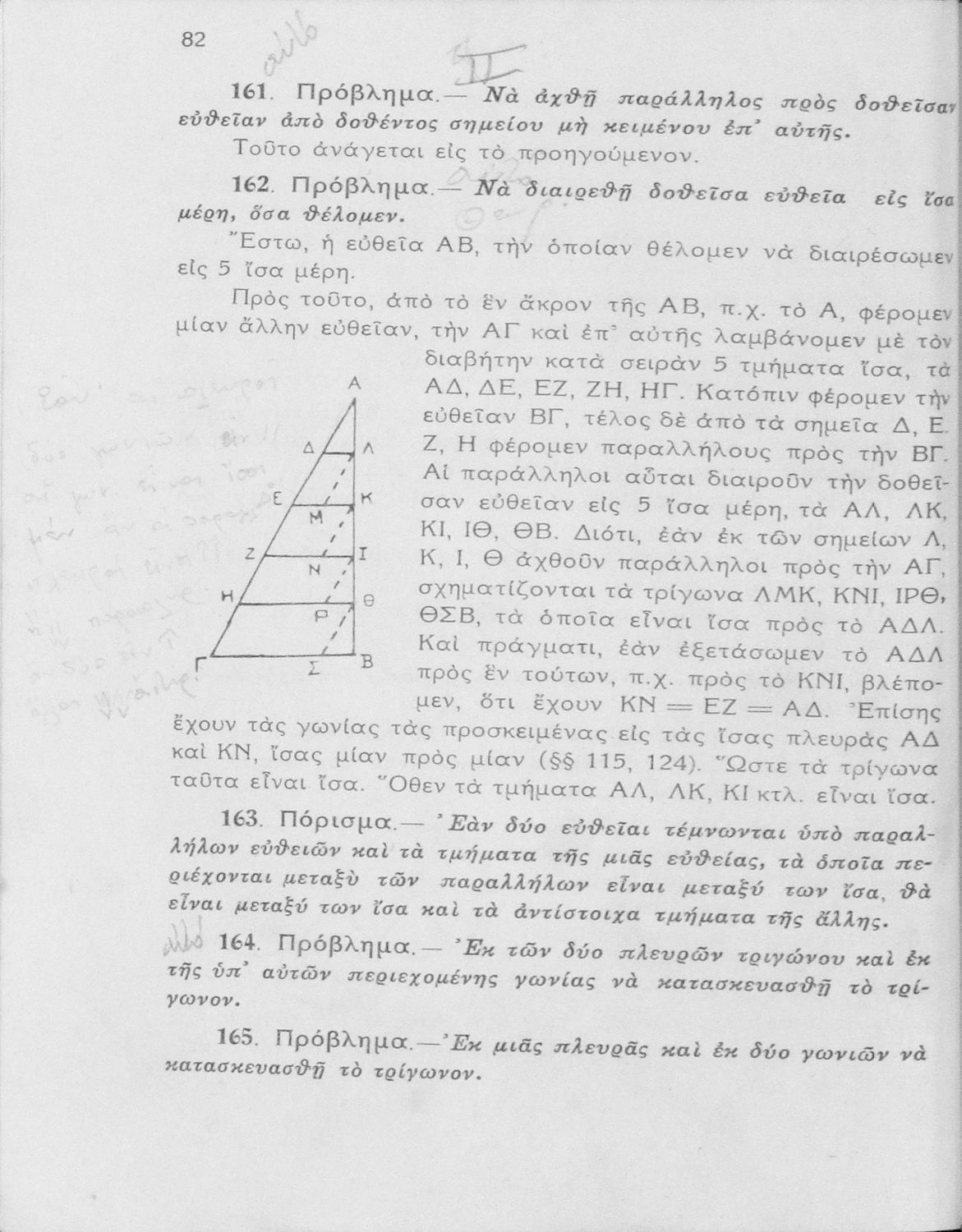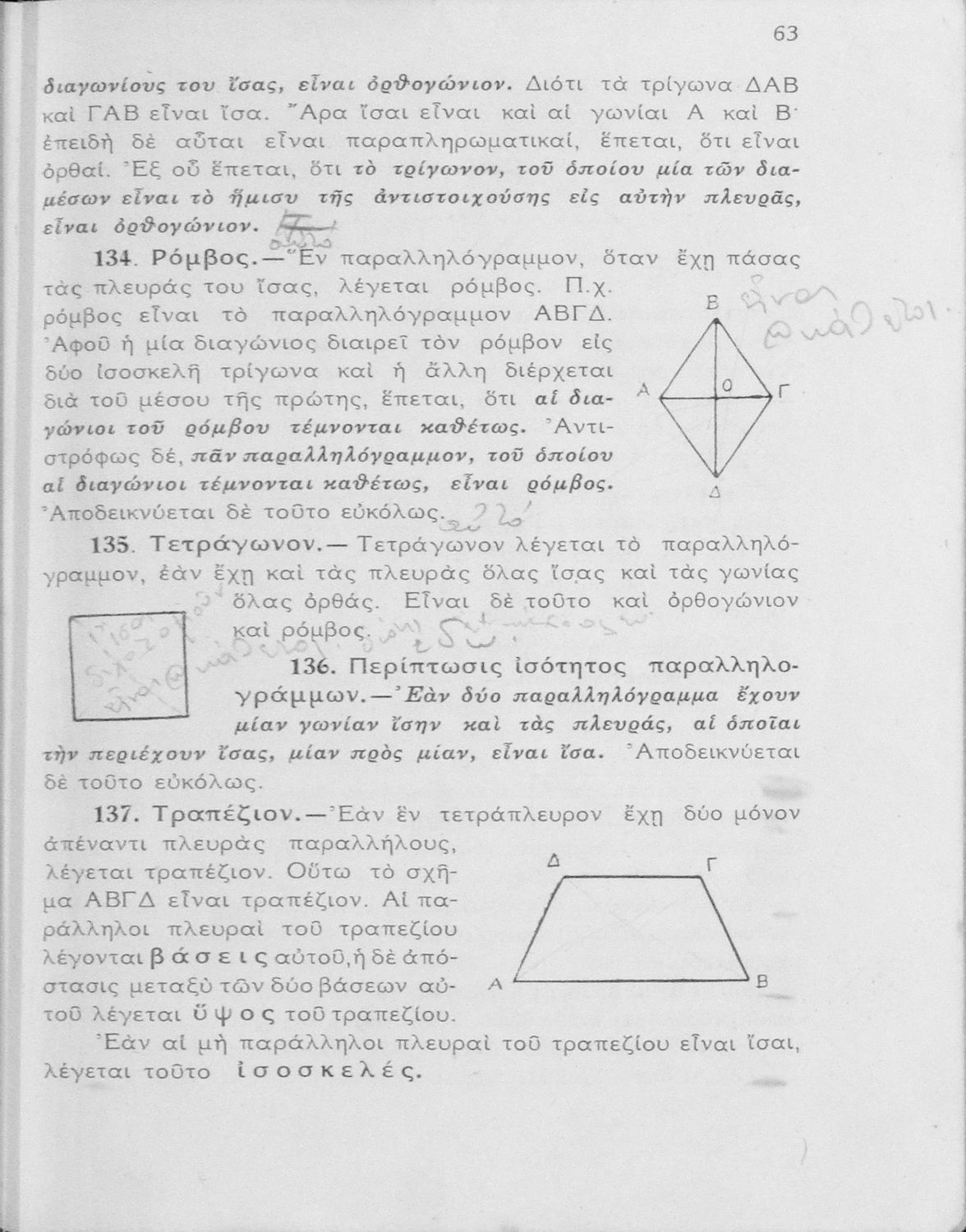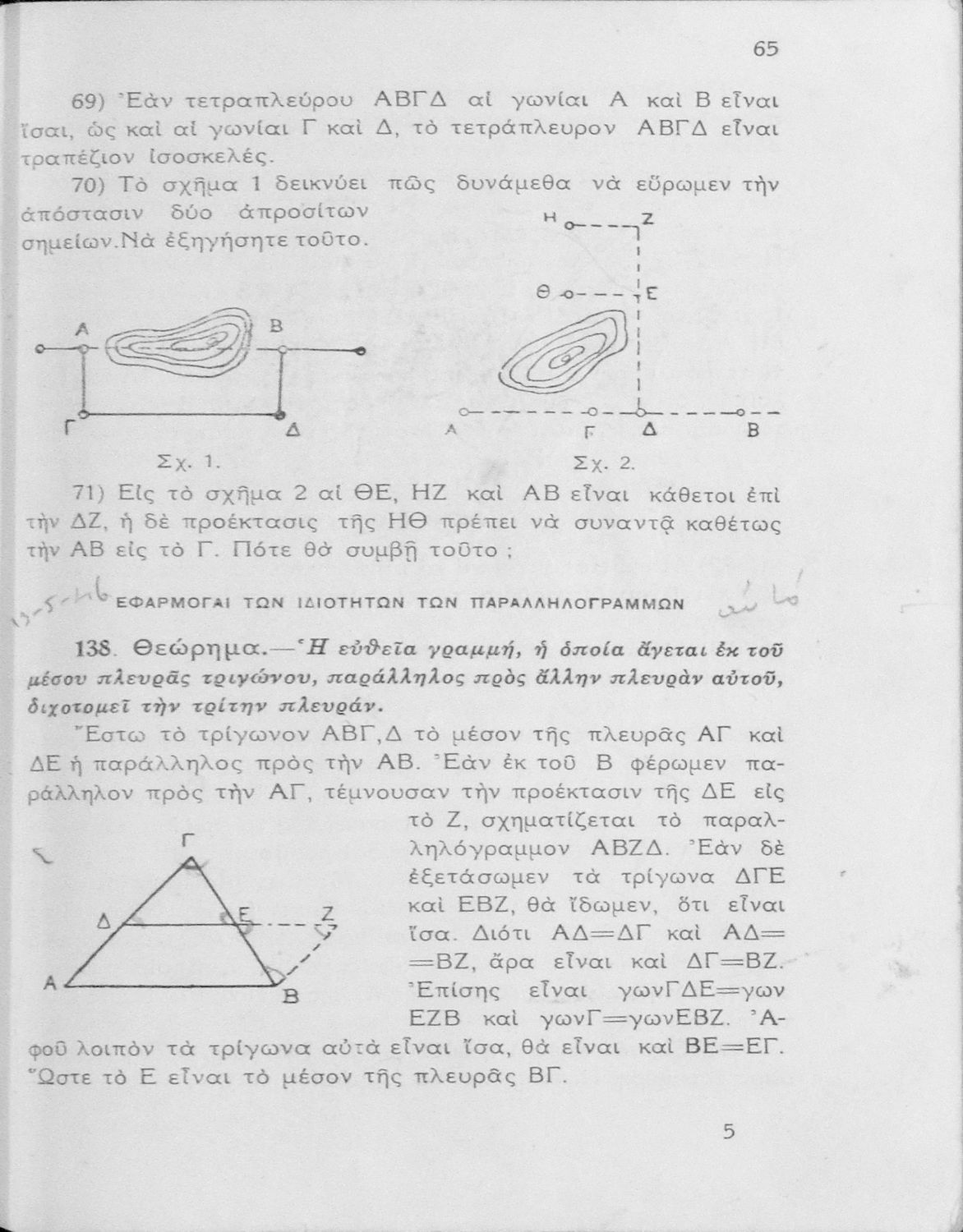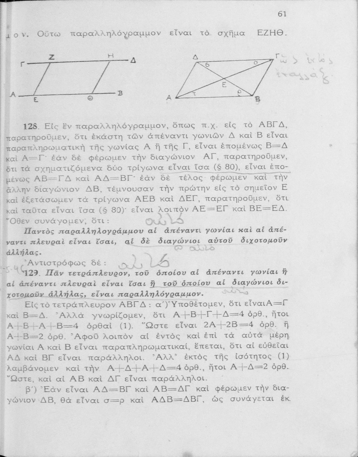 Σχολικό εγχειρίδιο Γεωμετρίας Γυμνασίου που είναι χωρισμένο σε θεωρήματα και ασκήσεις και εστιάζει στα βασικά θεωρήματα και ιδιότητες των γεωμετρικών σχημάτων. .