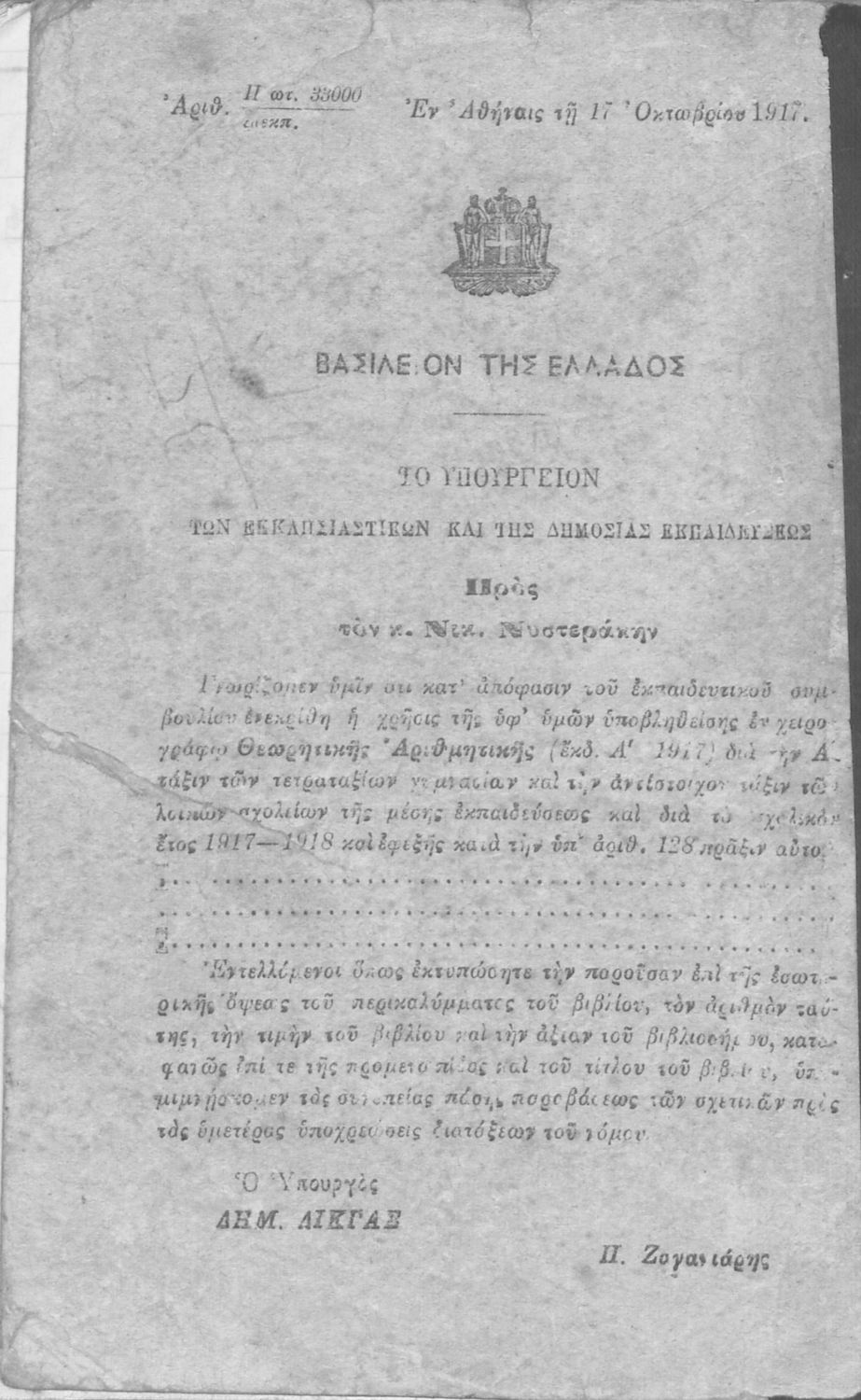 Τίτλος: Θεωρητική αριθμητική προς χρήσιν της Α΄ τάξεως των Τετραταξίων Γυμνασίων και της αντιστοίχου τάξεως των λοιπών σχολείων
