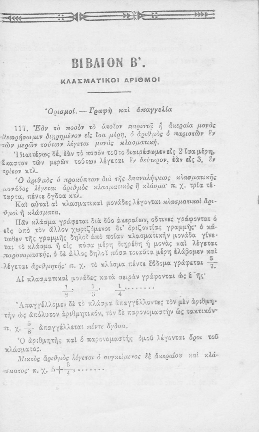 Βαθμίδα εκπαίδευσης: Δευτεροβάθμια Τάξη: Α' Γυμνασίου Μάθημα: Μαθηματικά Γλώσσα: Απλή καθαρεύουσα Παρουσίαση περιεχομένου: Σχολικό εγχειρίδιο Αριθμητικής για την Α΄ Τετραταξίου Γυμνασίου που εστιάζει στις αριθμητικές πράξεις με ακέραιους αριθμούς και κλάσματα και είναι χωρισμένο σε ορισμούς, θεωρήματα και ασκήσεις. |