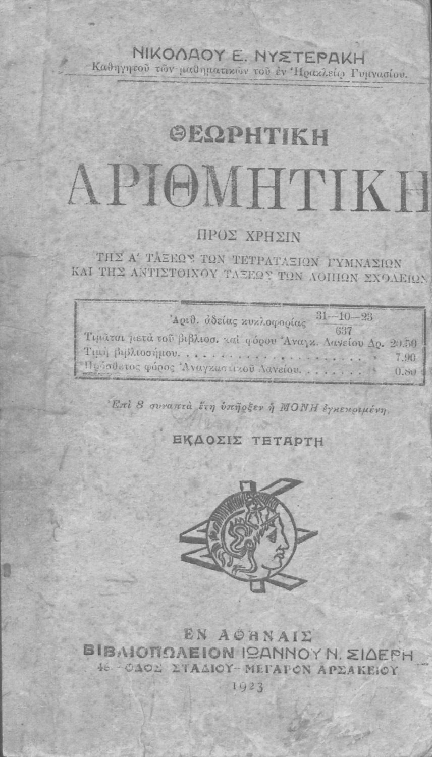 Κωδικός αναγνώρισης: 01-18144 Τίτλος: Θεωρητική αριθμητική προς χρήσιν της Α΄ τάξεως των Τετραταξίων Γυμνασίων και της αντιστοίχου τάξεως των λοιπών σχολείων Συγγραφέας: Νικόλαος Ε. Νυστεράκης Μέγεθος και υπόστρωμα: Σχολικό εγχειρίδιο, 20εκ., σκληρό εξώφυλλο, 192 σελίδες. |