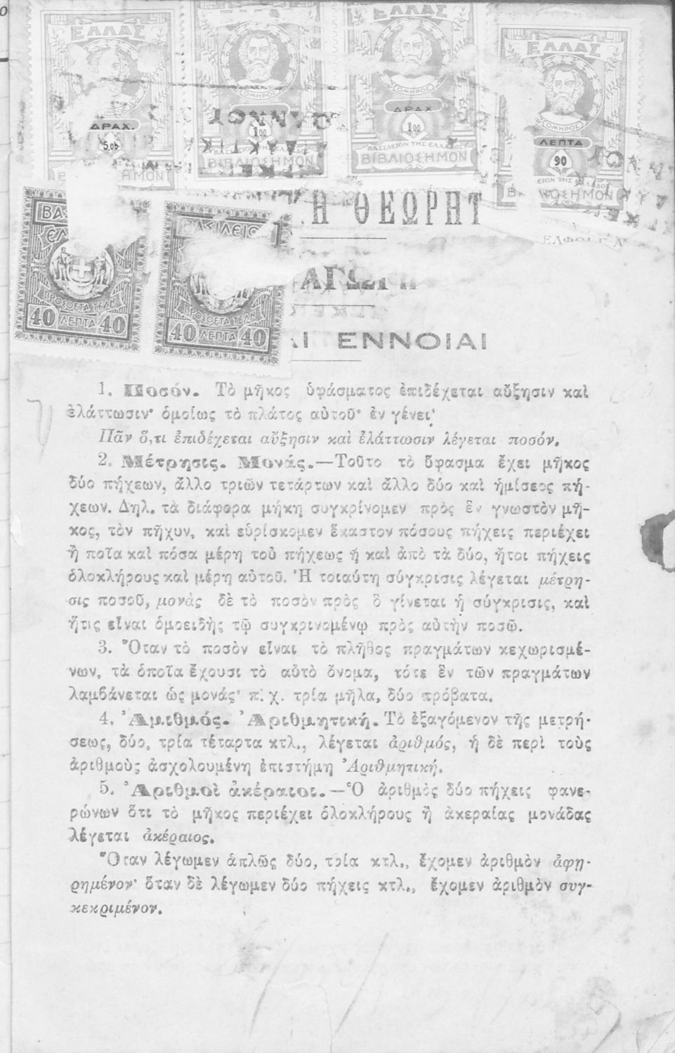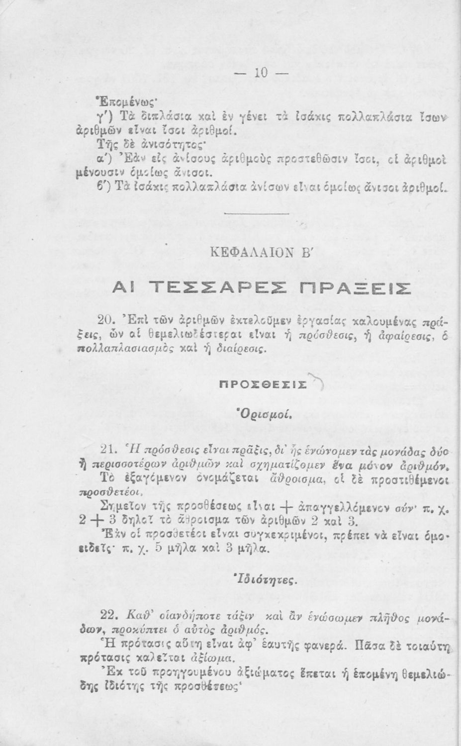 Βαθμίδα εκπαίδευσης: Δευτεροβάθμια Τάξη: Α' Γυμνασίου Μάθημα: Μαθηματικά Γλώσσα: Απλή καθαρεύουσα Παρουσίαση περιεχομένου: Σχολικό εγχειρίδιο Αριθμητικής για την Α΄ Τετραταξίου Γυμνασίου που εστιάζει στις αριθμητικές πράξεις με ακέραιους αριθμούς και κλάσματα και είναι χωρισμένο σε ορισμούς, θεωρήματα και ασκήσεις. |