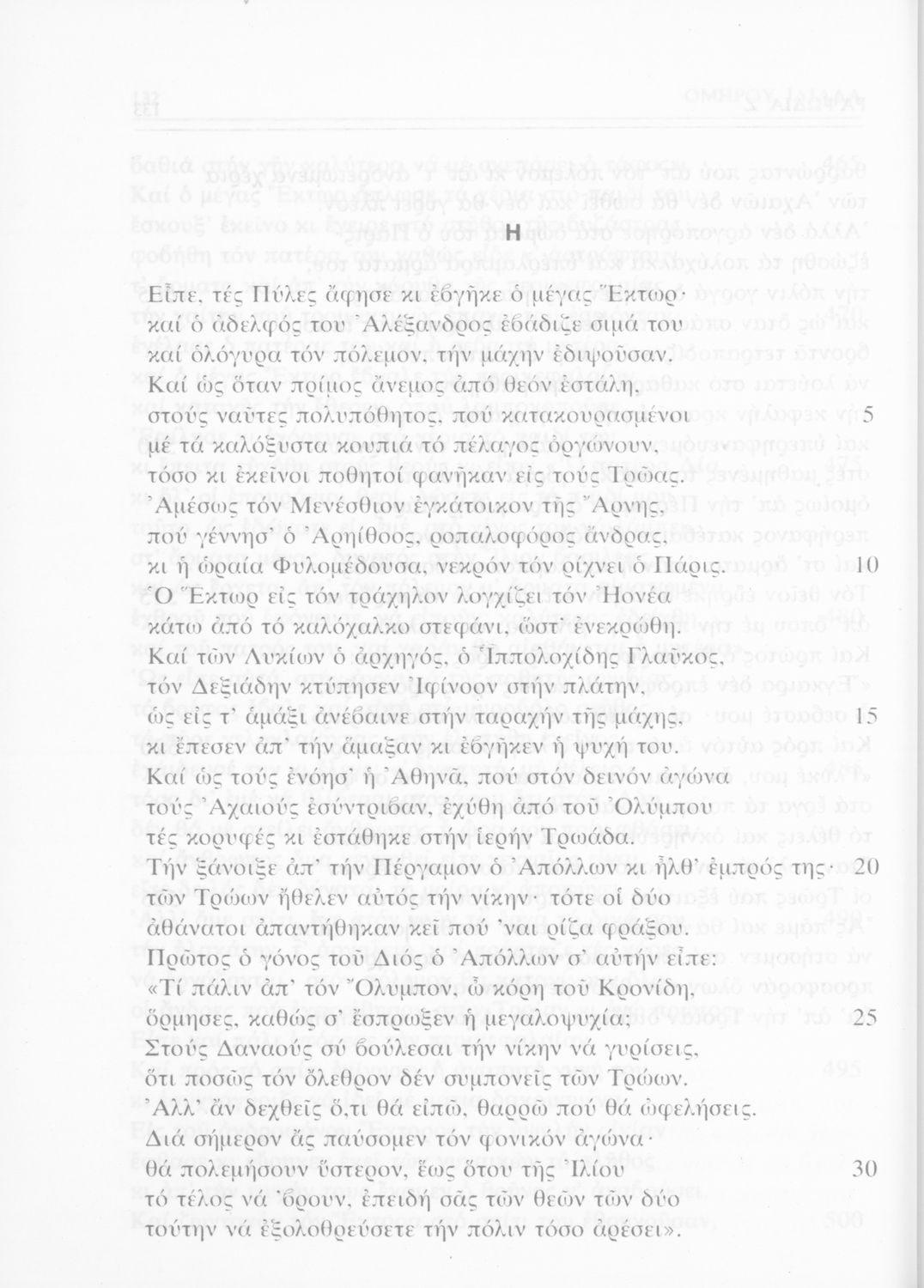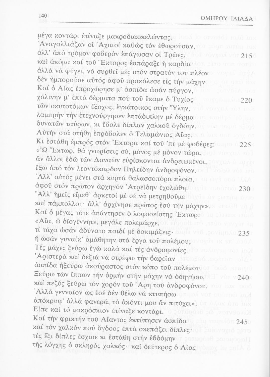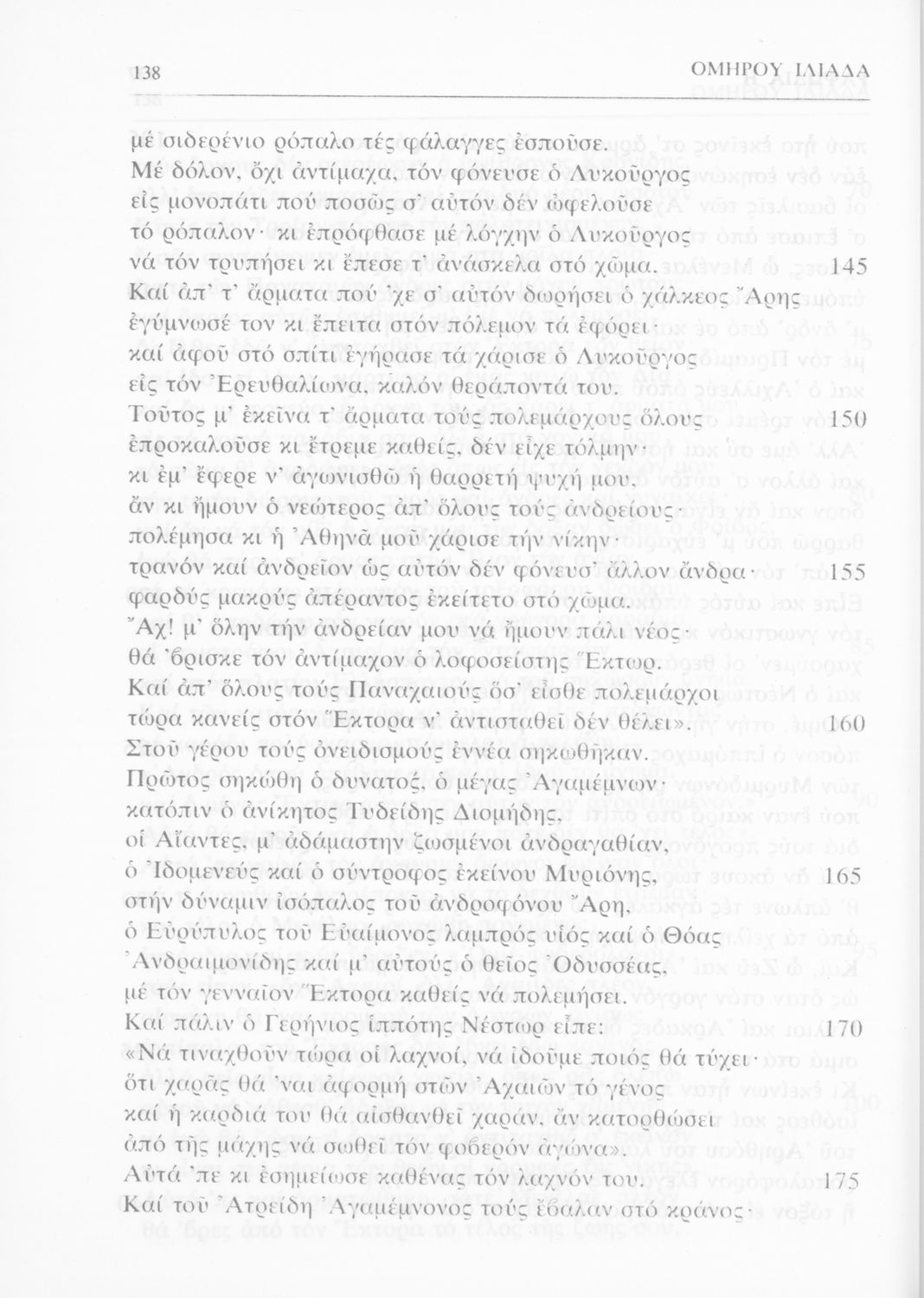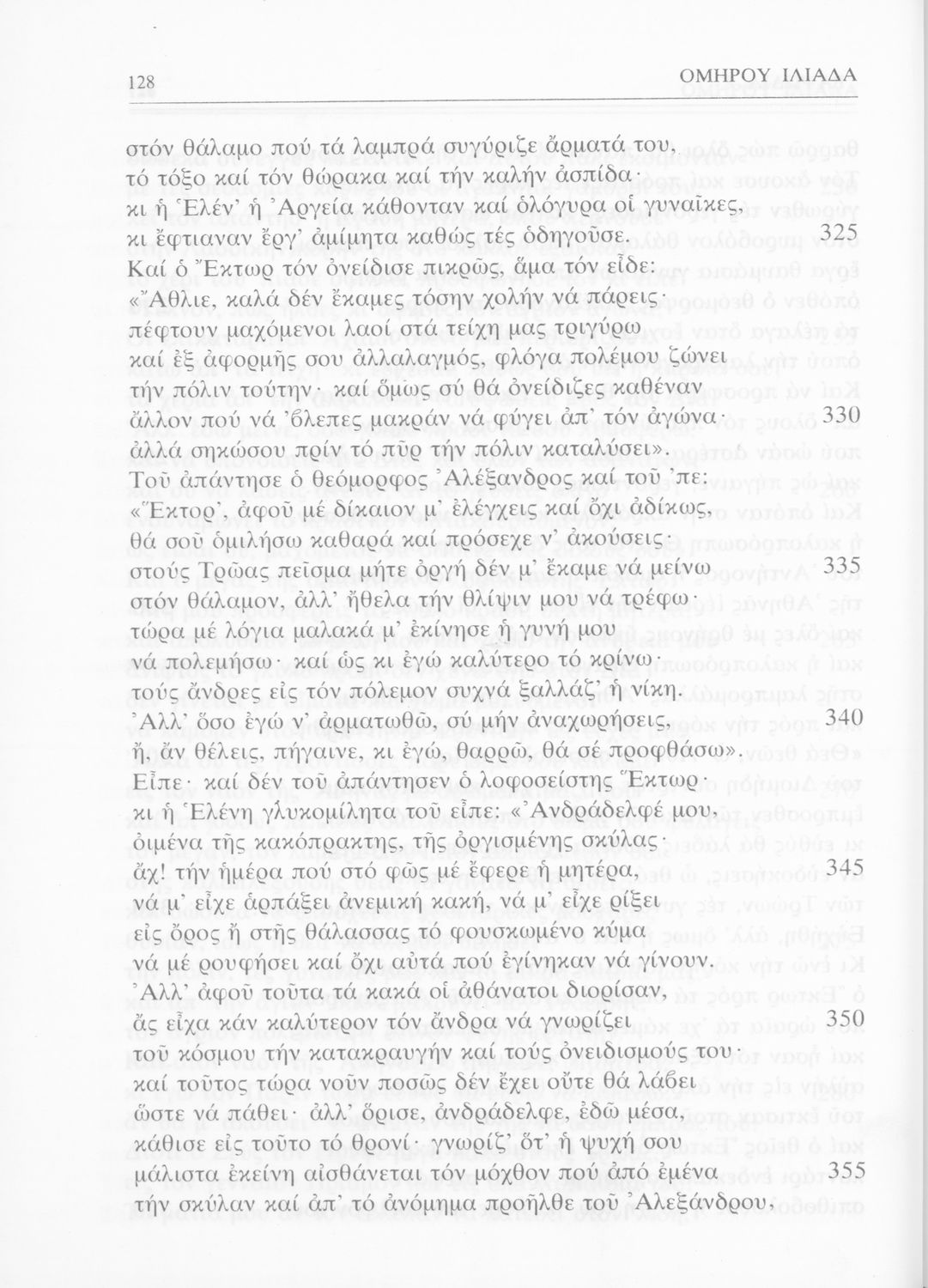 Σχολικό εγχειρίδιο της Δευτεροβάθμιας Εκπαίδευσης για το μάθημα των Αρχαίων Ελληνικών. Πρόκειται για το κείμενο της Ιλιάδας μεταφρασμένο, με πραγματολογικές παρατηρήσεις. Στο τέλος περιλαμβάνει λεξιλόγιο.