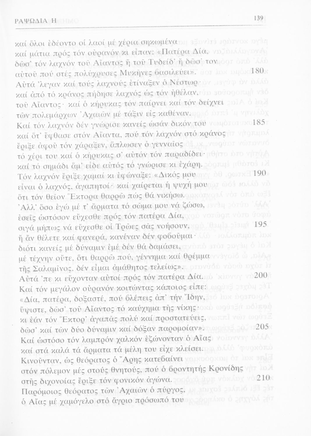 Σχολικό εγχειρίδιο Ε' Γυμνασίου για το μάθημα των Αρχαίων Ελληνικών. Περιλαμβάνει αποσπάσματα από ραψωδίες της Ιλιάδας, ερμηνευτικά και πραγματολογικά σχόλια και λεξιλογικές παρατηρήσεις.