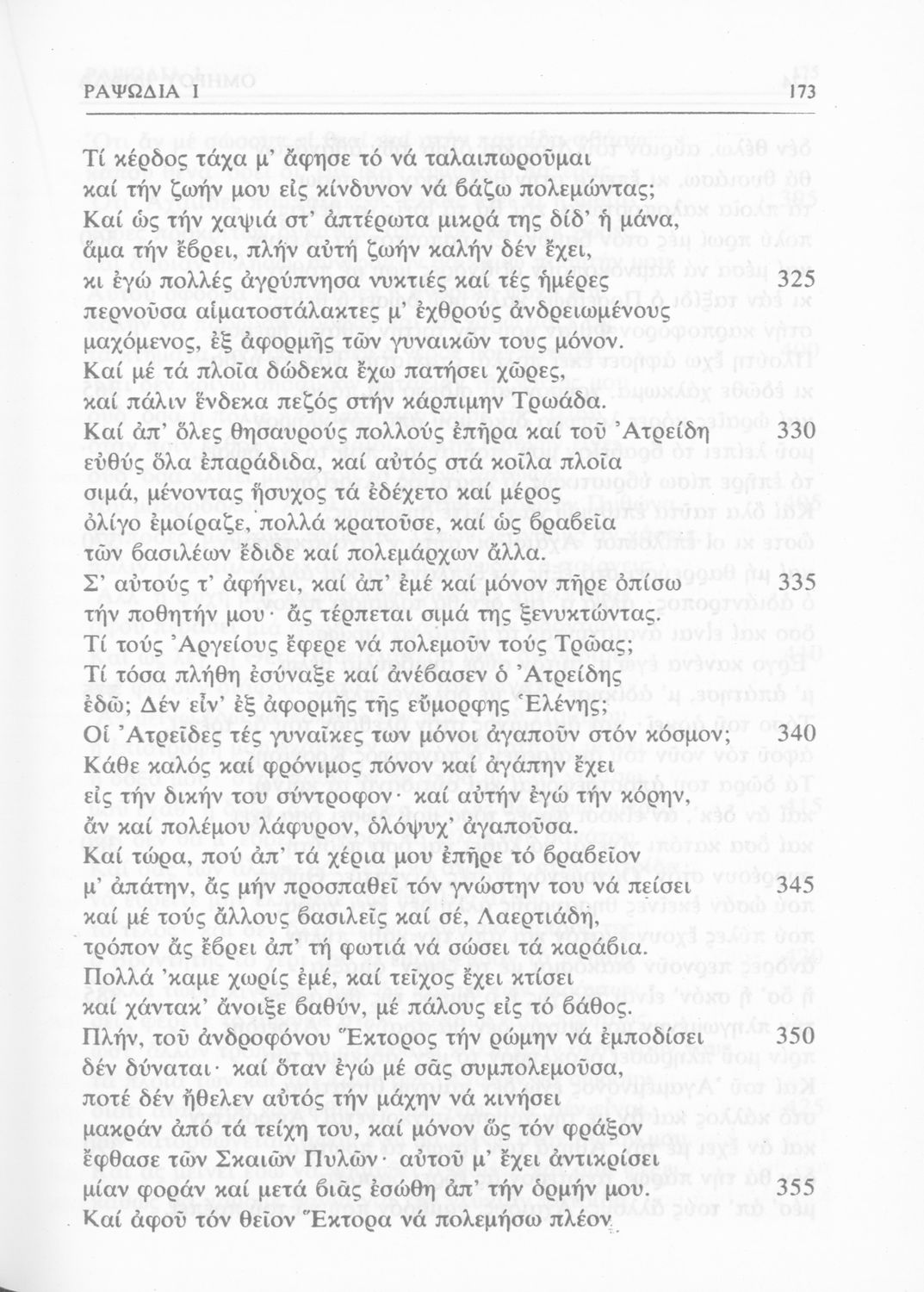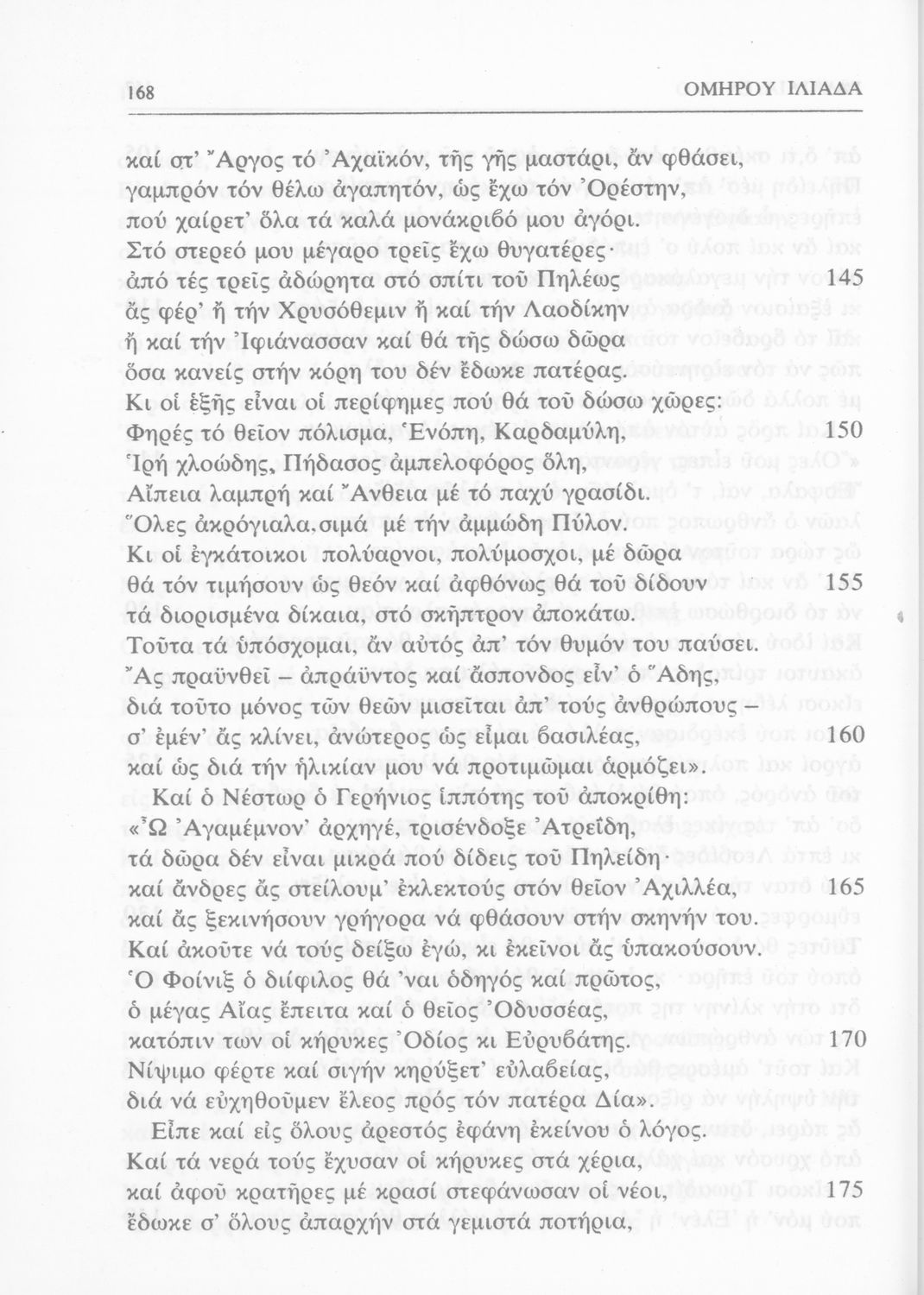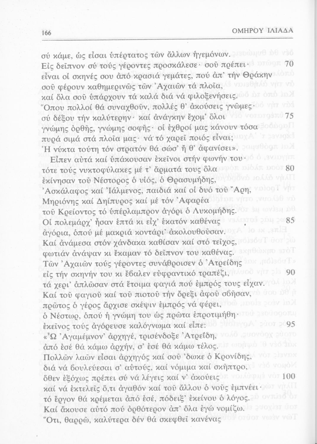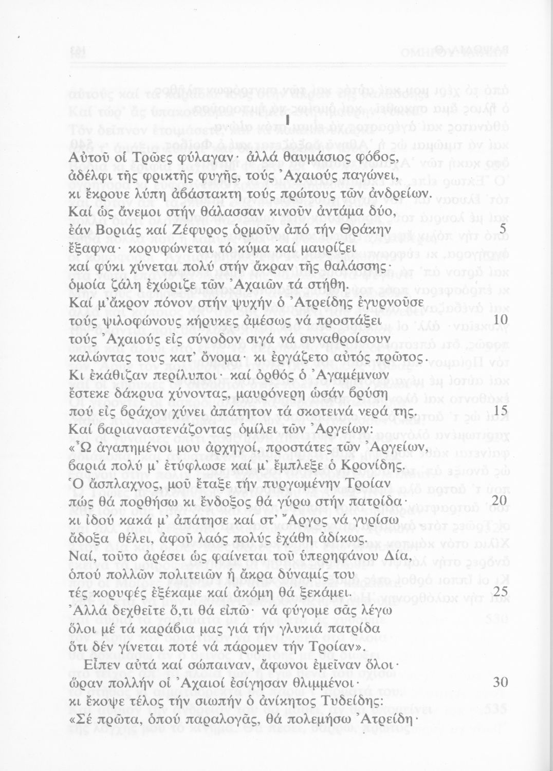 Σχολικό εγχειρίδιο της Δευτεροβάθμιας Εκπαίδευσης για το μάθημα των Αρχαίων Ελληνικών. Πρόκειται για το κείμενο της Ιλιάδας μεταφρασμένο, με πραγματολογικές παρατηρήσεις. Στο τέλος περιλαμβάνει λεξιλόγιο.