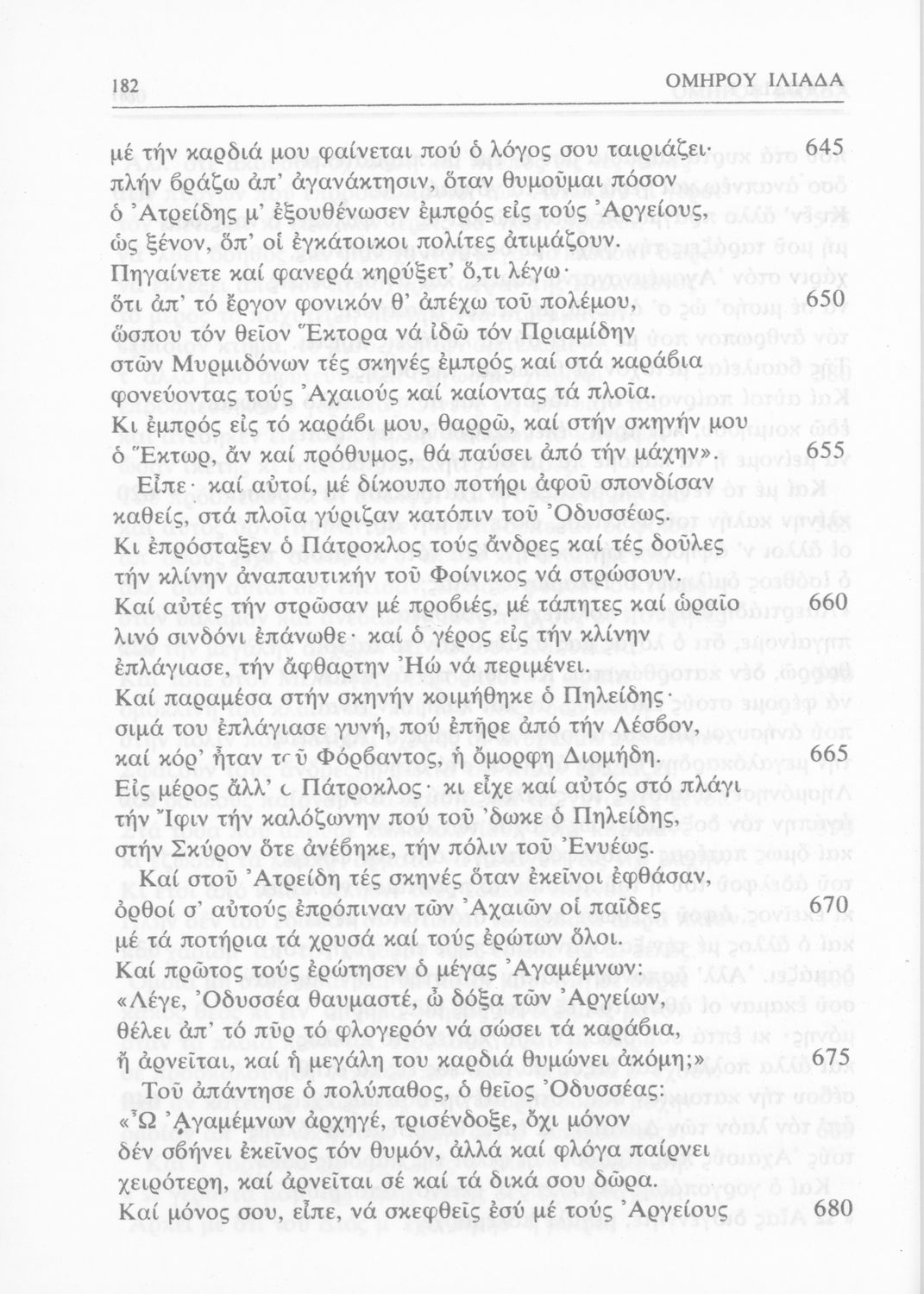 Σχολικό εγχειρίδιο Αρχαίων Ελληνικών. Το βιβλίο περιλαμβάνει εισαγωγή σχετικά με τις διαφορές Οδύσσειας και Ιλιάδας, το περιεχόμενο της Ιλιάδας, το ομηρικό πρόβλημα και την επίδραση των ομηρικών επών στον Ελληνικό και Δυτικό πολιτισμό. Ακολουθεί η Ιλιάδα του Ομήρου σε μετάφραση του Ιάκωβου Πολυλά και σχετικά σχόλια. Η εισαγωγή και τα ερμηνευτικά σχόλια έγιναν από την Ελένη Ι. Κακριδή.
