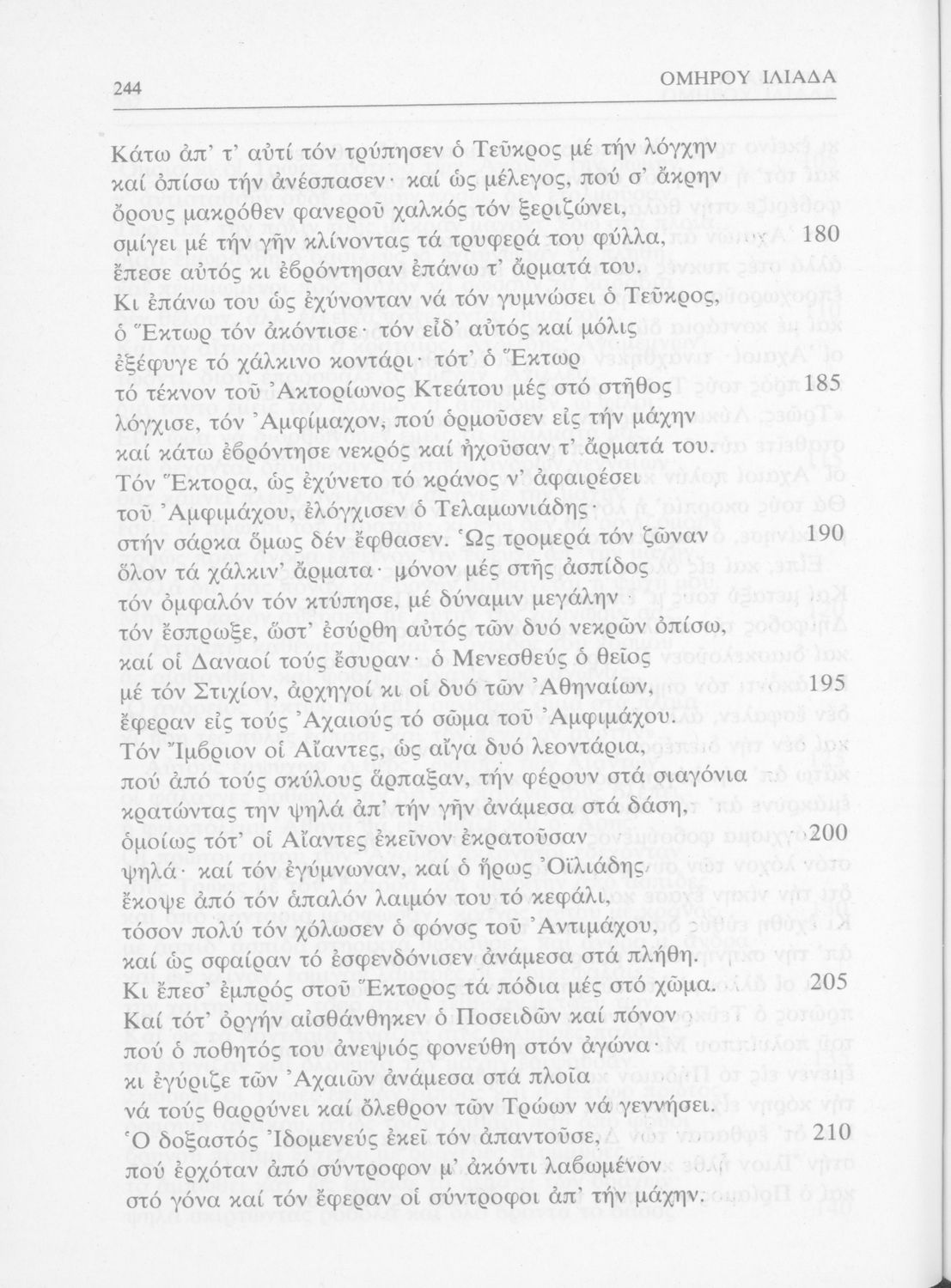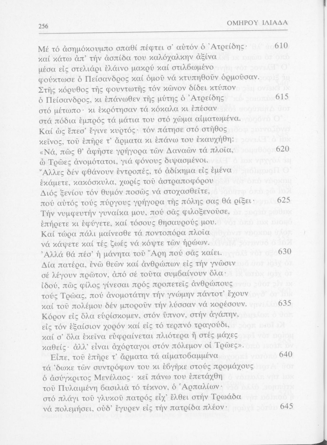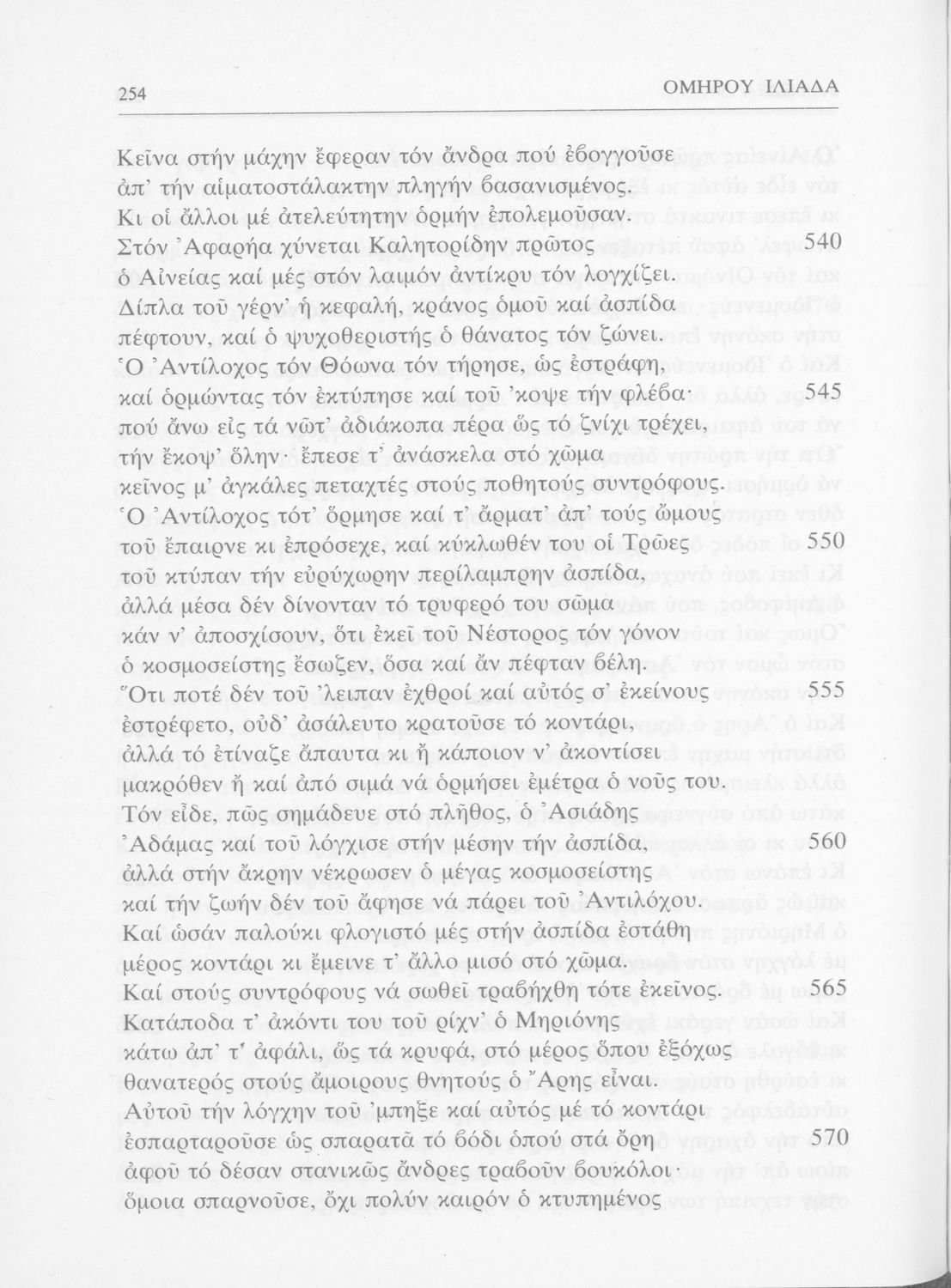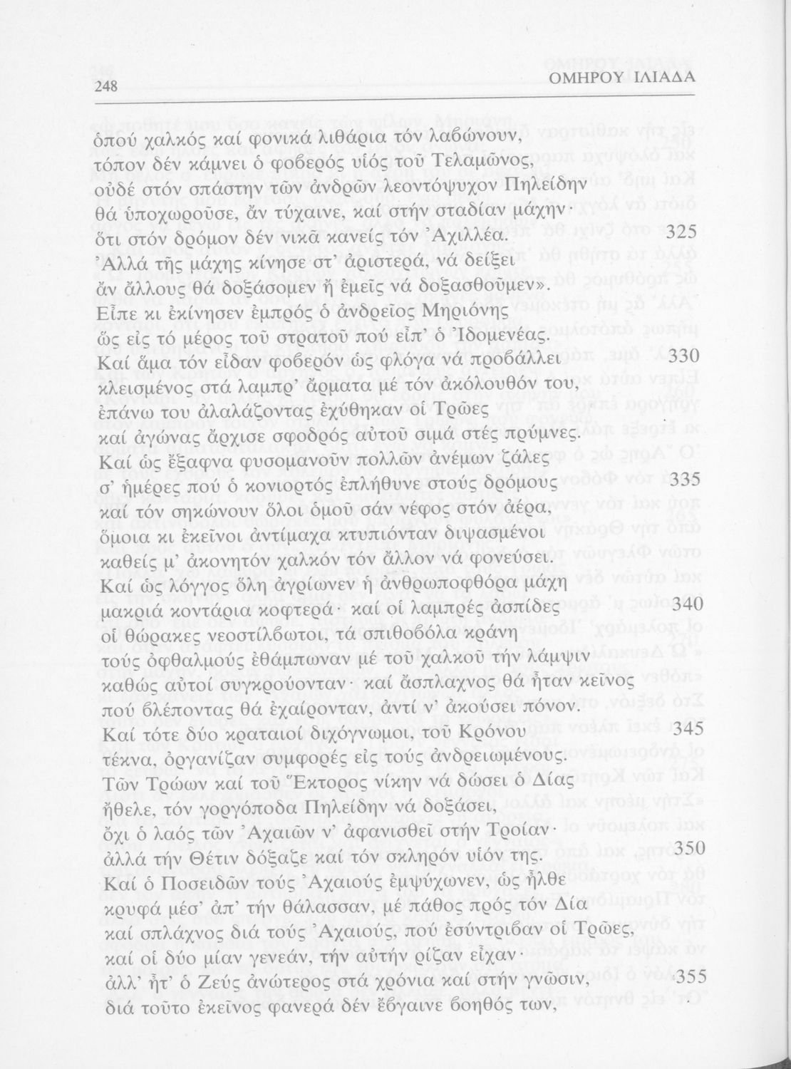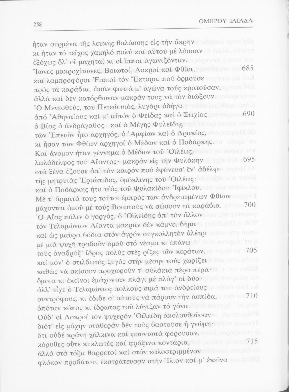 Σχολικό εγχειρίδιο Αρχαίων Ελληνικών. Το βιβλίο περιλαμβάνει εισαγωγή σχετικά με τις διαφορές Οδύσσειας και Ιλιάδας, το περιεχόμενο της Ιλιάδας, το ομηρικό πρόβλημα και την επίδραση των ομηρικών επών στον Ελληνικό και Δυτικό πολιτισμό. Ακολουθεί η Ιλιάδα του Ομήρου σε μετάφραση του Ιάκωβου Πολυλά και σχετικά σχόλια. Η εισαγωγή και τα ερμηνευτικά σχόλια έγιναν από την Ελένη Ι. Κακριδή.