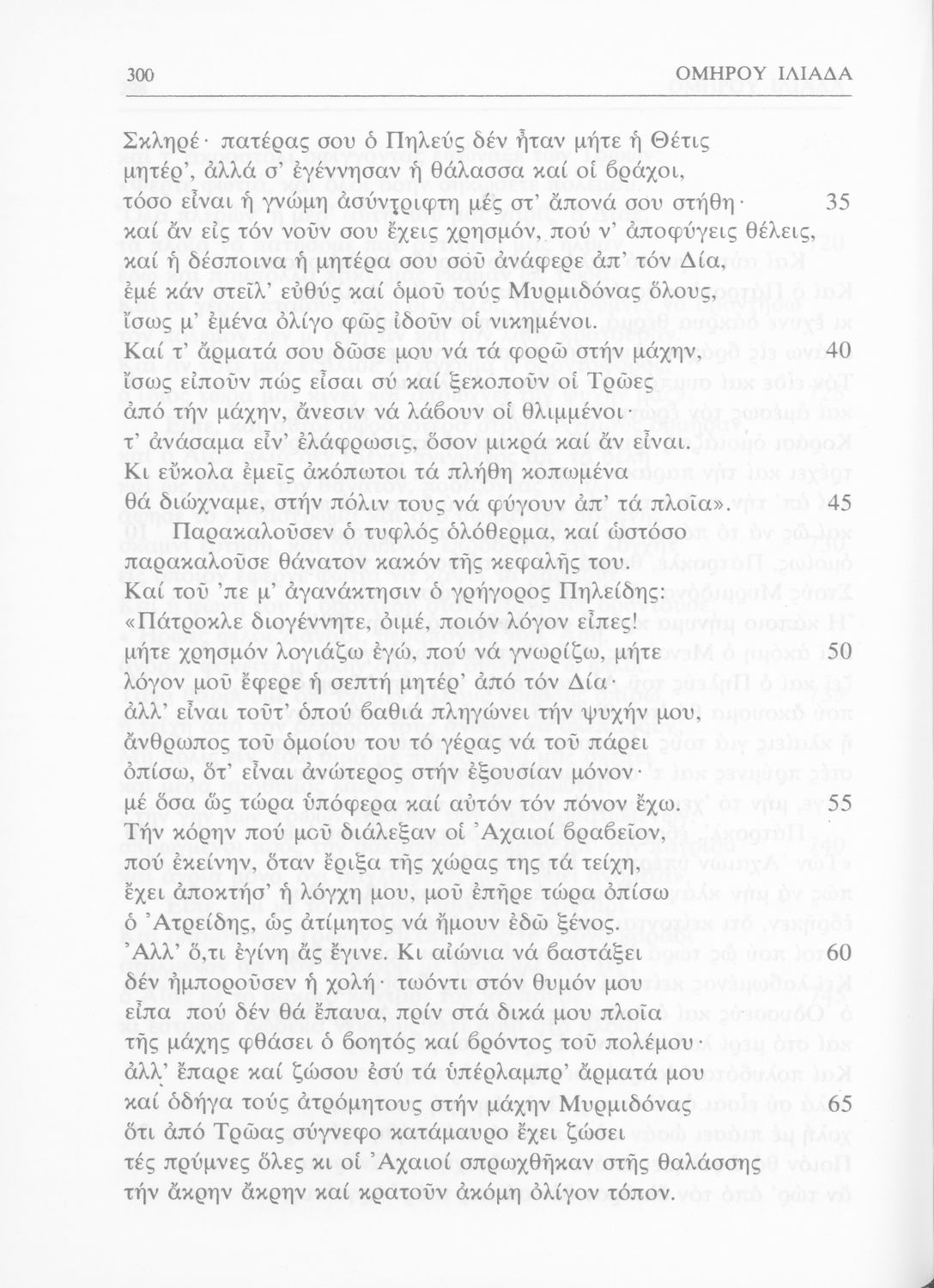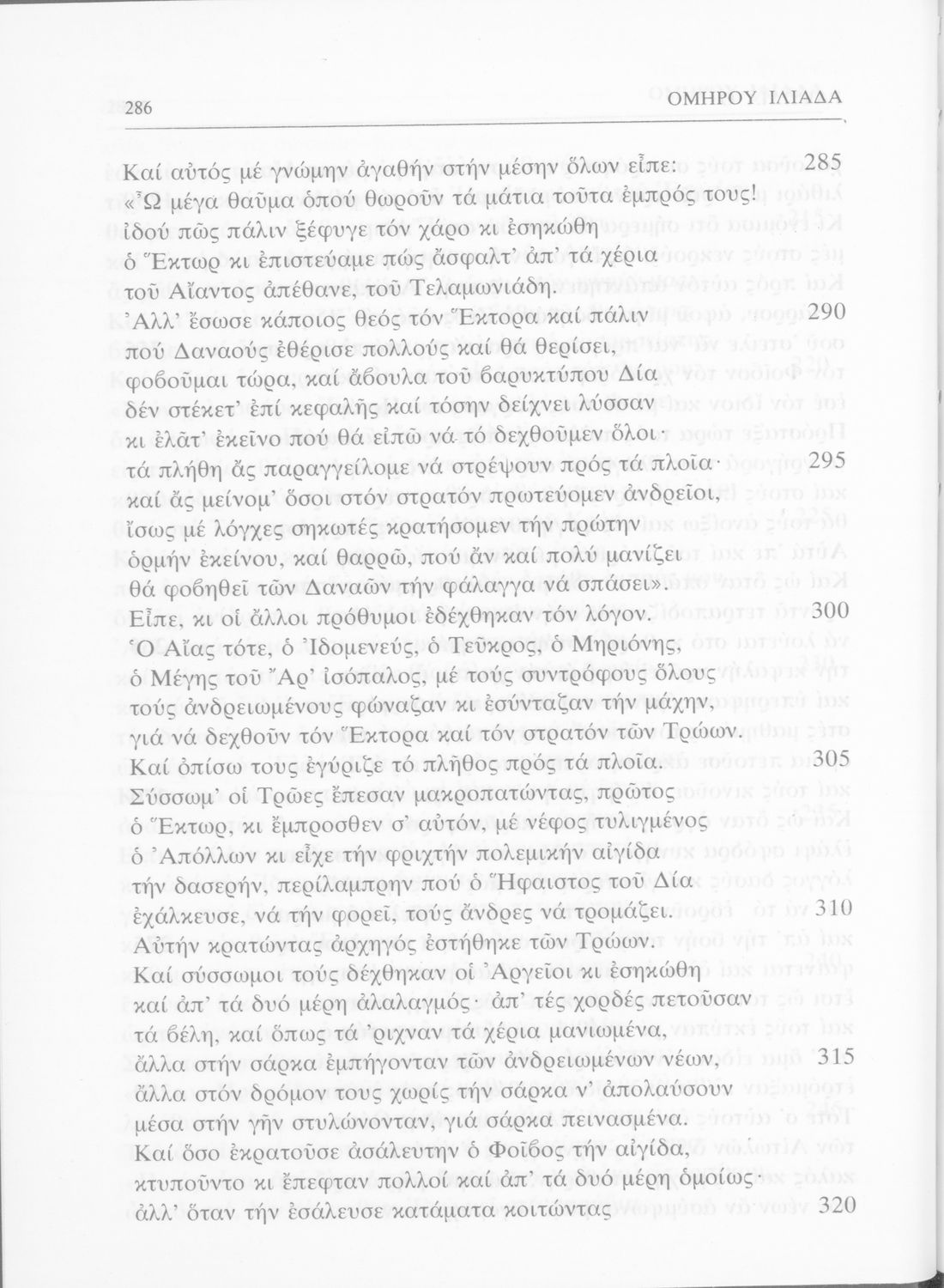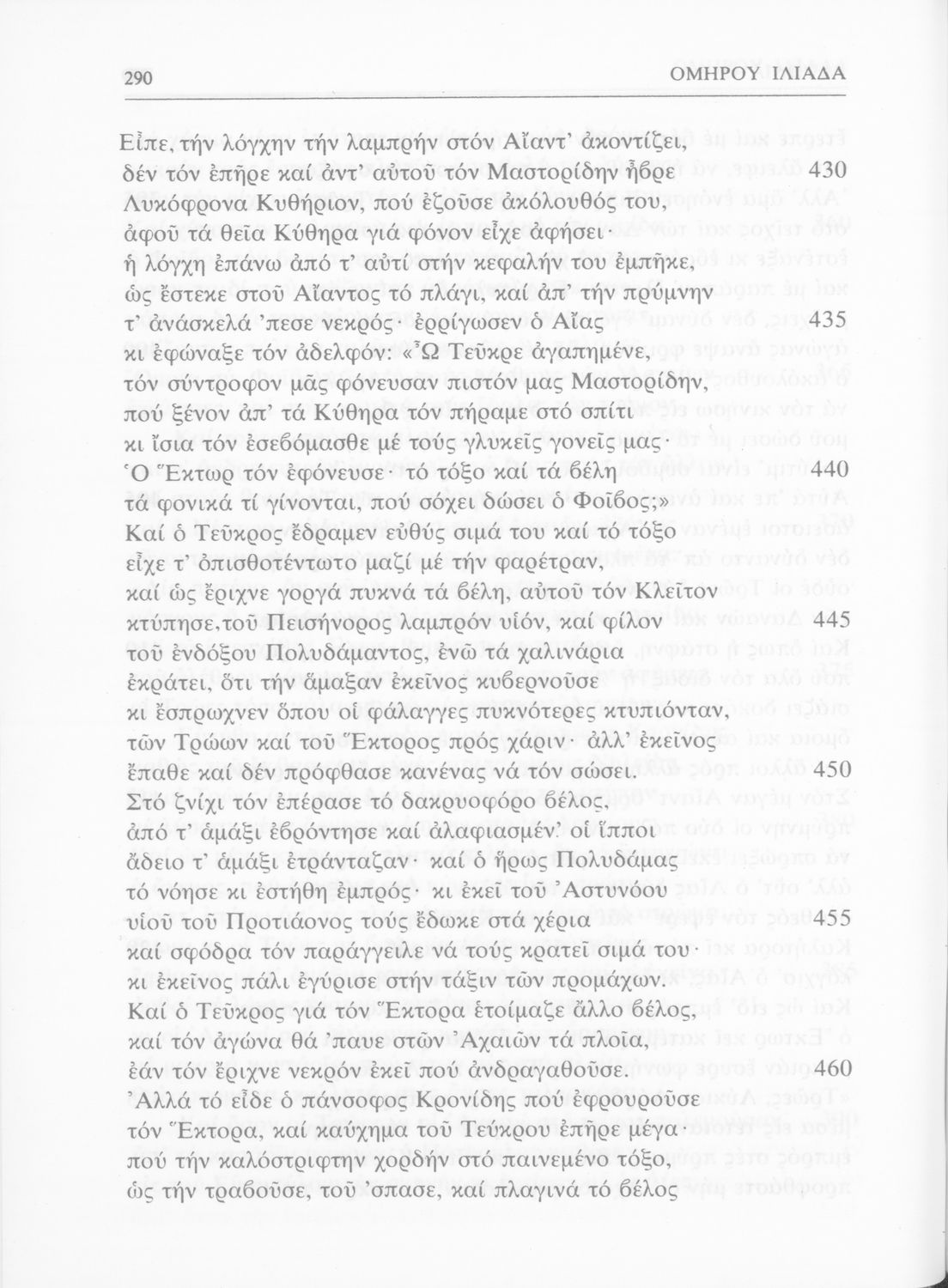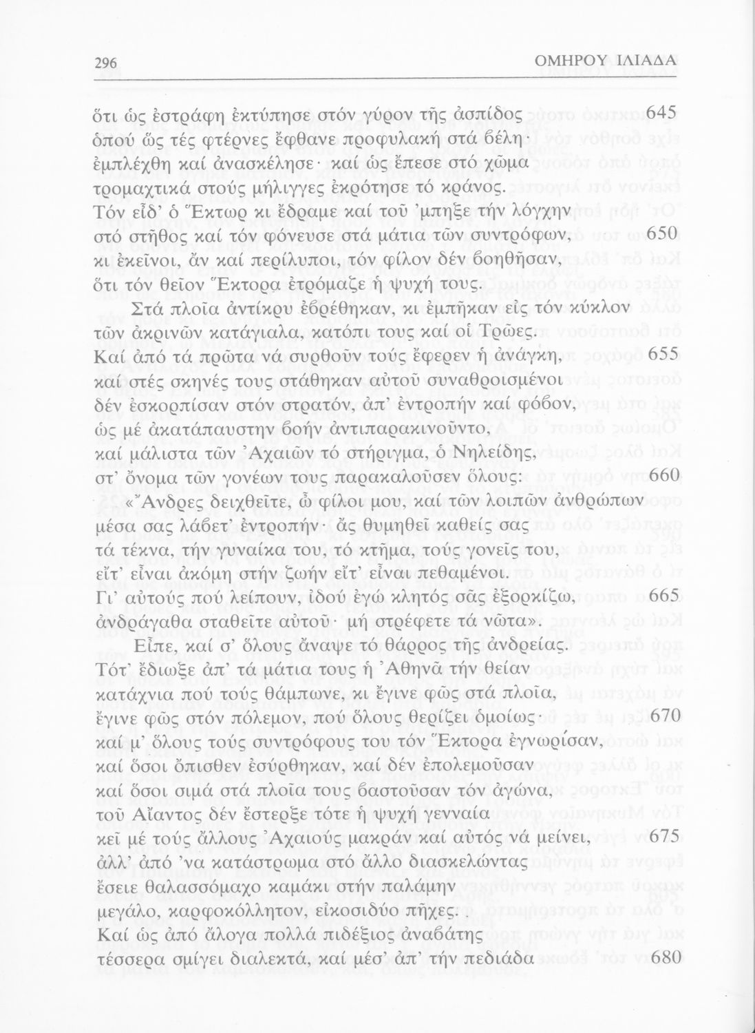 Σχολικό εγχειρίδιο της Δευτεροβάθμιας Εκπαίδευσης για το μάθημα των Αρχαίων Ελληνικών. Πρόκειται για το κείμενο της Ιλιάδας μεταφρασμένο, με πραγματολογικές παρατηρήσεις. Στο τέλος περιλαμβάνει λεξιλόγιο.