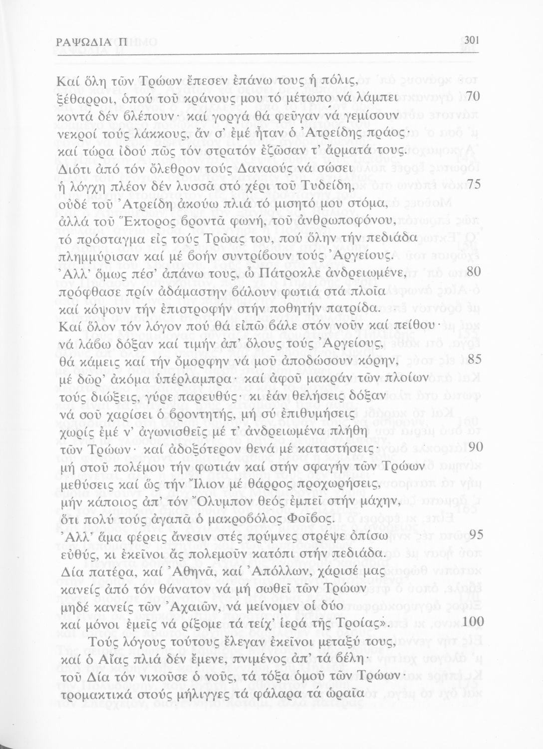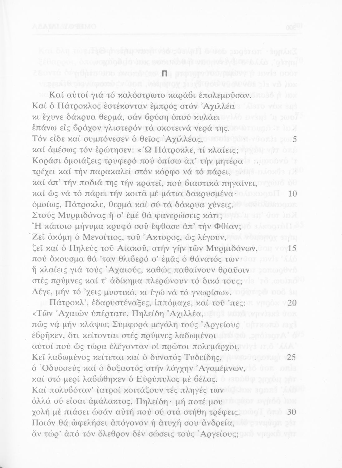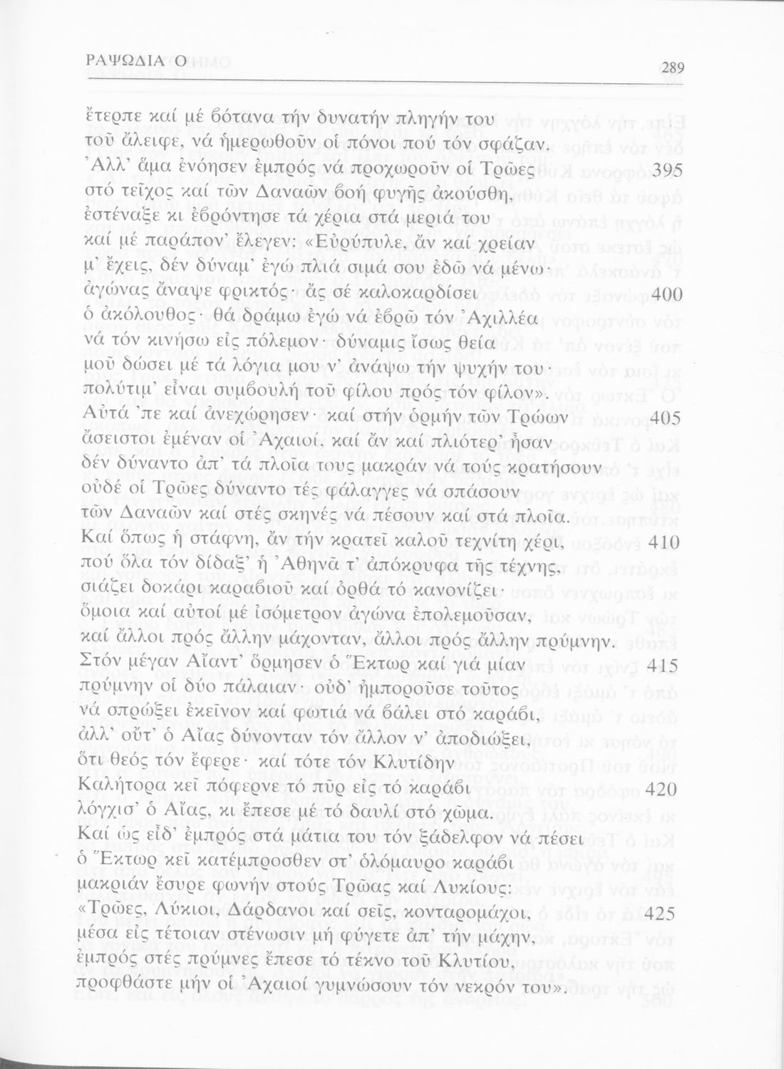 Σχολικό εγχειρίδιο της Δευτεροβάθμιας Εκπαίδευσης για το μάθημα των Αρχαίων Ελληνικών. Πρόκειται για το κείμενο της Ιλιάδας μεταφρασμένο, με πραγματολογικές παρατηρήσεις. Στο τέλος περιλαμβάνει λεξιλόγιο.
