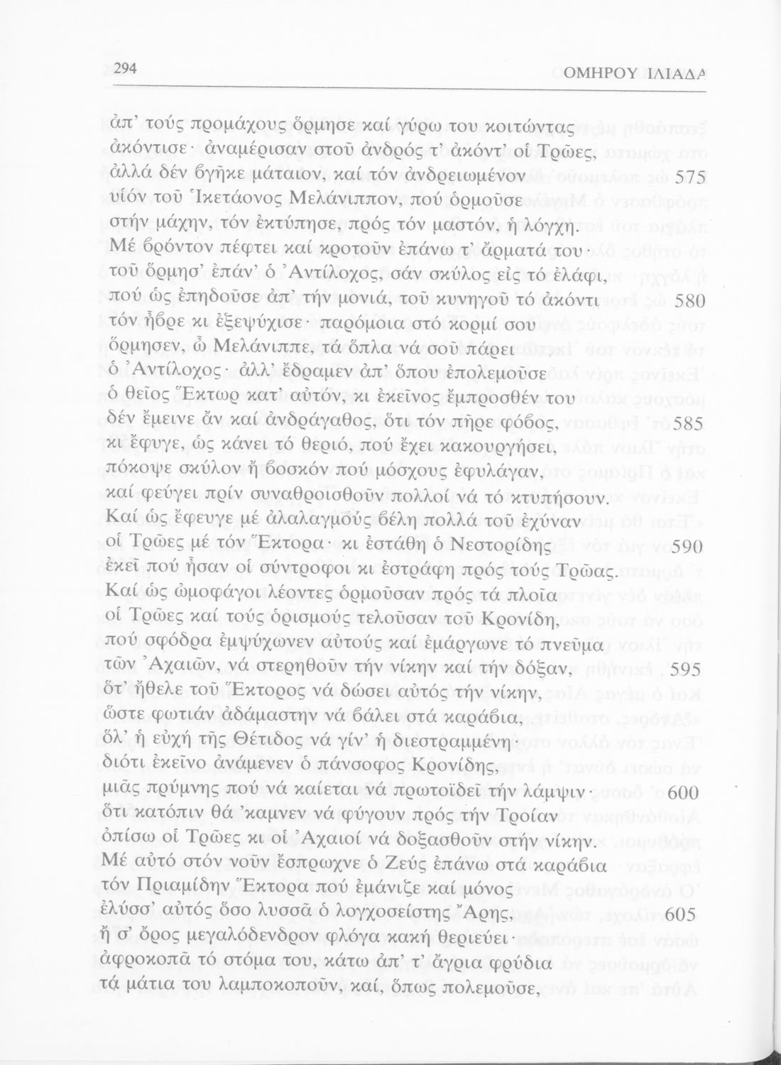 Σχολικό εγχειρίδιο Αρχαίων Ελληνικών Ε΄ Γυμνασίου που περιλαμβάνει αποσπάσματα από την Ιλιάδα, εισαγωγή και ασκήσεις. Περιέχει και παράρτημα εικόνων.
