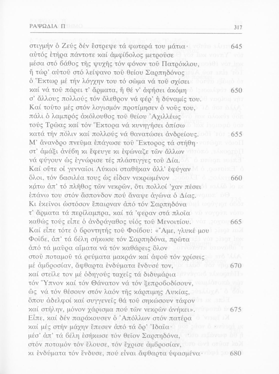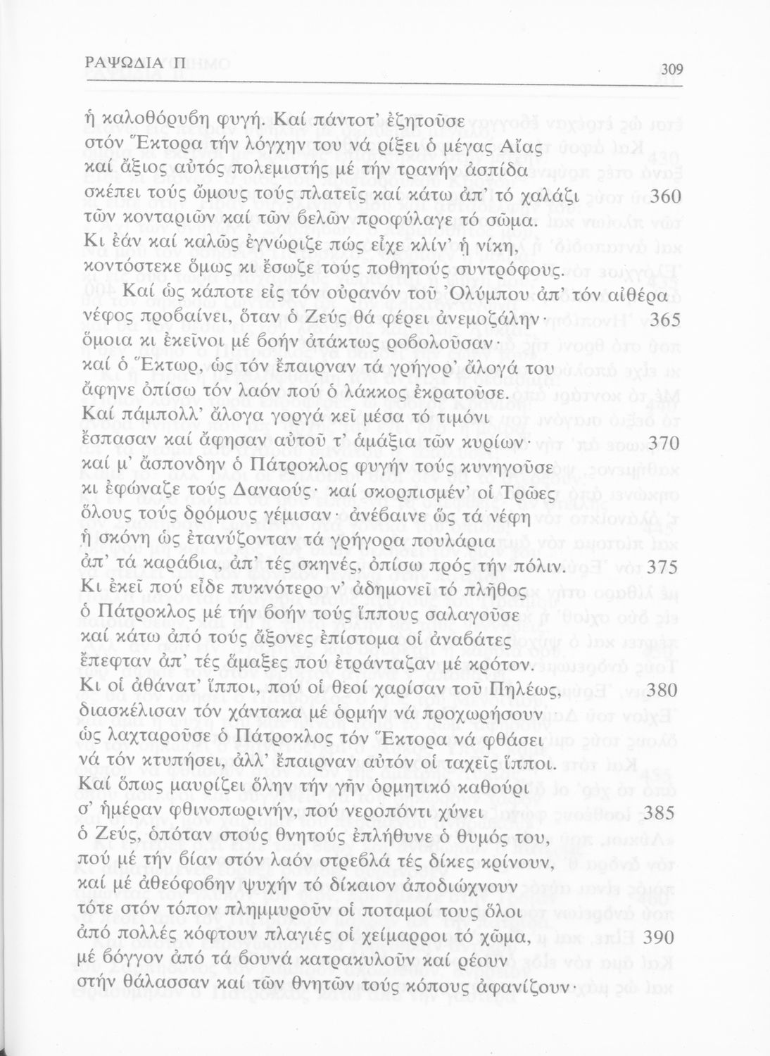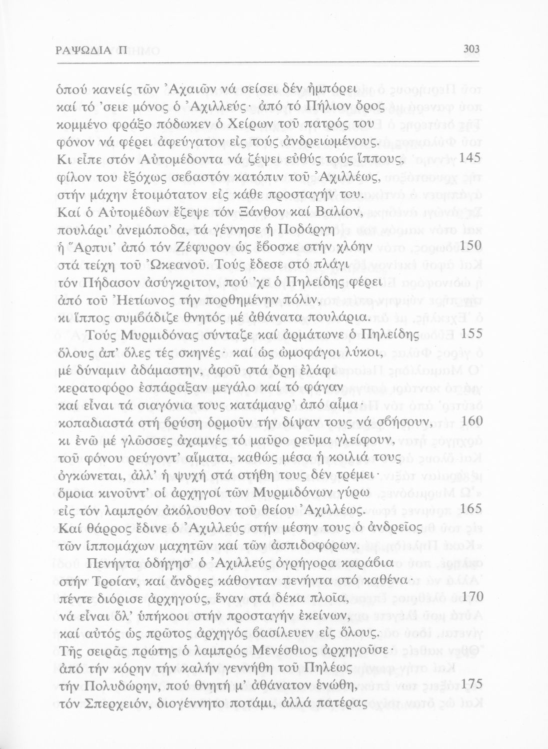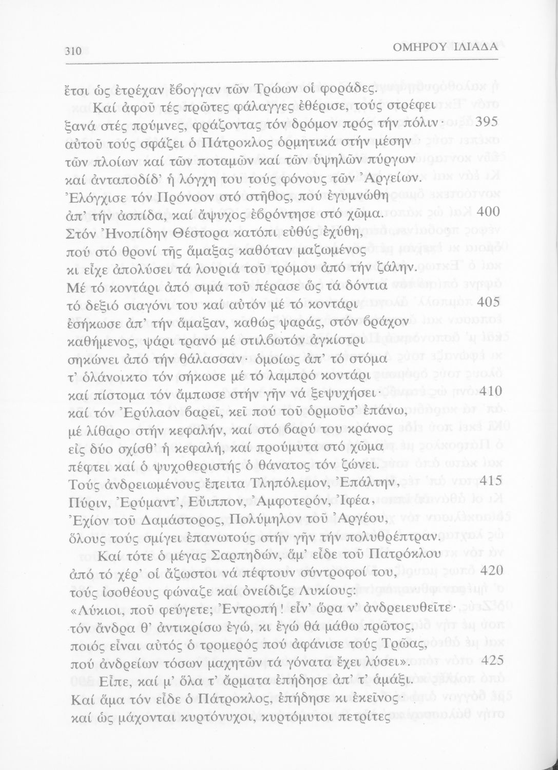 Σχολικό εγχειρίδιο Αρχαίων Ελληνικών. Το βιβλίο περιλαμβάνει εισαγωγή σχετικά με τις διαφορές Οδύσσειας και Ιλιάδας, το περιεχόμενο της Ιλιάδας, το ομηρικό πρόβλημα και την επίδραση των ομηρικών επών στον Ελληνικό και Δυτικό πολιτισμό. Ακολουθεί η Ιλιάδα του Ομήρου σε μετάφραση του Ιάκωβου Πολυλά και σχετικά σχόλια. Η εισαγωγή και τα ερμηνευτικά σχόλια έγιναν από την Ελένη Ι. Κακριδή.